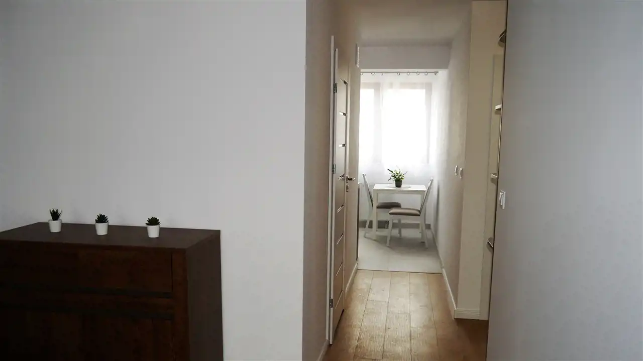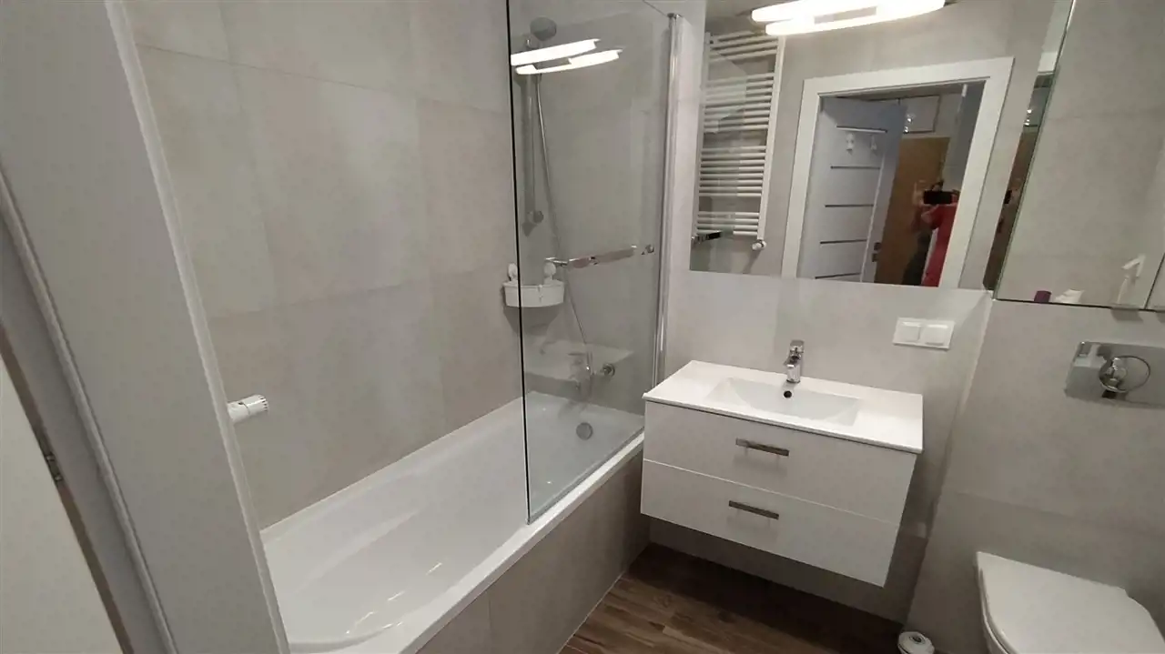 W przedpokoju zamontowana jest duża szafa w zabudowie, w łazience jest wanna z funkcją prysznica.