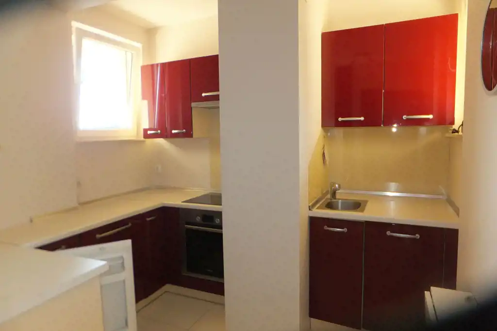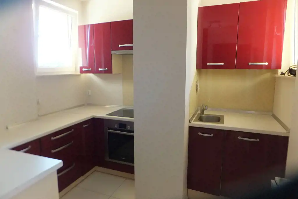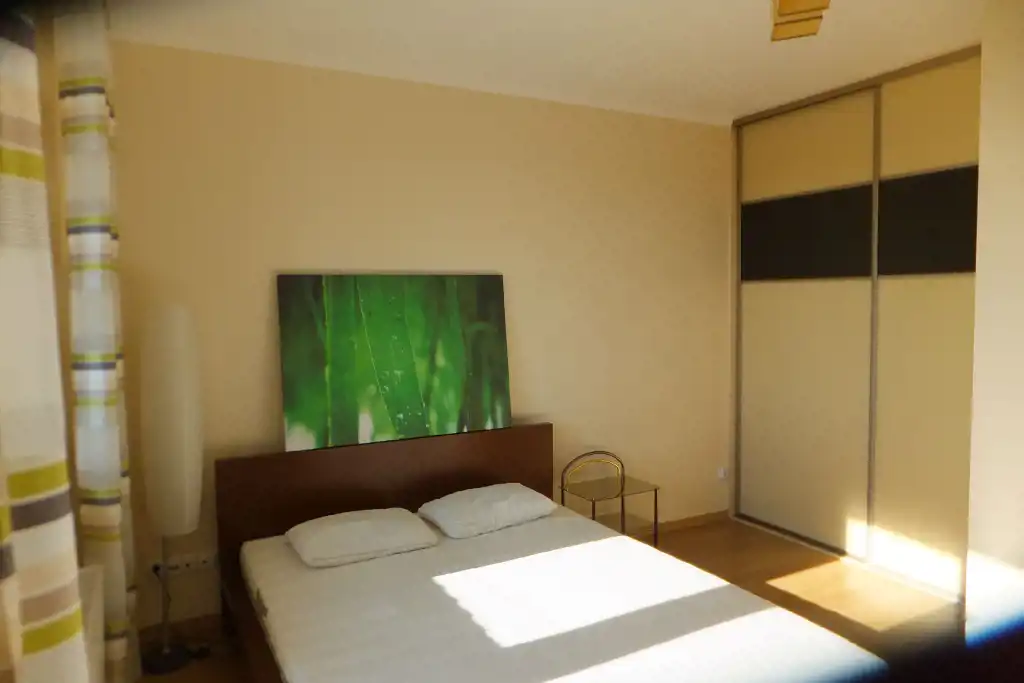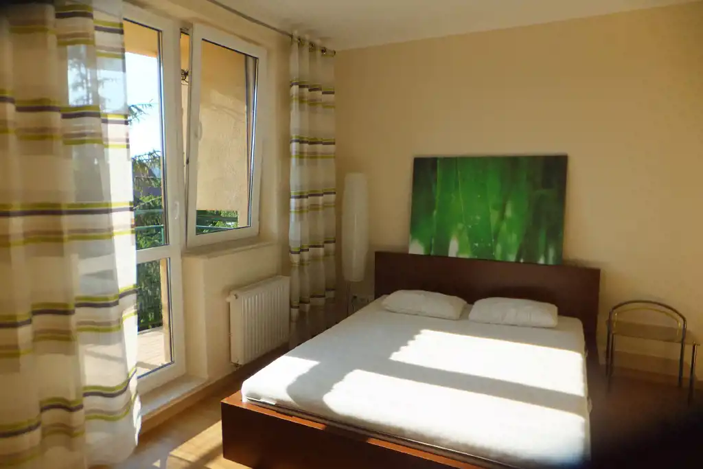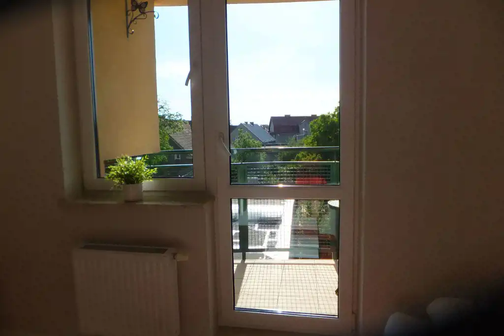 Składa się z dwóch pokoi (sypialni i pokoju dziennego), oddzielnej kuchni, łazienki, przedpokoju i dwóch balkonów. Kuchnia w pełni wyposażona: płyta ceramiczna, piekarnik, lodówka, zmywarka, okap, oraz naczynia i drobny sprzęt w kuchni.