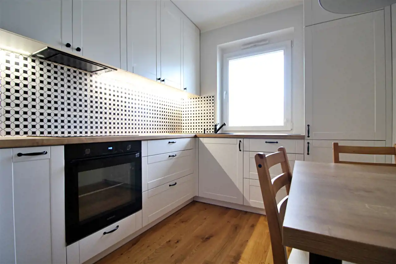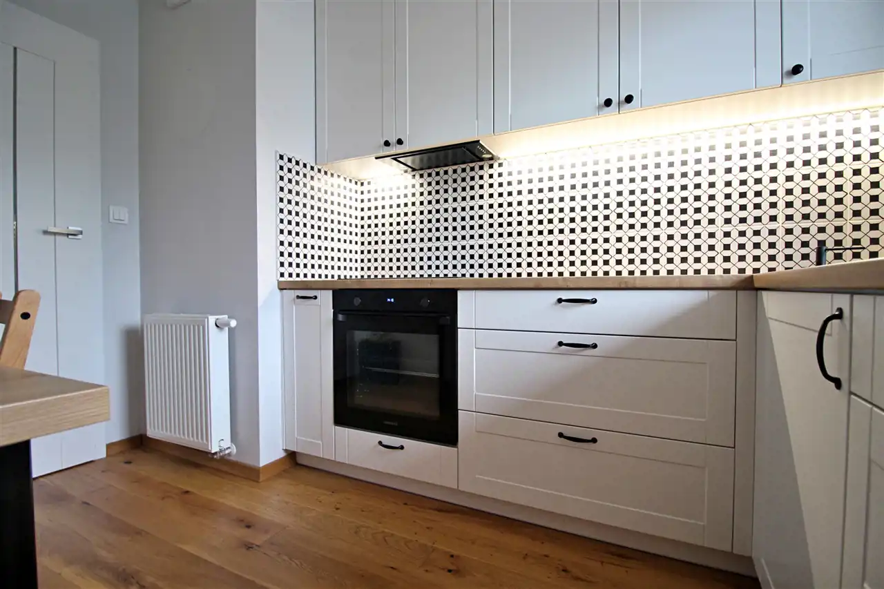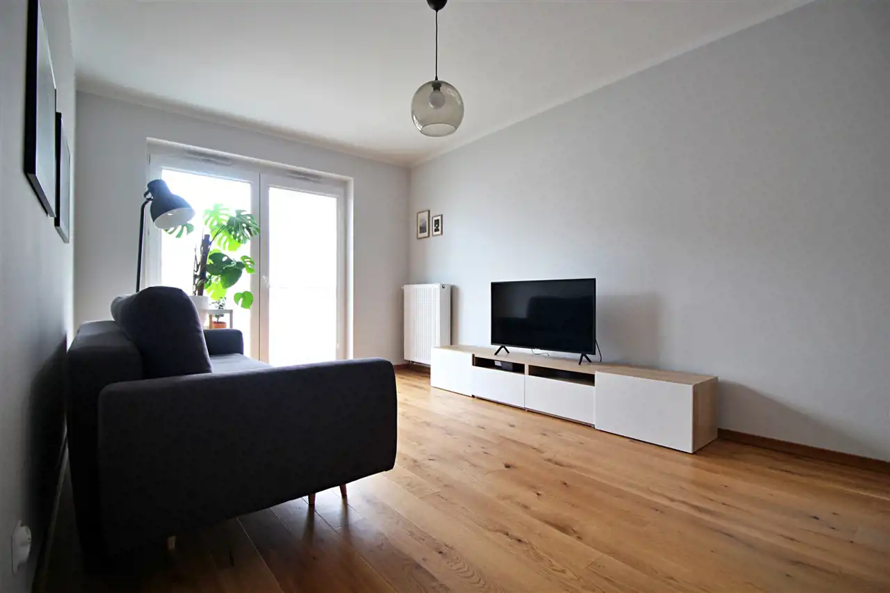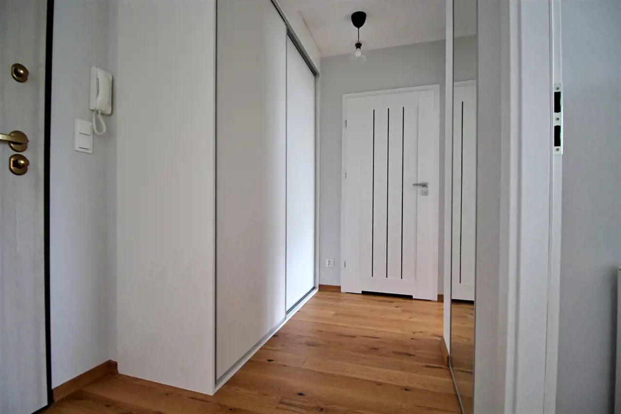 Nieruchomość składa się z przestronnego salonu, oddzielnej kuchni z oknem, sypialni, łazienki z kabiną prysznicową, przedpokoju oraz balkonu. Mieszkanie bardzo zadbane, wykończone z wysoką starannością. Piękna drewniana podłoga. W kuchni niezbędne sprzęty AGD (lodówka, piekarnik, płyta grzewcza, okap), w łazience pralka. W przedpokoju pojemna szafa w zabudowie.