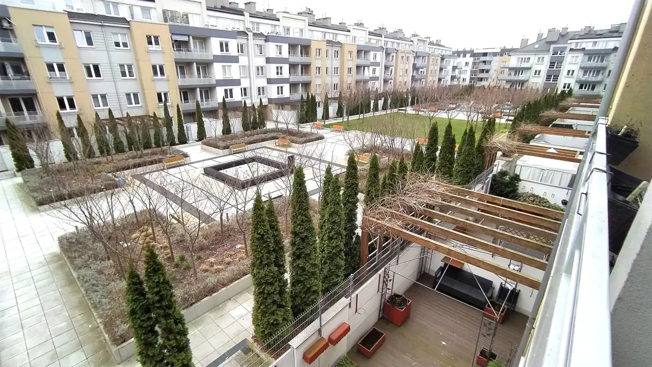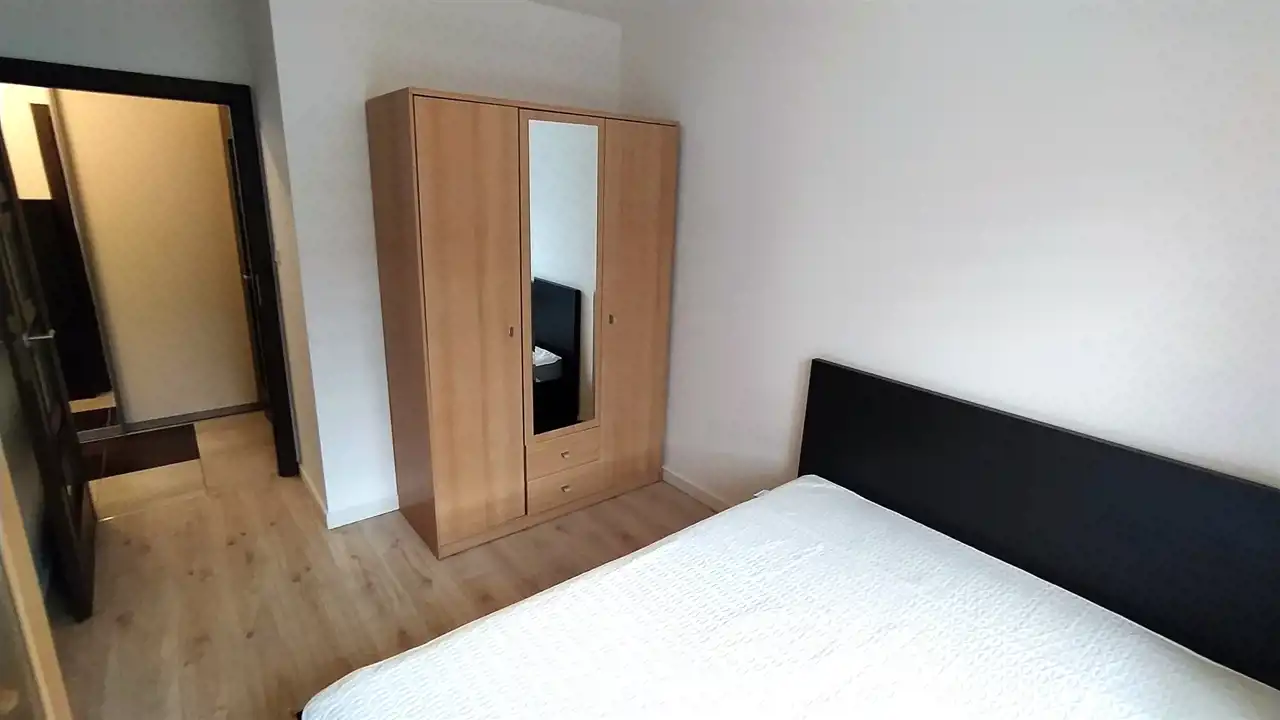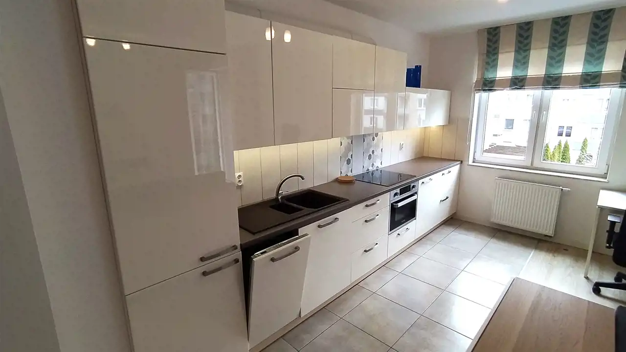 Mieszkanie 2-u pokojowe o pow. ok. 51 mkw., zlokalizowane na drugim piętrze (winda). Bardzo przestrzenny pokój dzienny połączony z kuchnią. Umeblowany. Obszerny balkon z widokiem na wewnętrzny, zielony dziedziniec. Część kuchenna z dużą zabudową ze sprzętem AGD (płyta indukcyjna, piekarnik, zmywarka, wysoka lodówka z zamrażarką) i podstawowym wyposażeniem. W przedpokoju szafa lustrzana w zabudowie i osobna szafka na buty. Sypialnia z łóżkiem (wygodny materac), szafa. Łazienka z wanną, pralka i liczne szafki. Do mieszkania przynależy bezpieczna piwnica. Pod budynkiem miejsce postojowe w garażu wielostanowiskowym (obowiązkowe dodatkowo 250 zł).