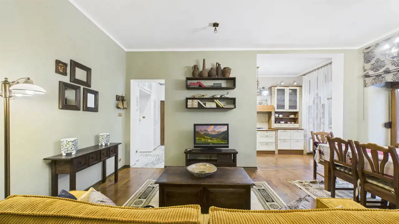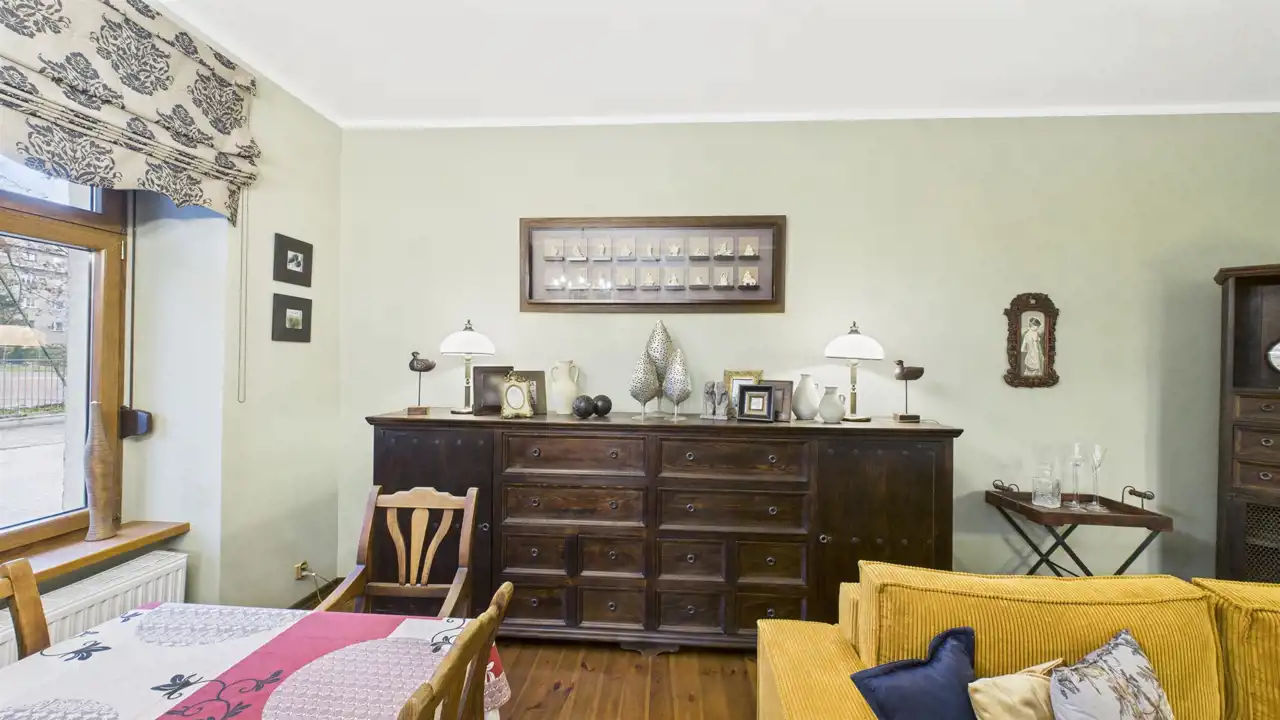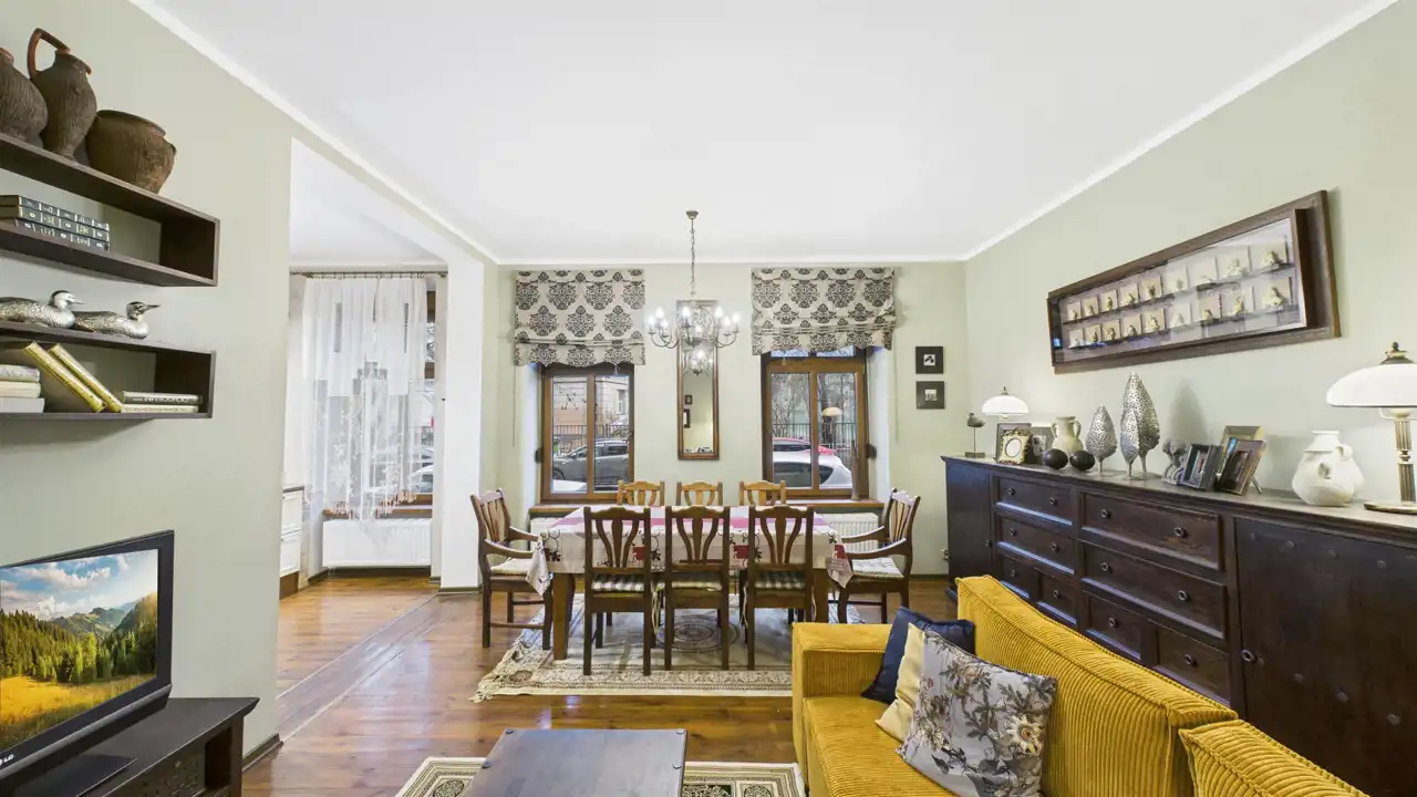 W mieszkaniu zastosowano drewniane podłogi, meble na wymiar oraz rolety przeciwwłamaniowe.