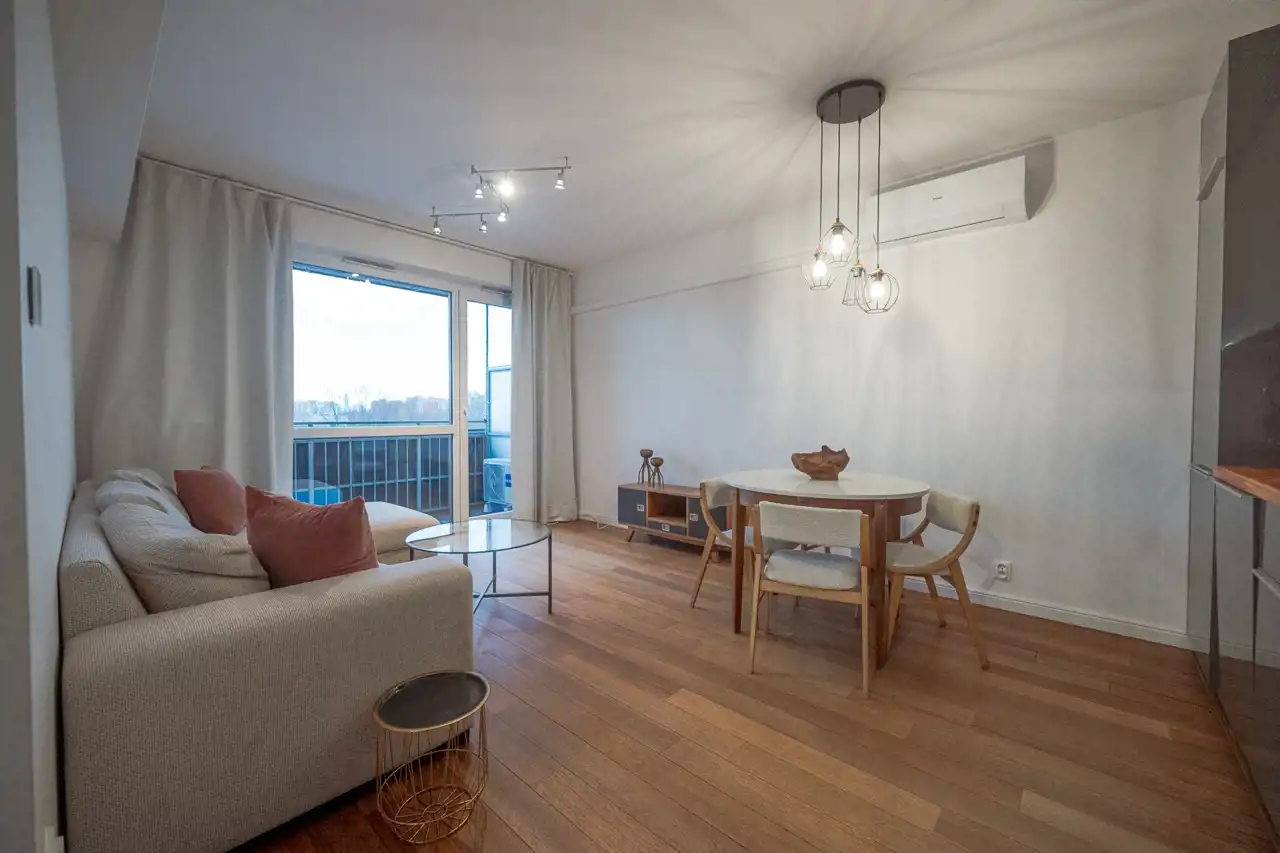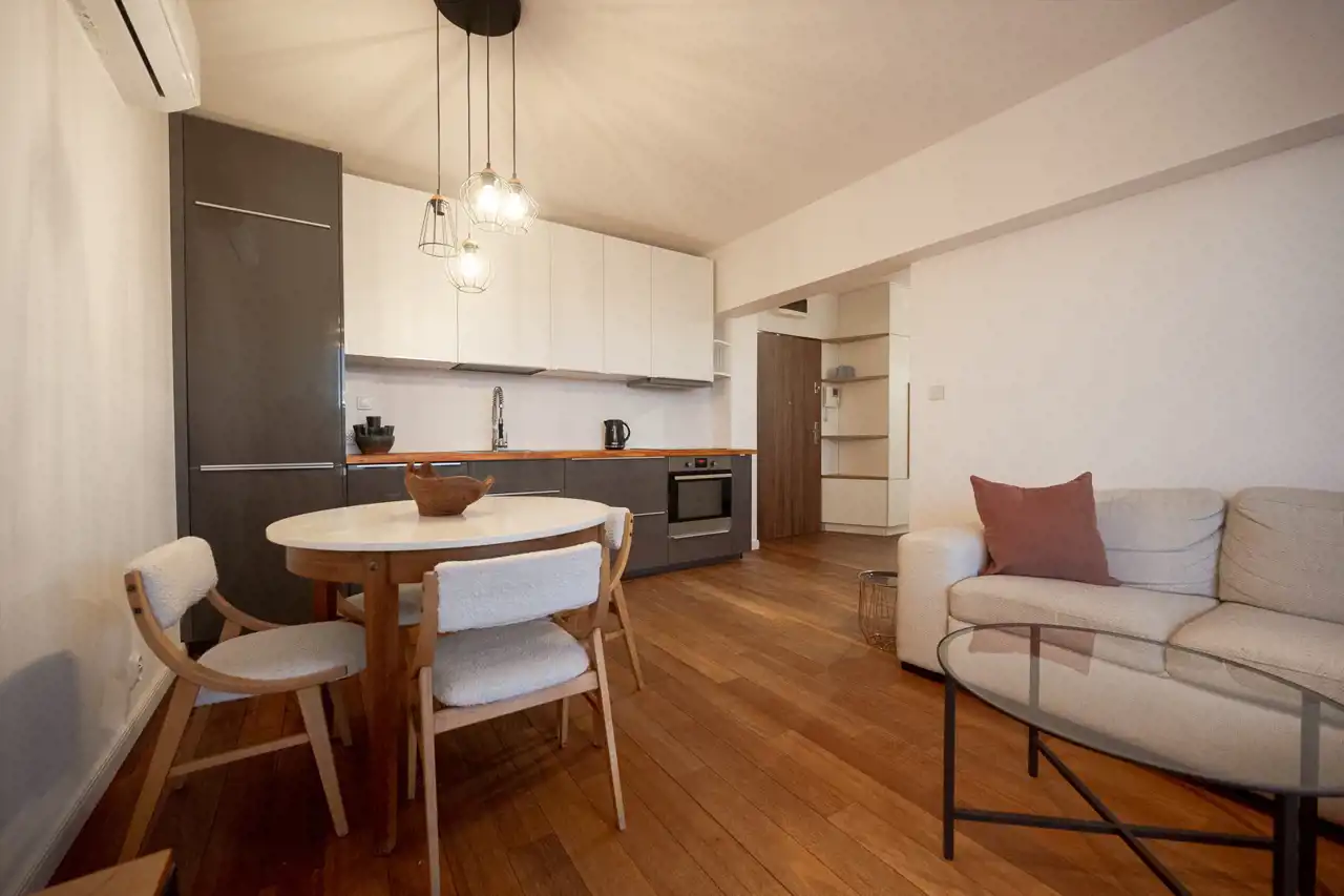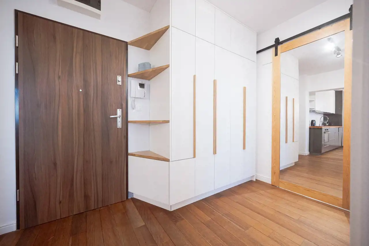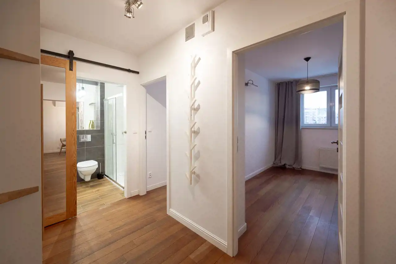 Wnętrza wykończone są z dbałością o detale — drewniane podłogi nadają mieszkaniu ciepły i elegancki charakter.