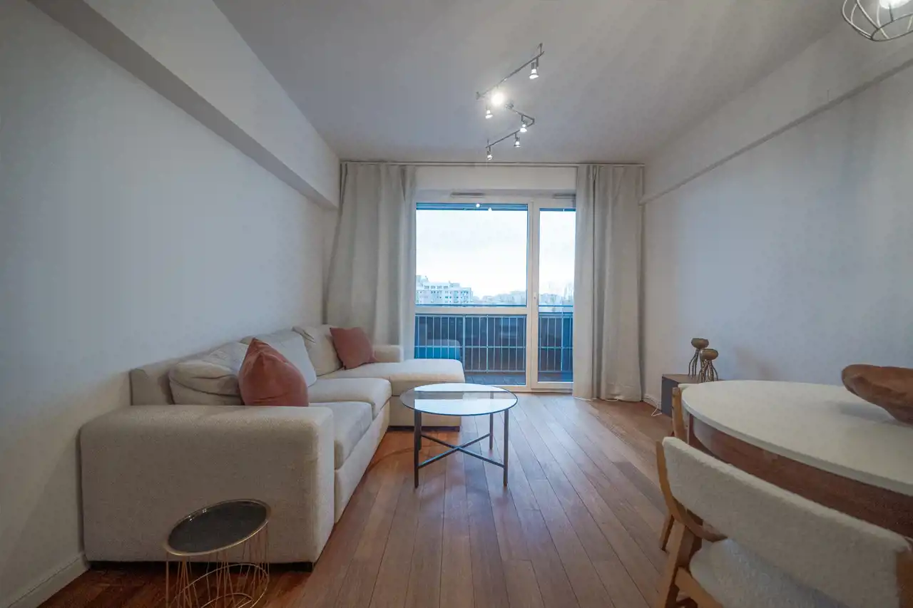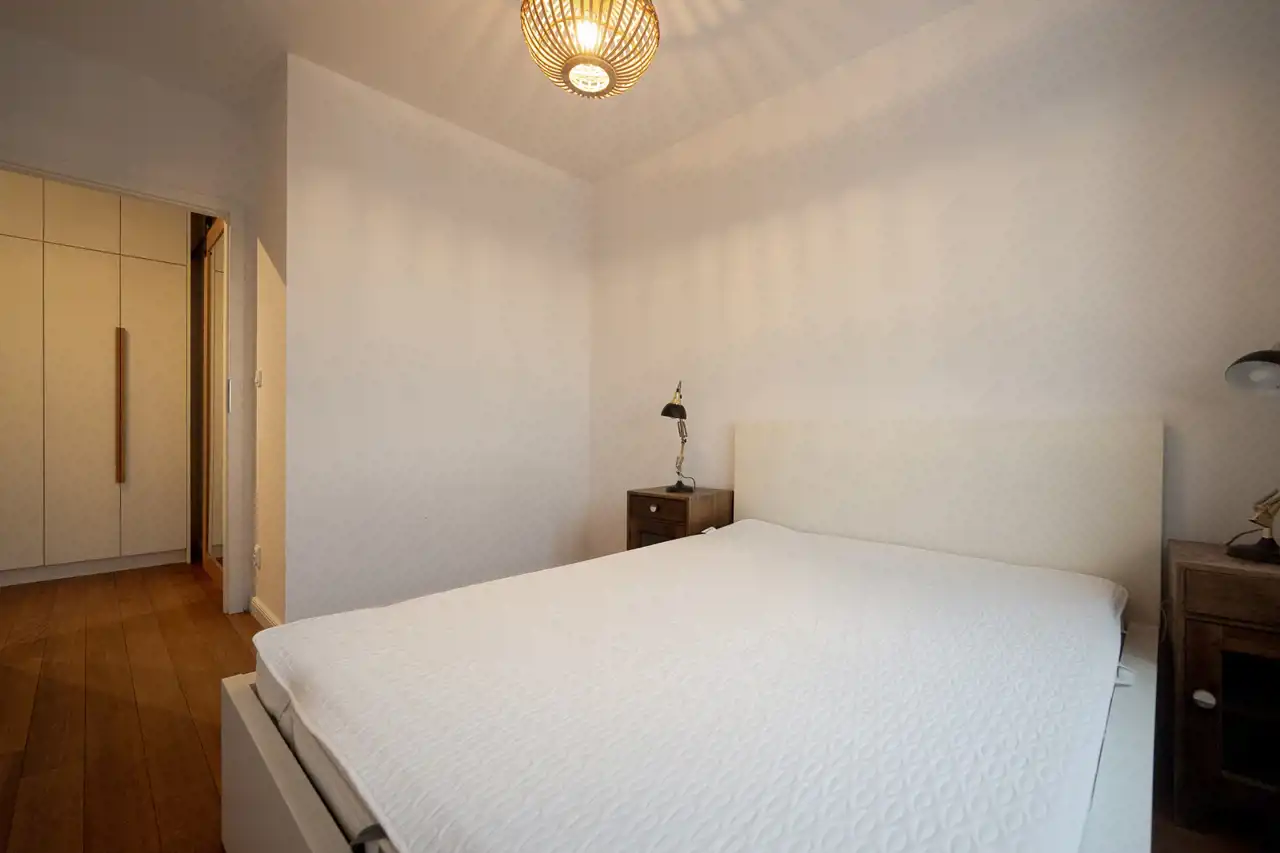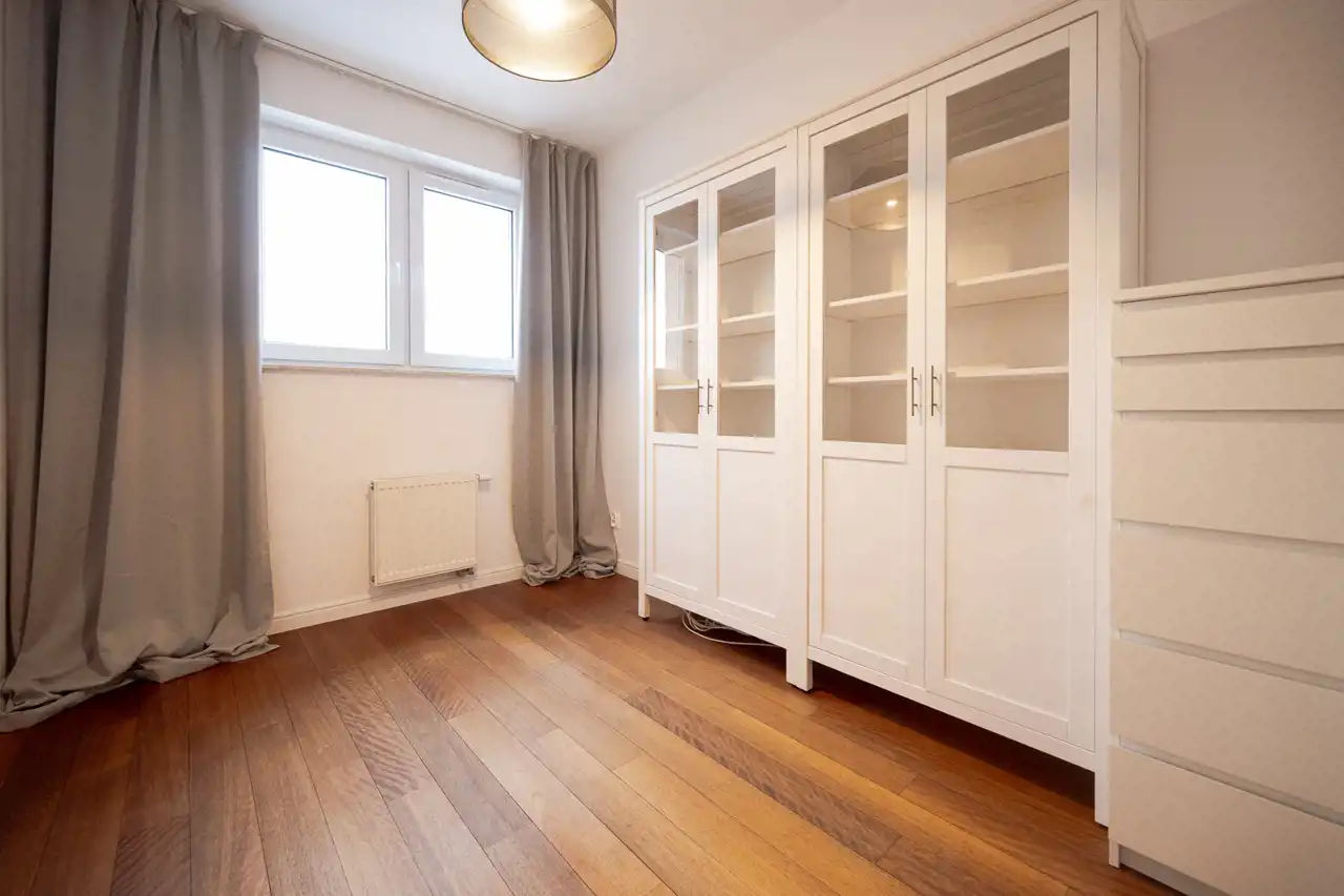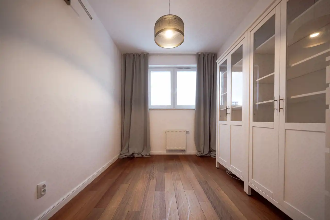 Wnętrza wykończone są z dbałością o detale — drewniane podłogi nadają mieszkaniu ciepły i elegancki charakter.
