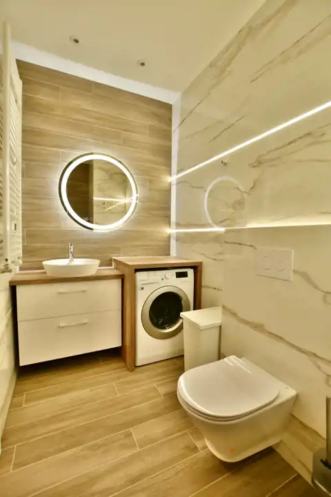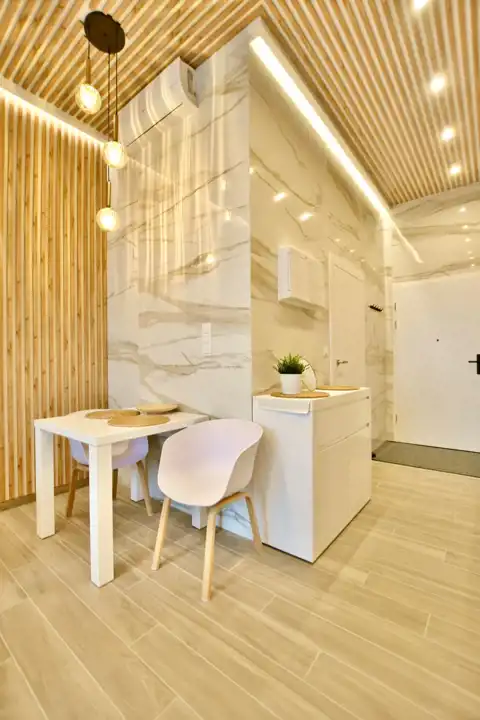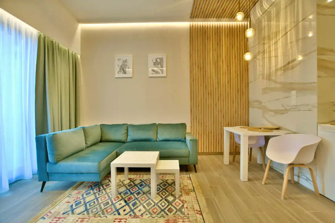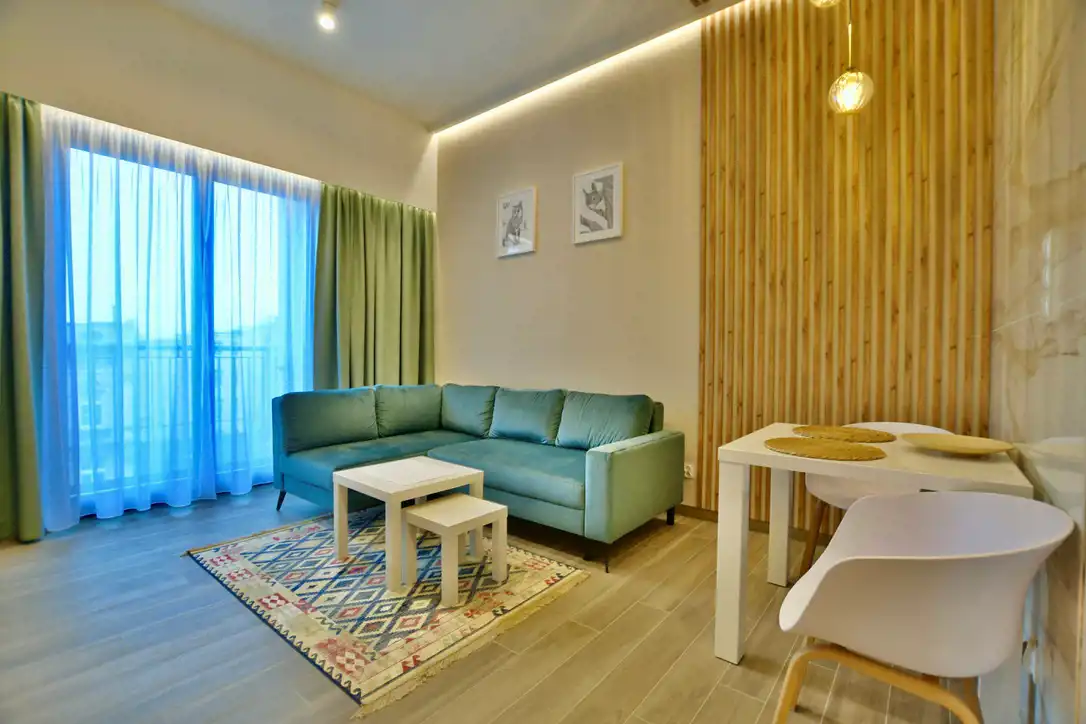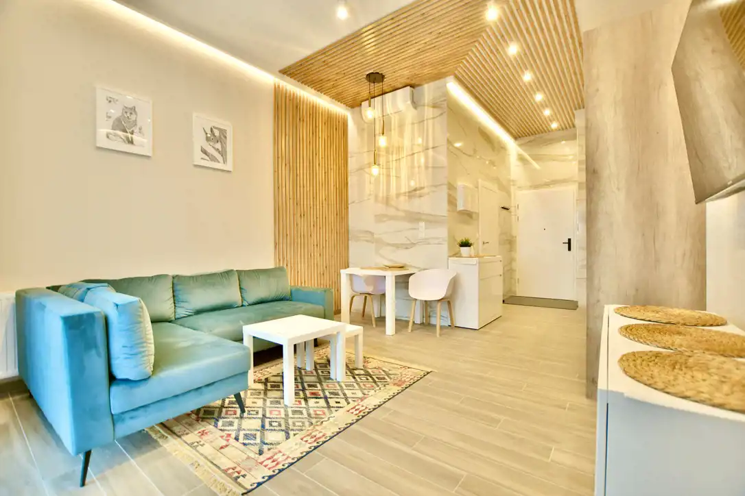 Apartament składa się z przestronnego, jasnego salonu połączonego z w pełni wyposażonym aneksem kuchennym (zmywarka, lodówka, okap, płyta grzewcza). Ponadto lokal składa się z dużej łazienki z kabiną prysznicową oraz pralko-suszarką. Mieszkanie posiada klimatyzację.