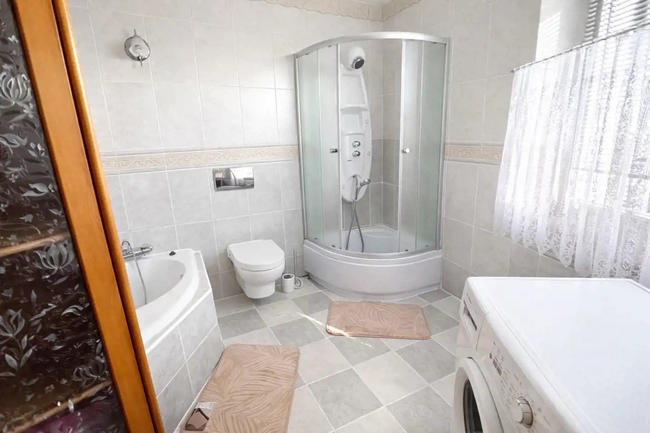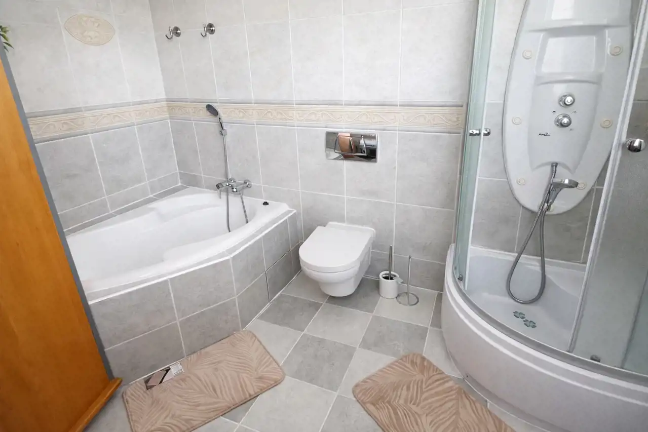 - łazienka z WC z wanną oraz prysznicem,
