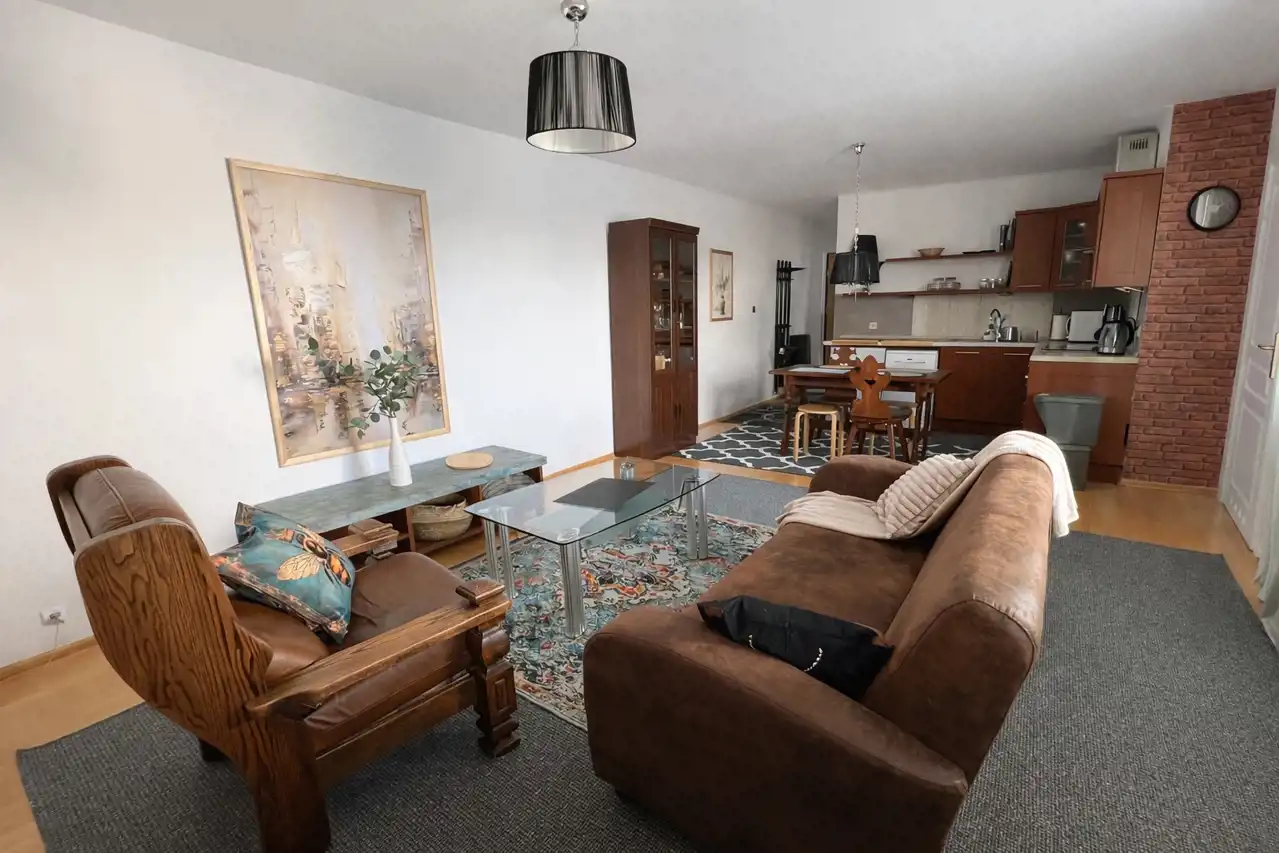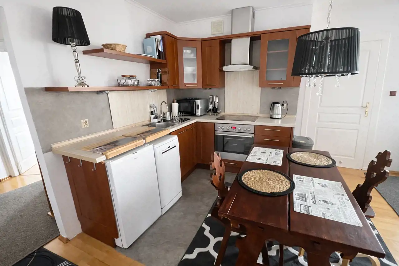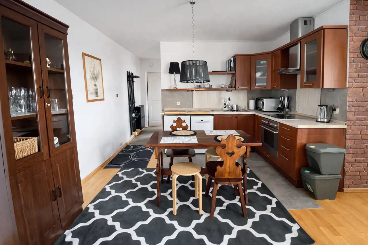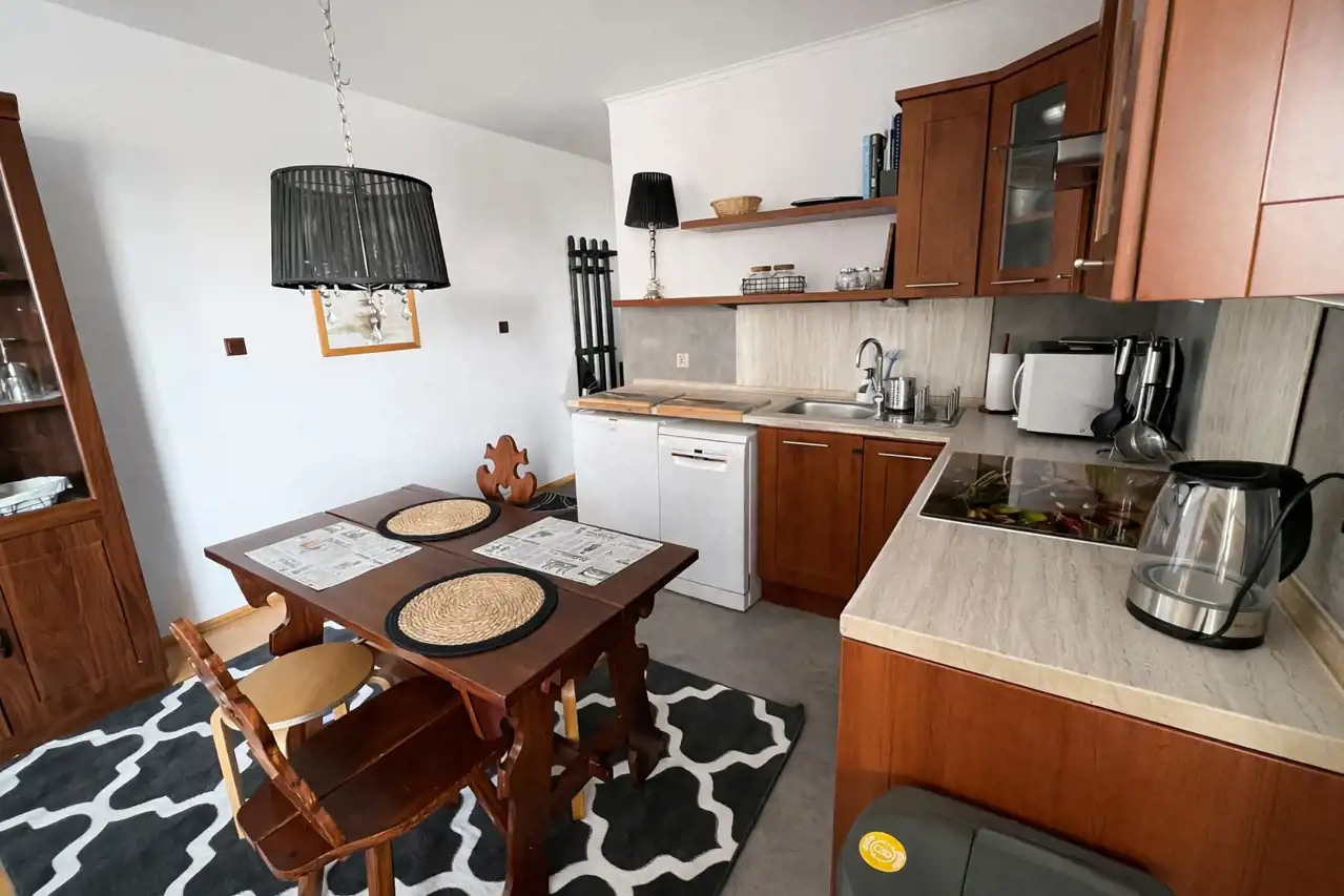 Mieszkanie jest w pełni umeblowane i wyposażone, jasne i przytulne. Pokój dzienny z aneksem kuchennym, z wyjściem na duży balkon, z którego rozciąga się widok na wewnętrzne patio. Osobna sypialnia z wygodnym łóżkiem oraz pojemną szafą w zabudowie. Łazienka z wanną oraz prysznicem. Kuchnia w pełni umeblowana i wyposażona w sprzęt AGD (lodówka, piekarnik, płyta, zmywarka, mikrofalówka, czajnik elektryczny). Dostępne naczynia oraz przybory do gotowania oraz spożywania posiłków. Na podłogach wysokiej klasy deska barlinecka. W oknach rolety oraz zasłony.