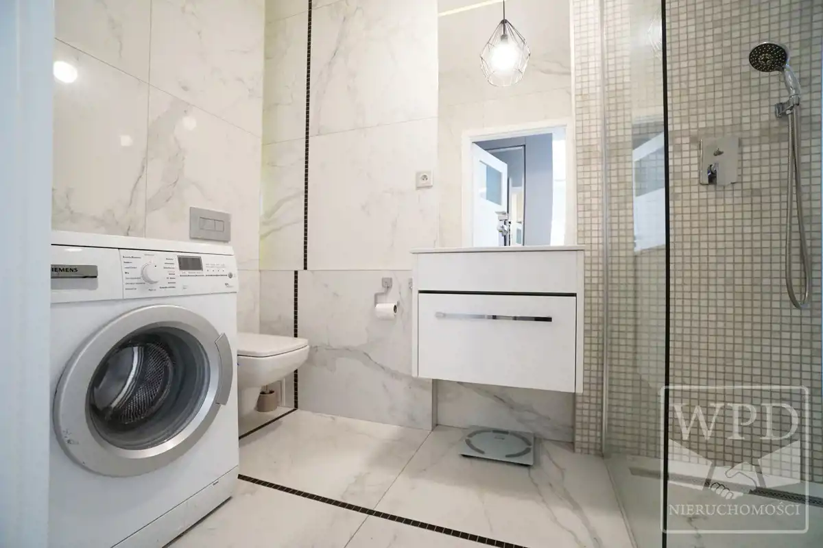 Mieszkanie jest wyposażone w sprzęty takie jak: Lodówka, piekarnik, płyta, zmywarka, mikrofalówka, pralka