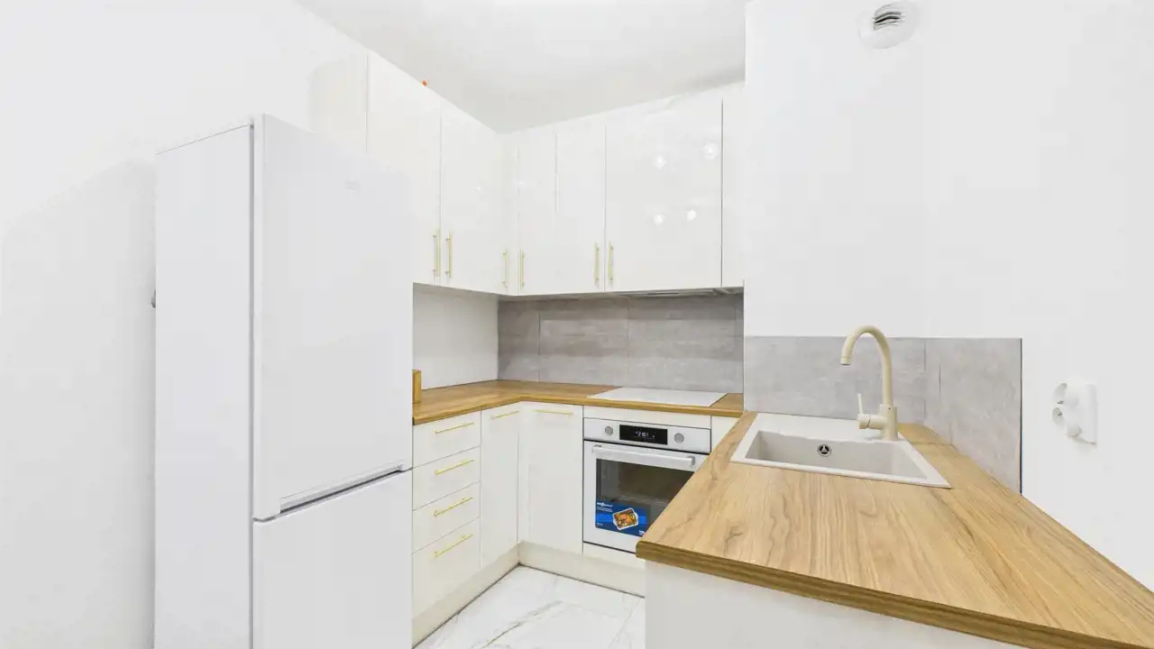 - w pełni wyposażona kuchnia: lodówka, piekarnik, płyta