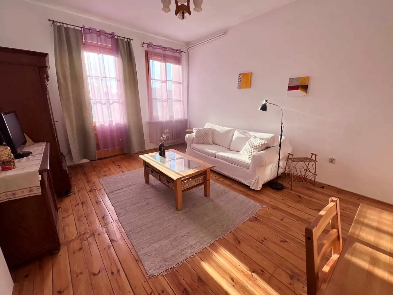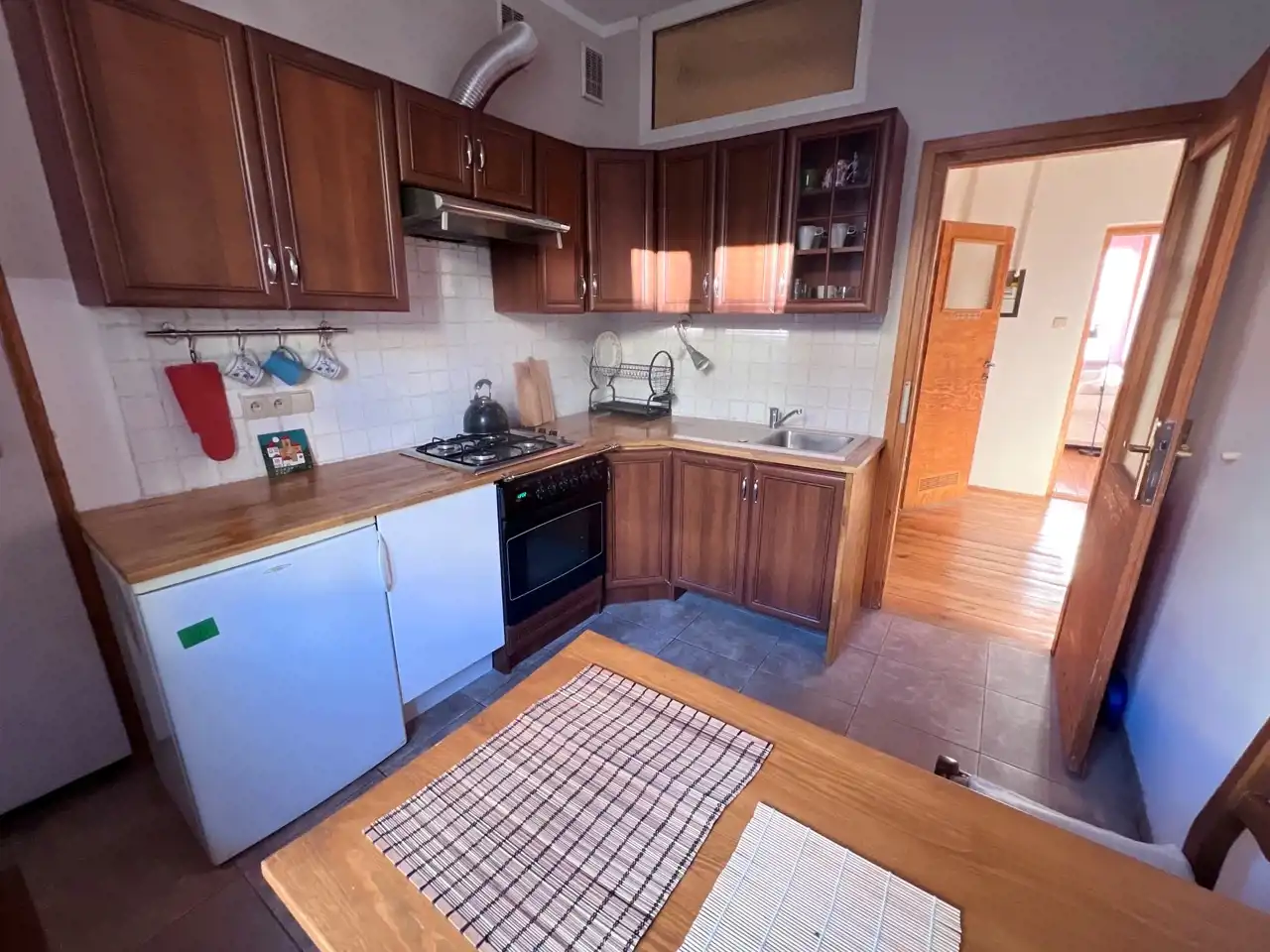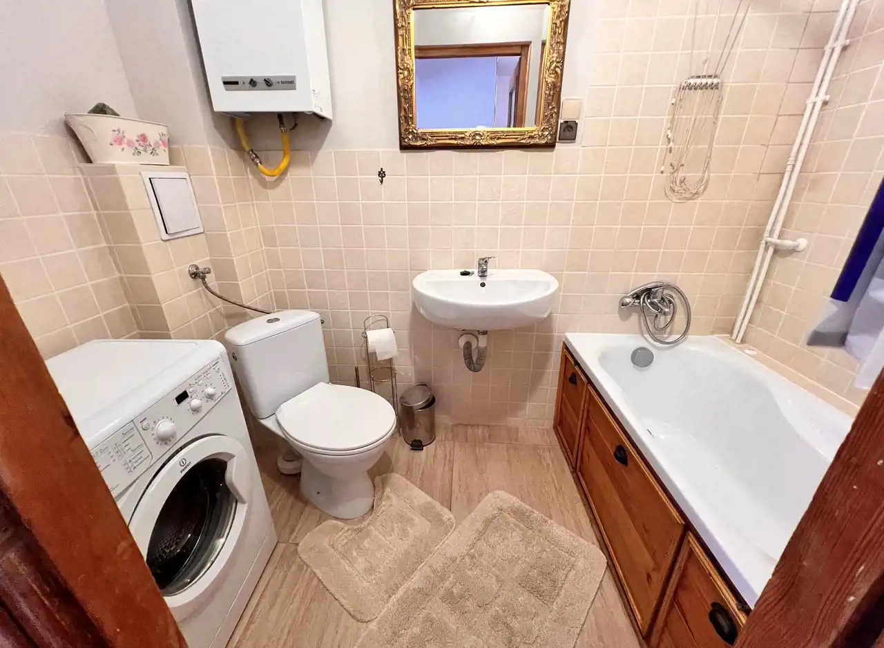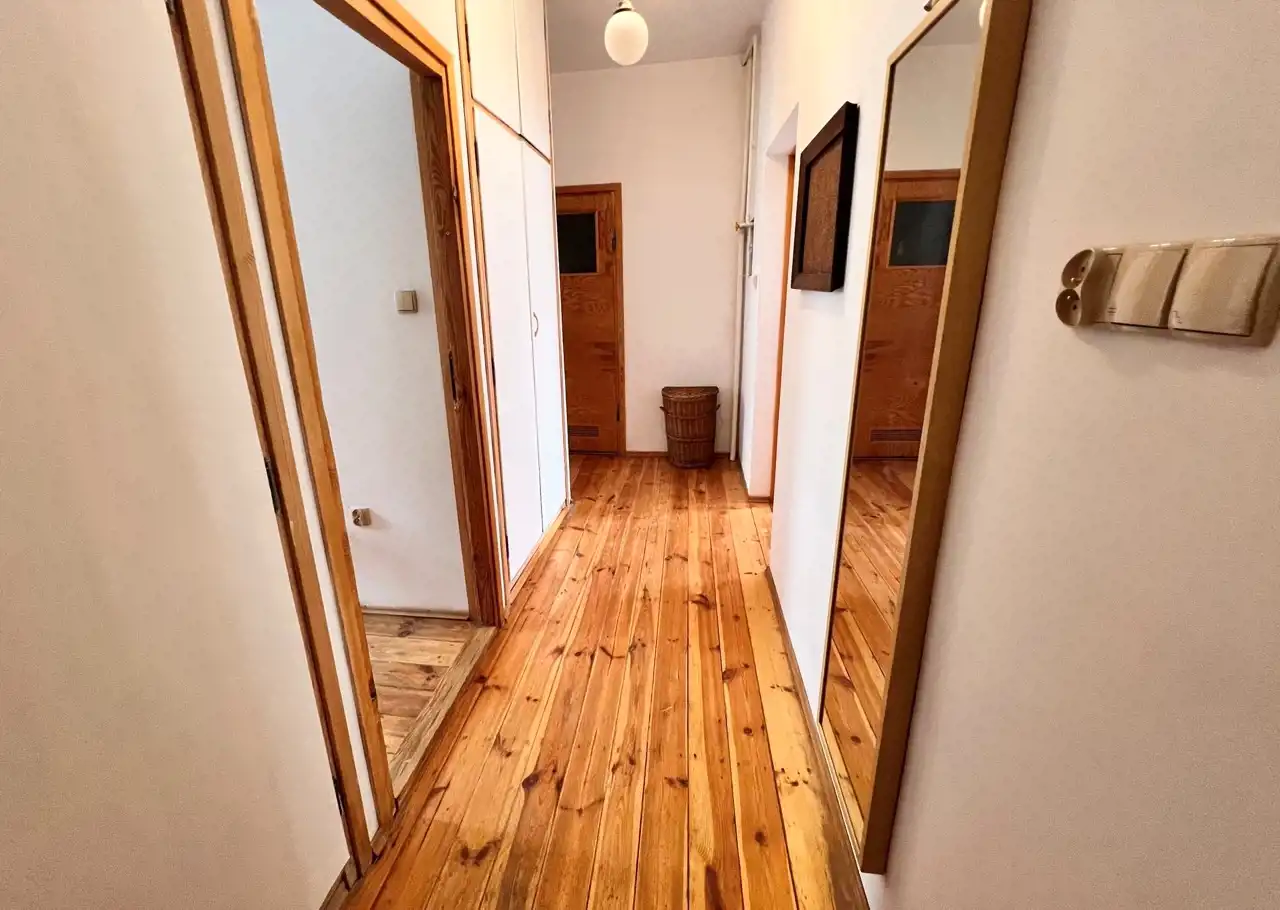 Jasne, przytulne wnętrza. Na podłodze deska. Mieszkanie jest w pełni wyposażone i przygotowane do zamieszkania. Kuchnia z meblami i sprzętem AGD: zmywarka, lodówka, kuchenka, piekarnik, małe agd. Dwa przestronne pokoje, łazienka z wanną i pralką. W przedpokoju dwie pojemne szafy w zabudowie. Ogrzewanie miejskie.