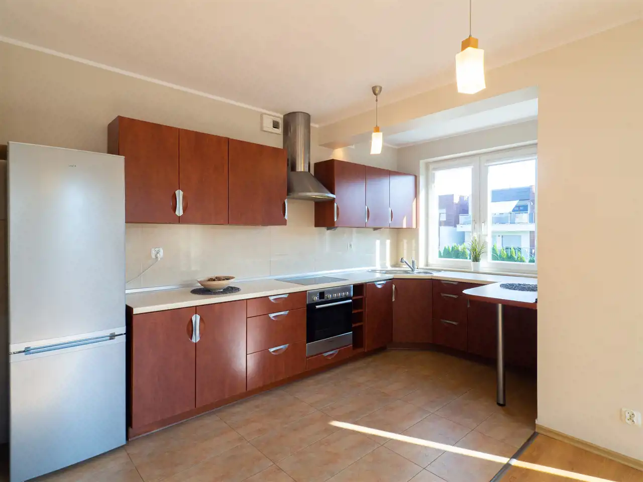 Otwarta kuchnia oferuje meble kuchenne w zabudowie oraz wszystkie niezbędne sprzęty AGD, w tym lodówko-zamrażarkę, zmywarkę, piekarnik, płytę indukcyjną i okap.