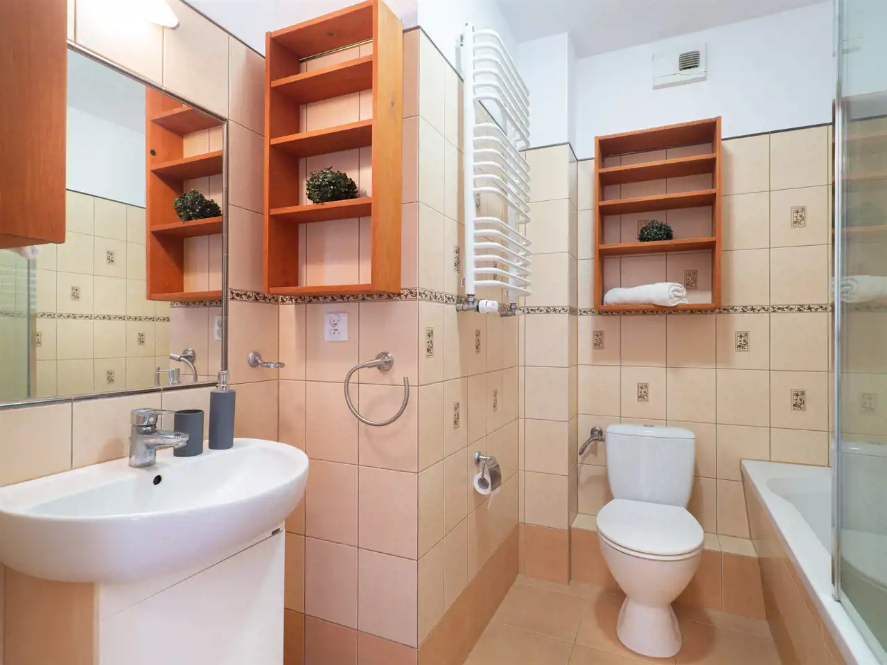 W łazience znajduje się wanna z funkcją prysznica, pralka oraz półki łazienkowe. Na miejsce do przechowywania przewidziana została spora szafa z drzwiami przesuwnymi w przedpokoju.