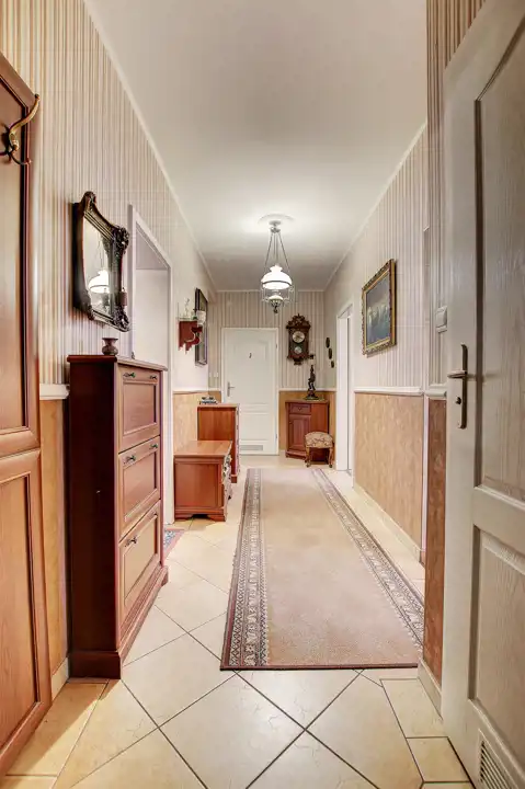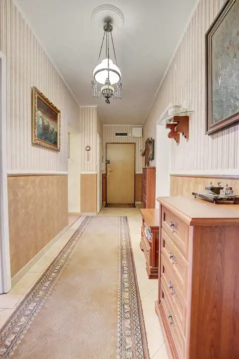 W projekcie mieszkanie było czteropokojowe, jednakże dzięki połączeniu salonu z gabinetem powstał wyjątkowo okazały salon (ponad 30m2 powierzchni), co więcej, wygospodarowano pralnię i garderobę.