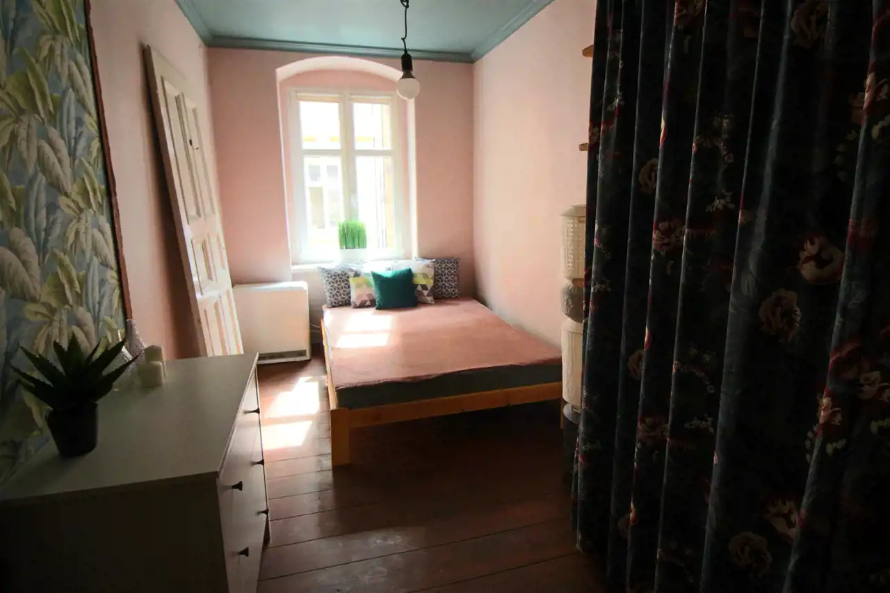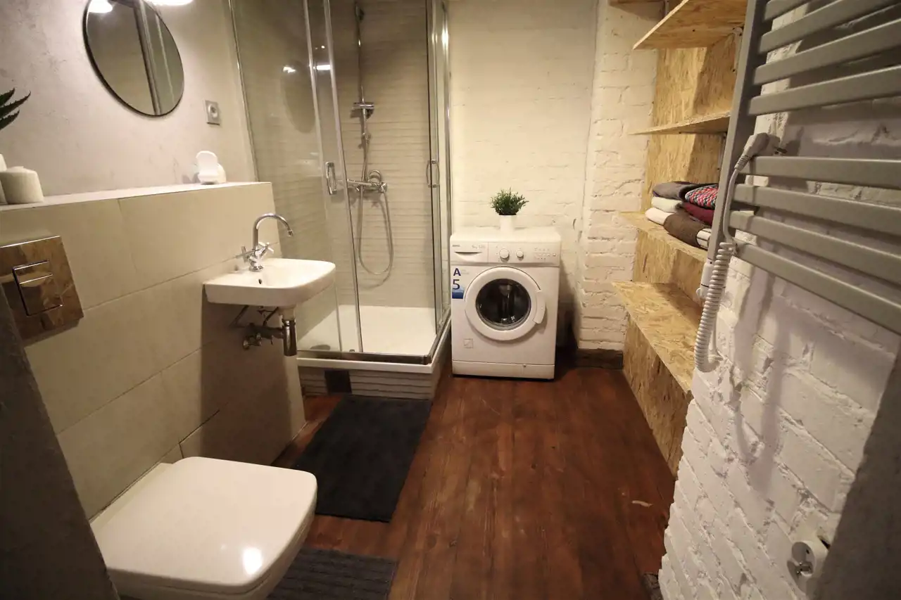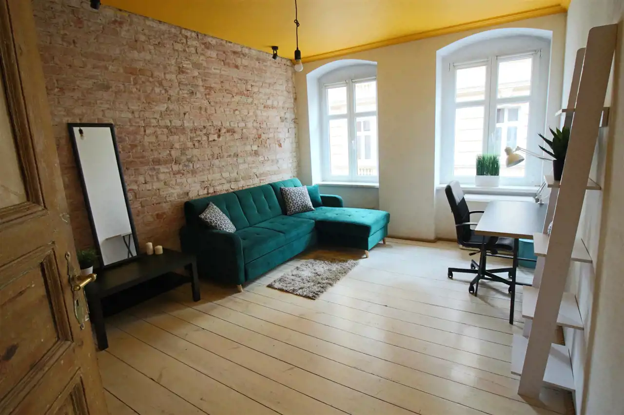 Mieszkanie wyjątkowe, urządzone w oryginalny sposób. Drewniana podłoga, zachowana odnowiona stolarka drzwiowa. Pokojowe w pełni wyposażone i umeblowane. Kuchnia z meblami na wymiar oraz sprzętem AGD (płyta gazowa, piekarnik elektryczny, lodówko zamrażalka, okap). Dostępne naczynia do gotowania i spożywania posiłków. Łazienka z prysznicem oraz pralką. Okna PCV. Pokoje w pełni umeblowane, wygodne łózka.