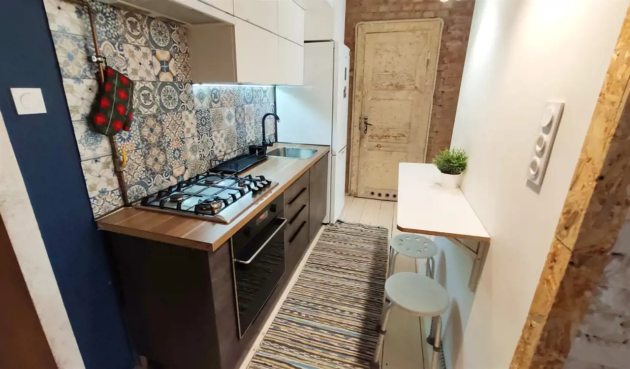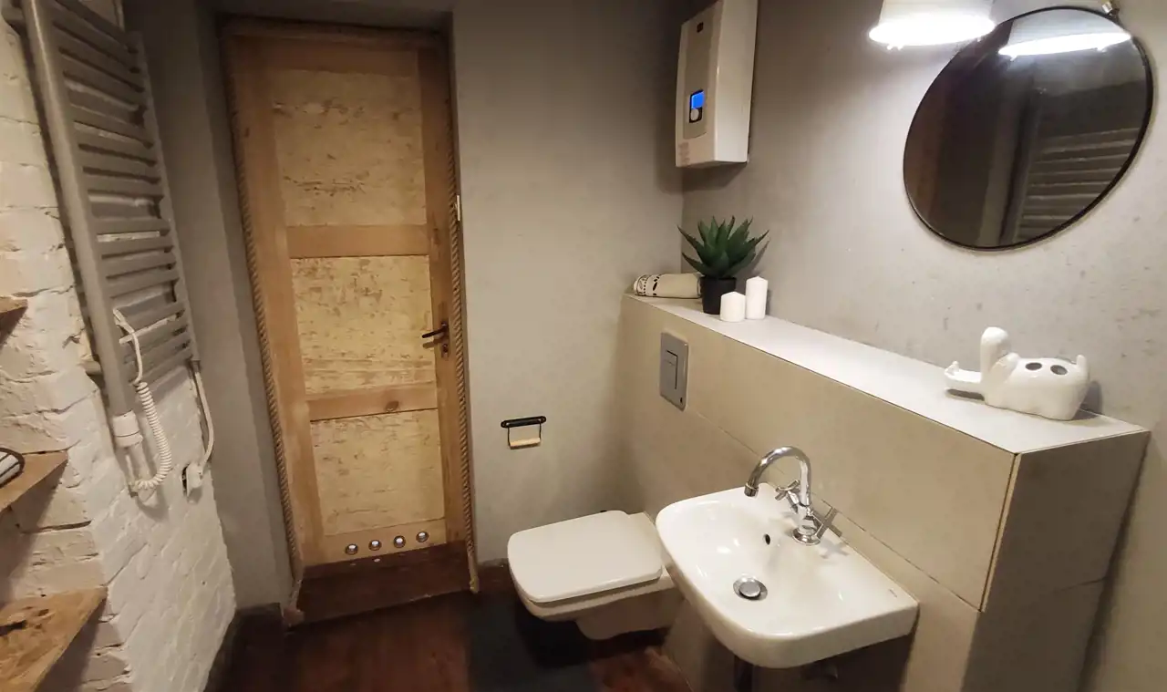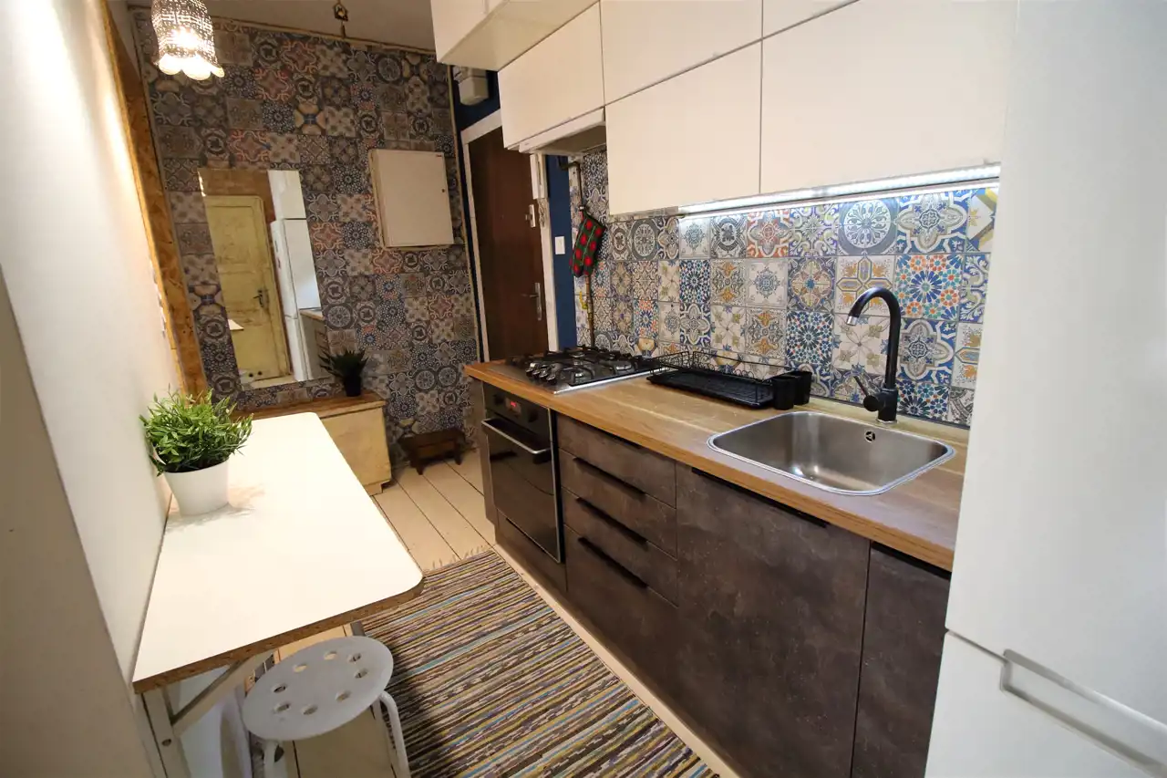 Mieszkanie wyjątkowe, urządzone w oryginalny sposób. Drewniana podłoga, zachowana odnowiona stolarka drzwiowa. Pokojowe w pełni wyposażone i umeblowane. Kuchnia z meblami na wymiar oraz sprzętem AGD (płyta gazowa, piekarnik elektryczny, lodówko zamrażalka, okap). Dostępne naczynia do gotowania i spożywania posiłków. Łazienka z prysznicem oraz pralką. Okna PCV. Pokoje w pełni umeblowane, wygodne łózka.