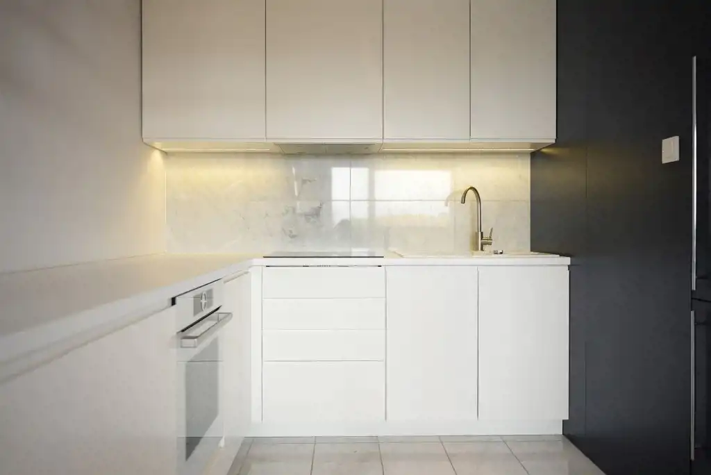 Kuchnia w pełni umeblowana i wyposażona w sprzęt AGD ( zmywarka, piekarnik, płyta indukcyjna, okap, lodówko-zamrażarka).