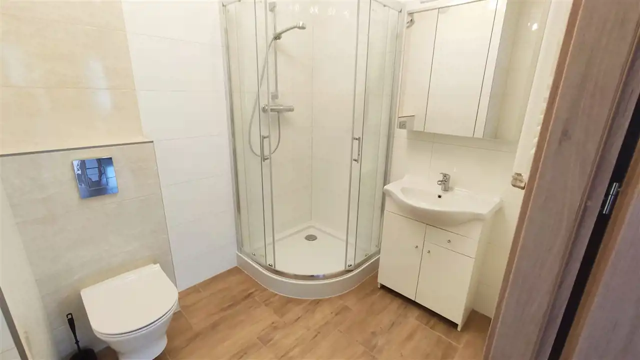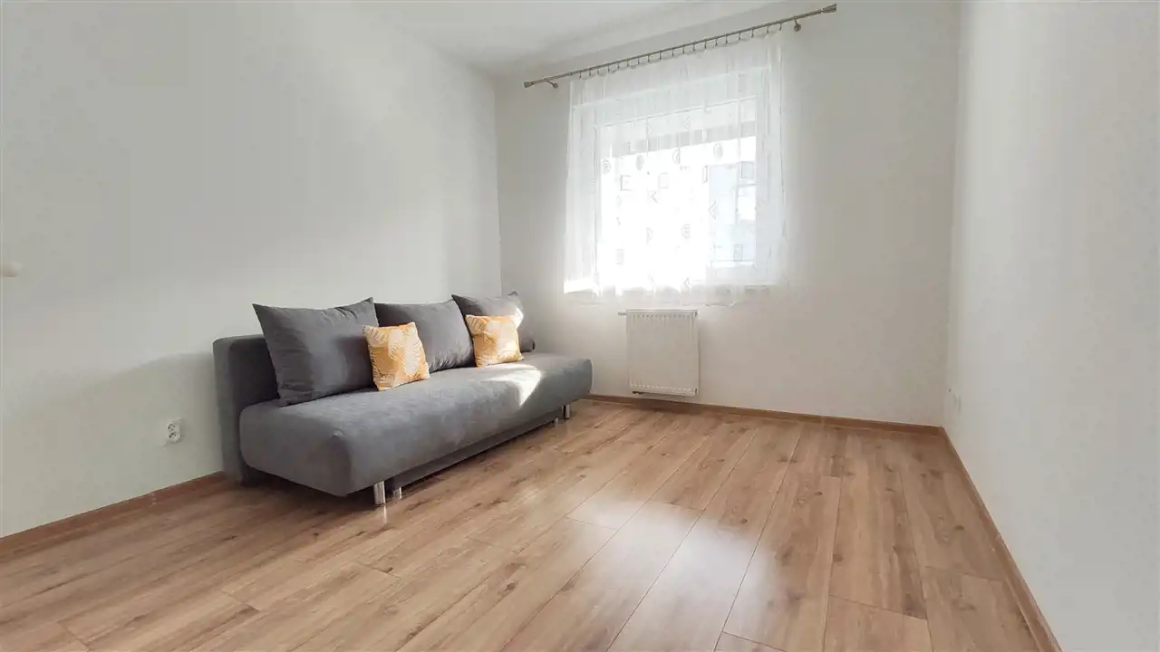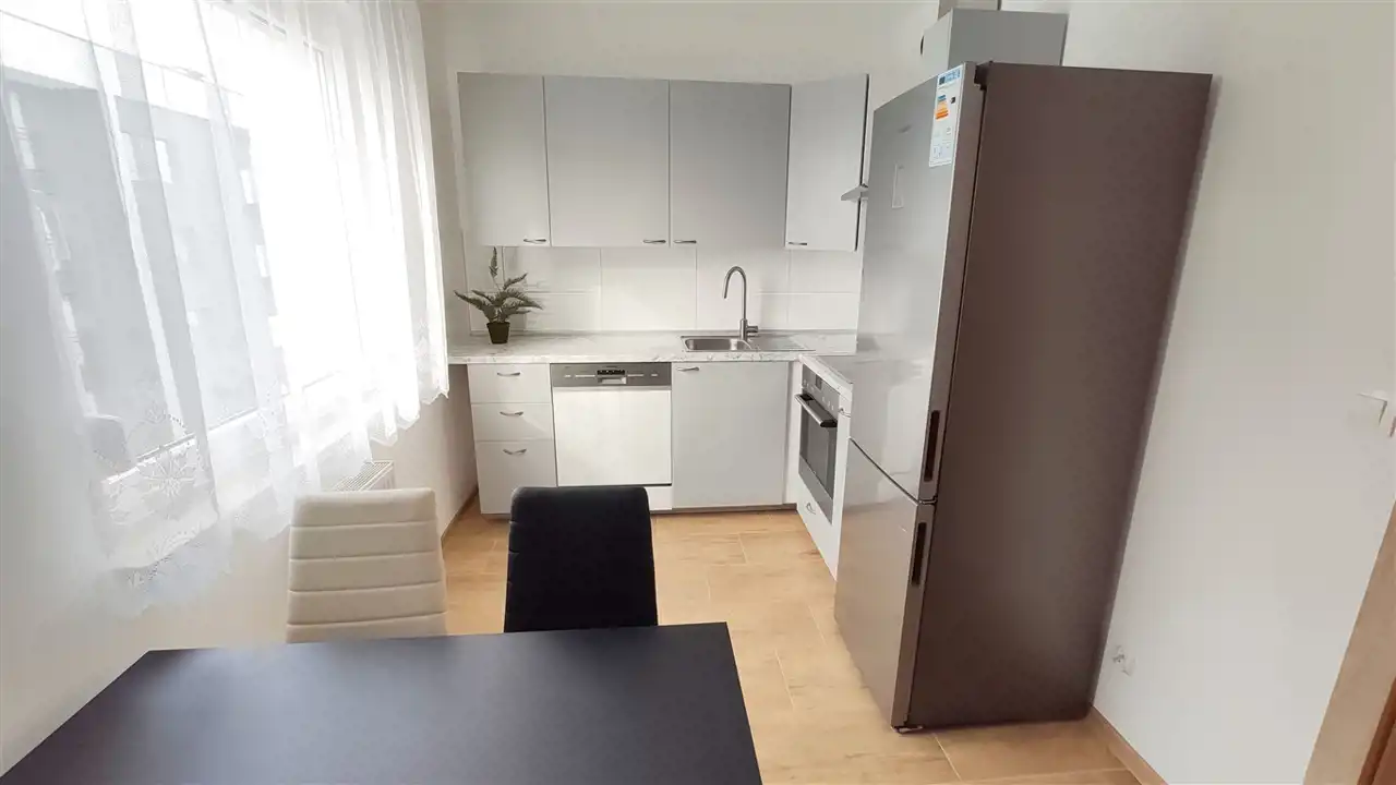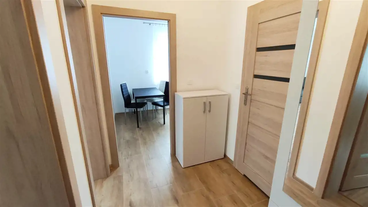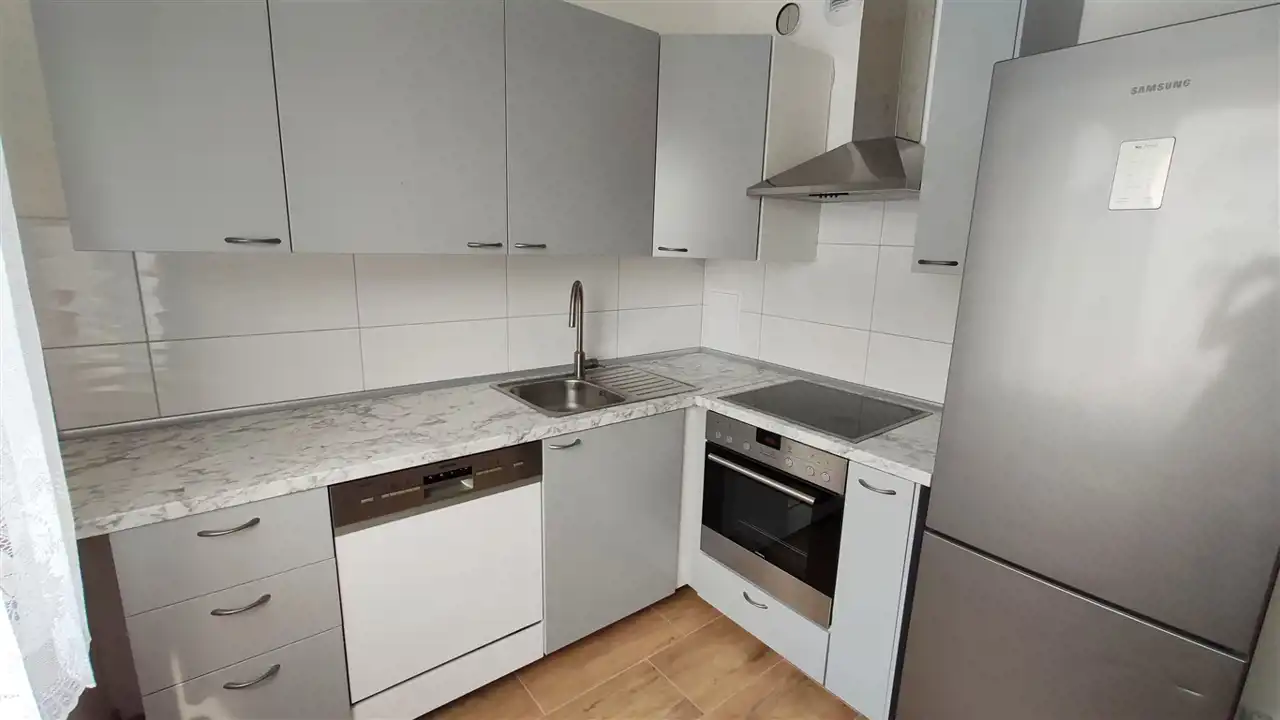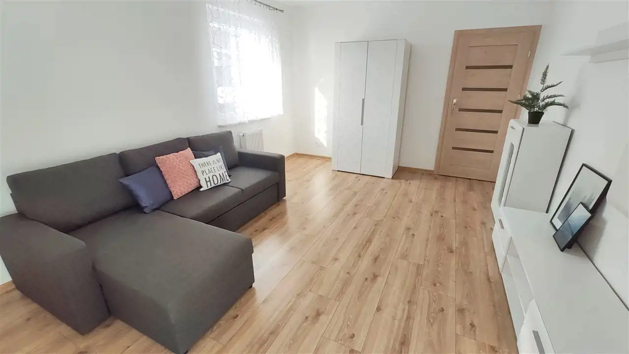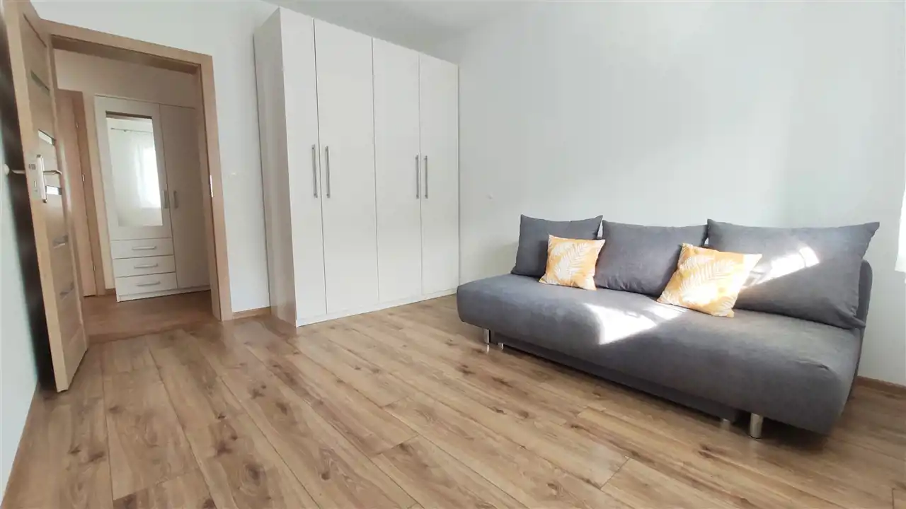Mieszkanie jest w pełni wyposażone, umeblowane i gotowe do wprowadzenia. Kuchnia z meblami i sprzętem AGD (lodówka, piekarnik, płyta, zmywarka) oraz stołem z krzesłami. Dwa niezależne pokoje z rozkładanymi kanapami i meblami. Z większego pokoju wyjście na duży balkon. W przedpokoju dodatkowe miejsce do przechowywania rzeczy - wygodna szafa oraz komoda. Łazienka z prysznicem i pralką.