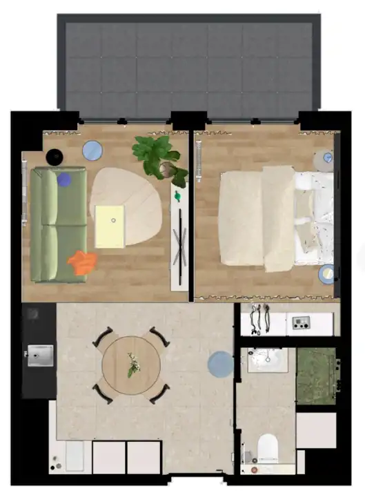 - przestronnego salonu z balkonem oraz aneksem kuchennym,