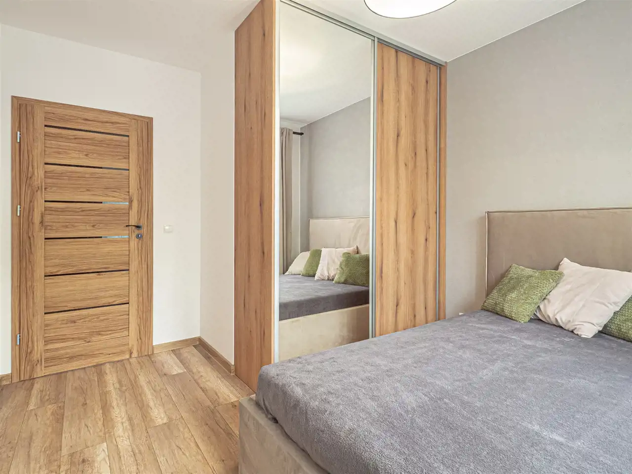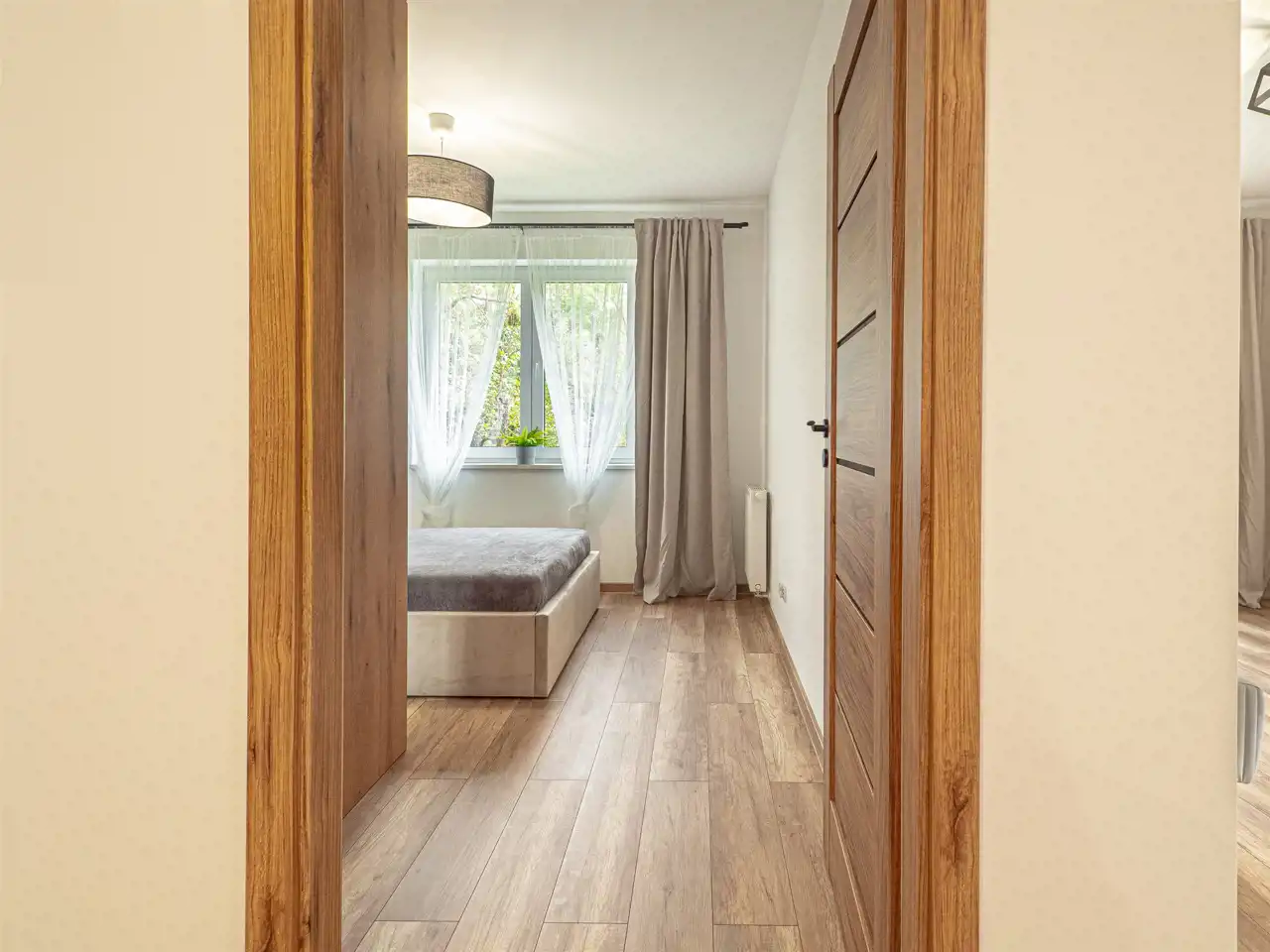 - sypialnia z wygodnym, podwójnym łóżkiem i pojemną szafą w zabudowie,