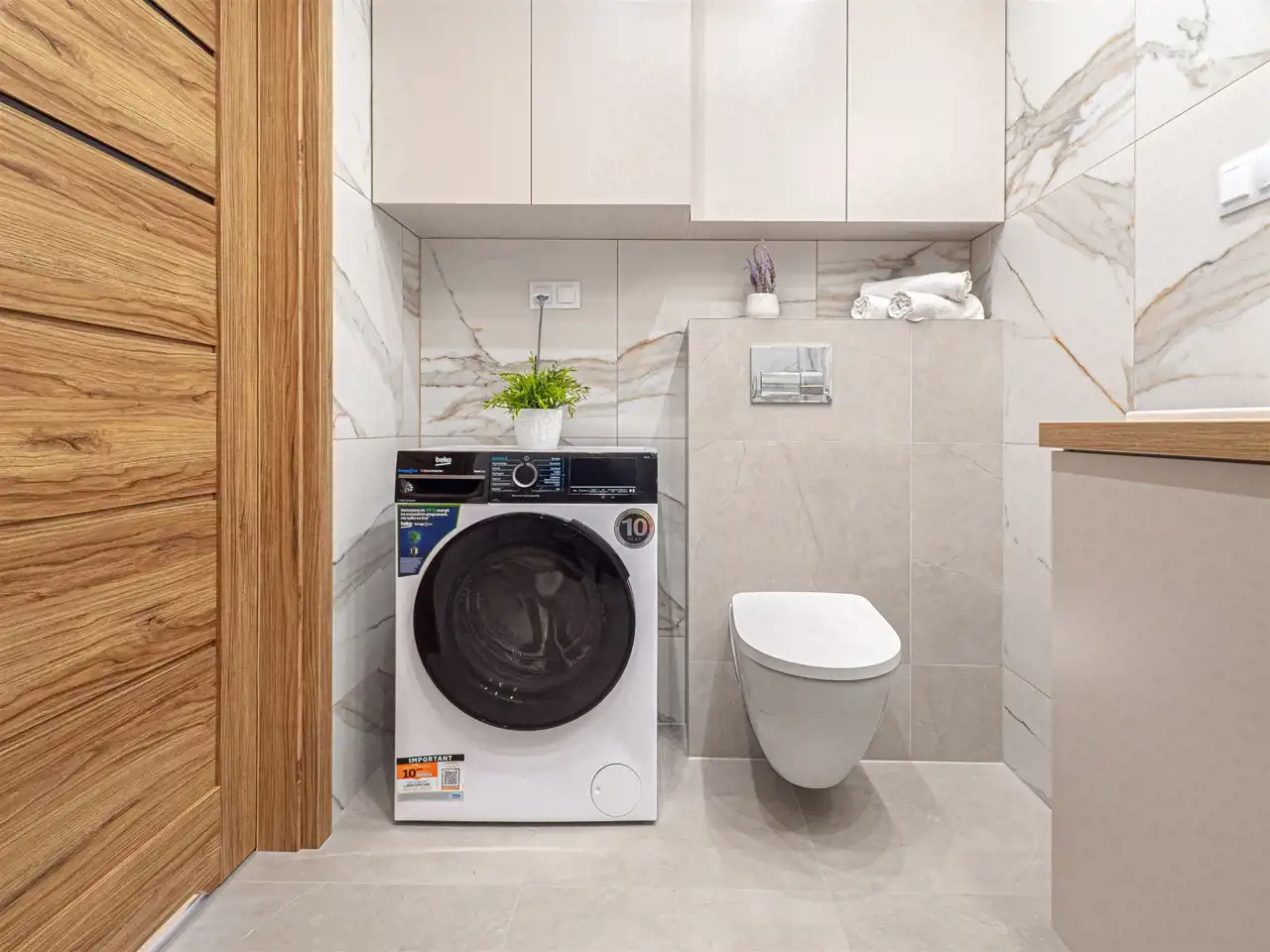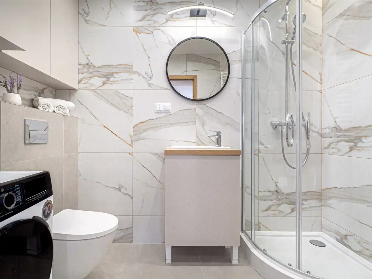- łazienka z prysznicem, lustrem, umywalką, nowoczesną pralką i szafkami do przechowywania,