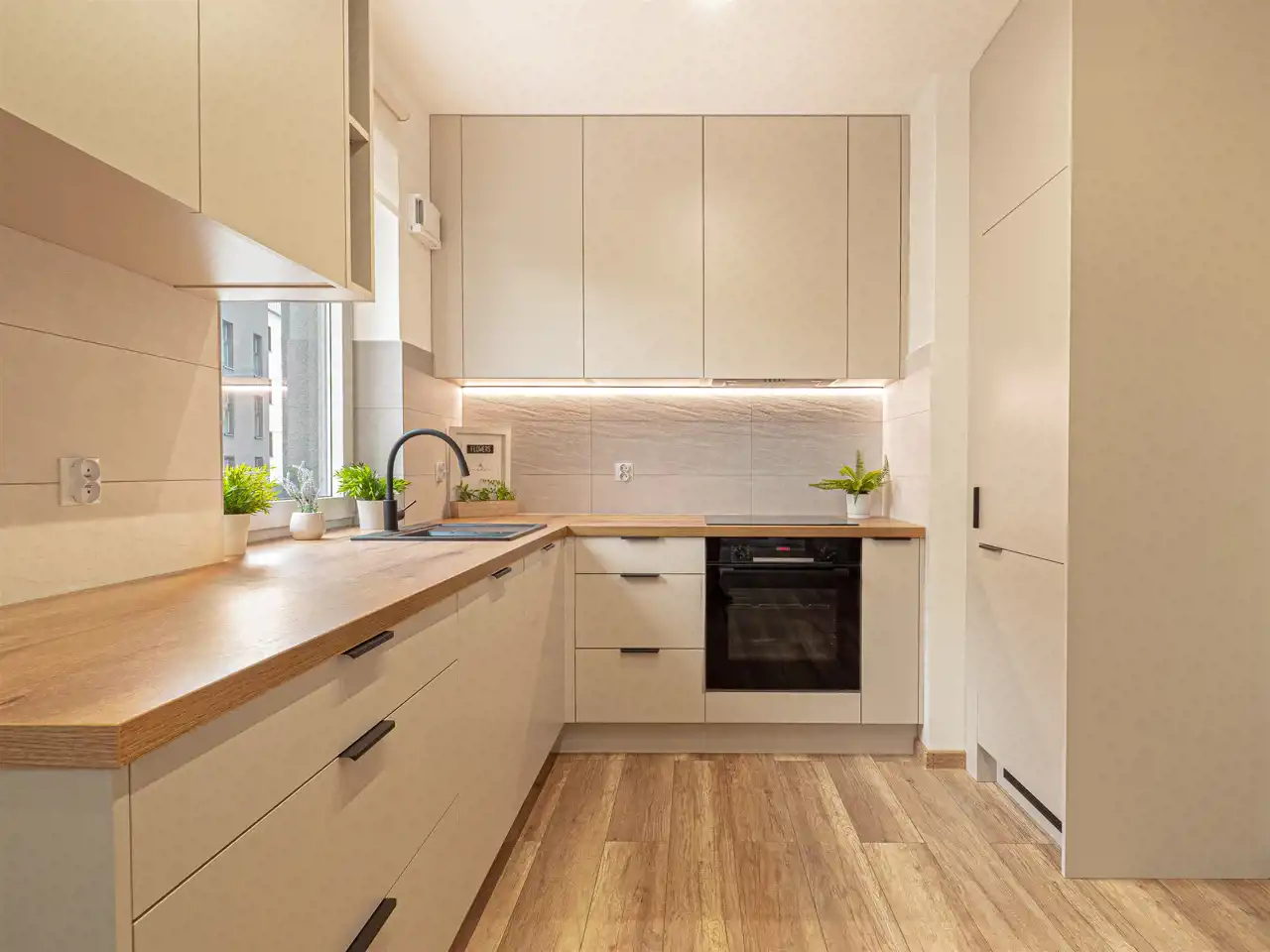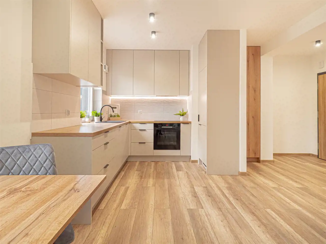 Wnętrze zostało urządzone z dbałością o detale – wyposażone w meble na wymiar oraz wysokiej jakości sprzęt AGD, co gwarantuje komfort i funkcjonalność od pierwszego dnia.