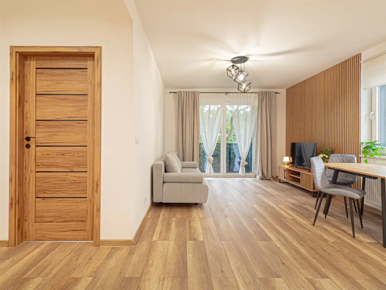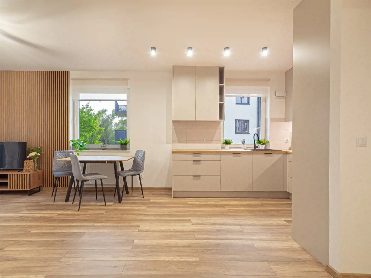 - przestronny salon z aneksem kuchennym, wyposażonym w nowoczesne meble i nowy sprzęt AGD: płytę indukcyjną, piekarnik elektryczny, okap kuchenny, lodówko-zamrażarkę, zmywarkę. W części jadalnianej znajduje się stół z krzesłami, w części dziennej wygodna rozkładana sofa, stolik RTV z telewizorem,
