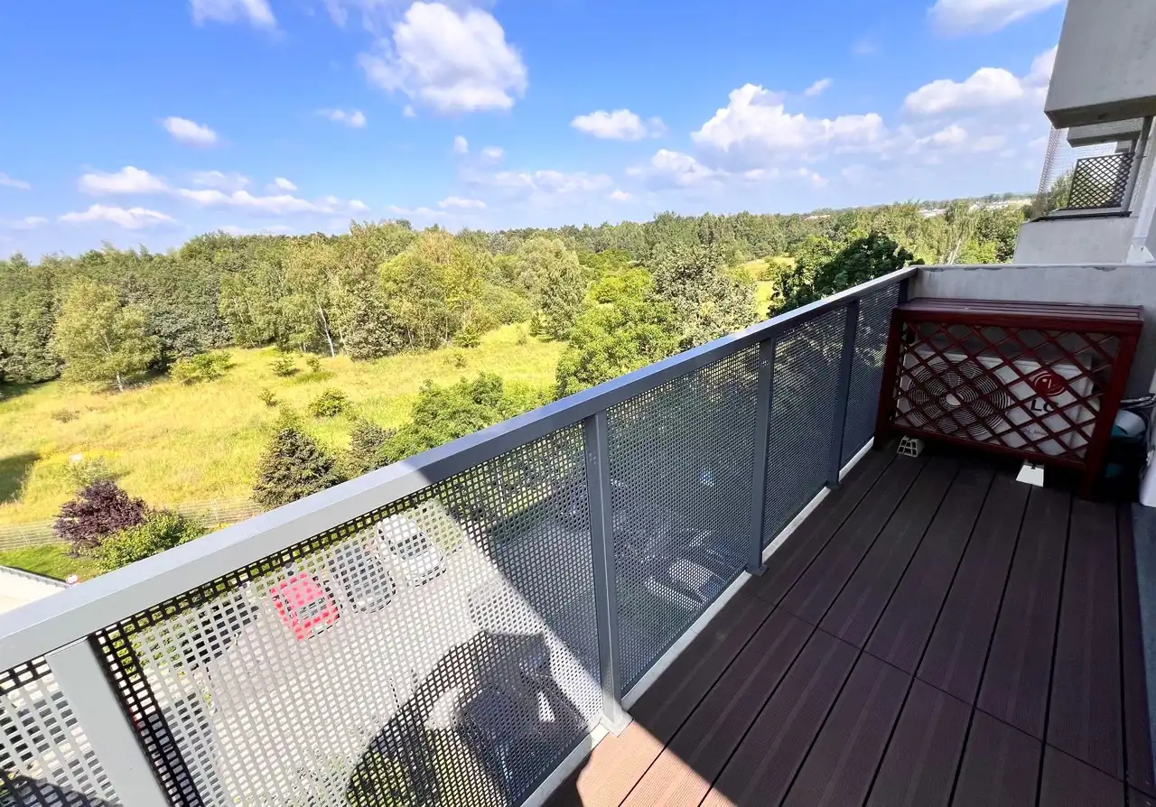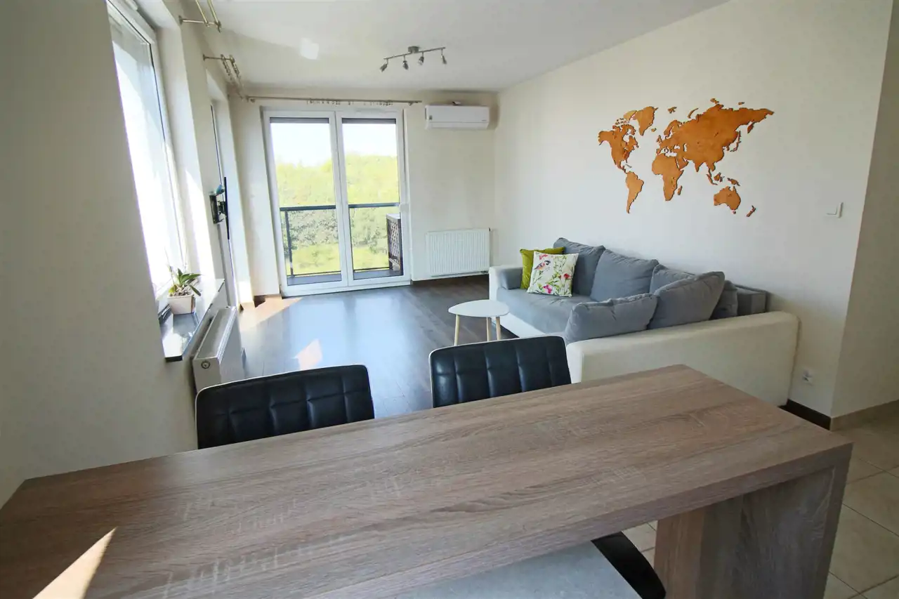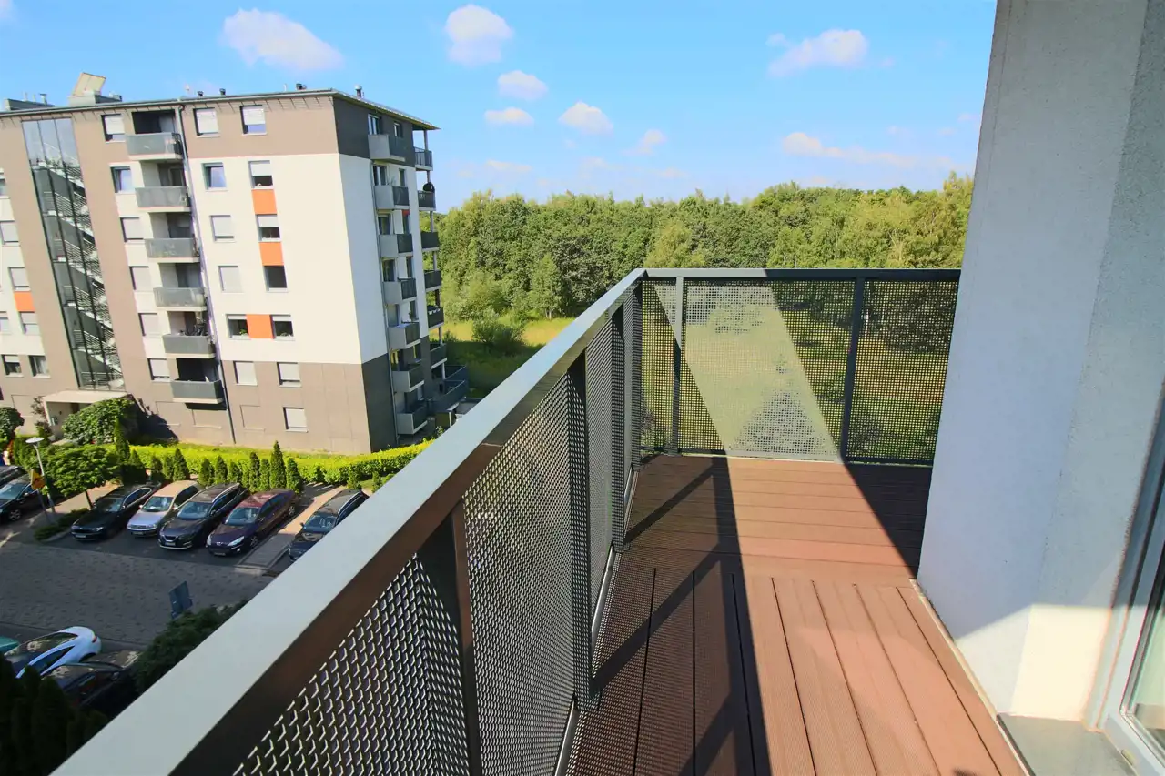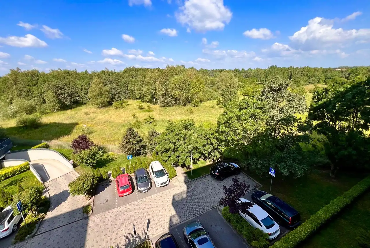Mieszkanie jest jasne, słoneczne, bardzo dobrze utrzymane, gotowe do natychmiastowego zamieszkania. Kuchnia z meblami w zabudowie z niezbędnym sprzętem AGD (lodówko zamrażalka, płyta, piekarnik, zmywarka). Pokój dzienny z wygodnym narożnikiem, bardzo dobrze doświetlony. Sypialnia z podwójnym łóżkiem z materacem, wyposażona w szafę. Drugi pokój - może służyć jako domowe biuro lub pokój gościnny/dziecięcy. W łazience wanna z parawanem prysznicowym oraz pralka. Dodatkowo wygodna i pojemna garderoba. Całość uzupełnia balkon (8m2) z pięknym widokiem na las.
