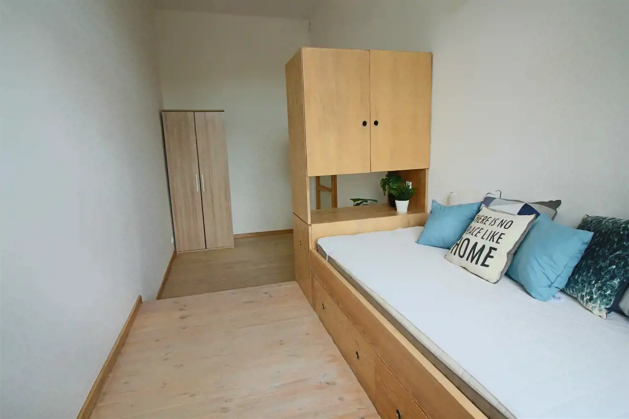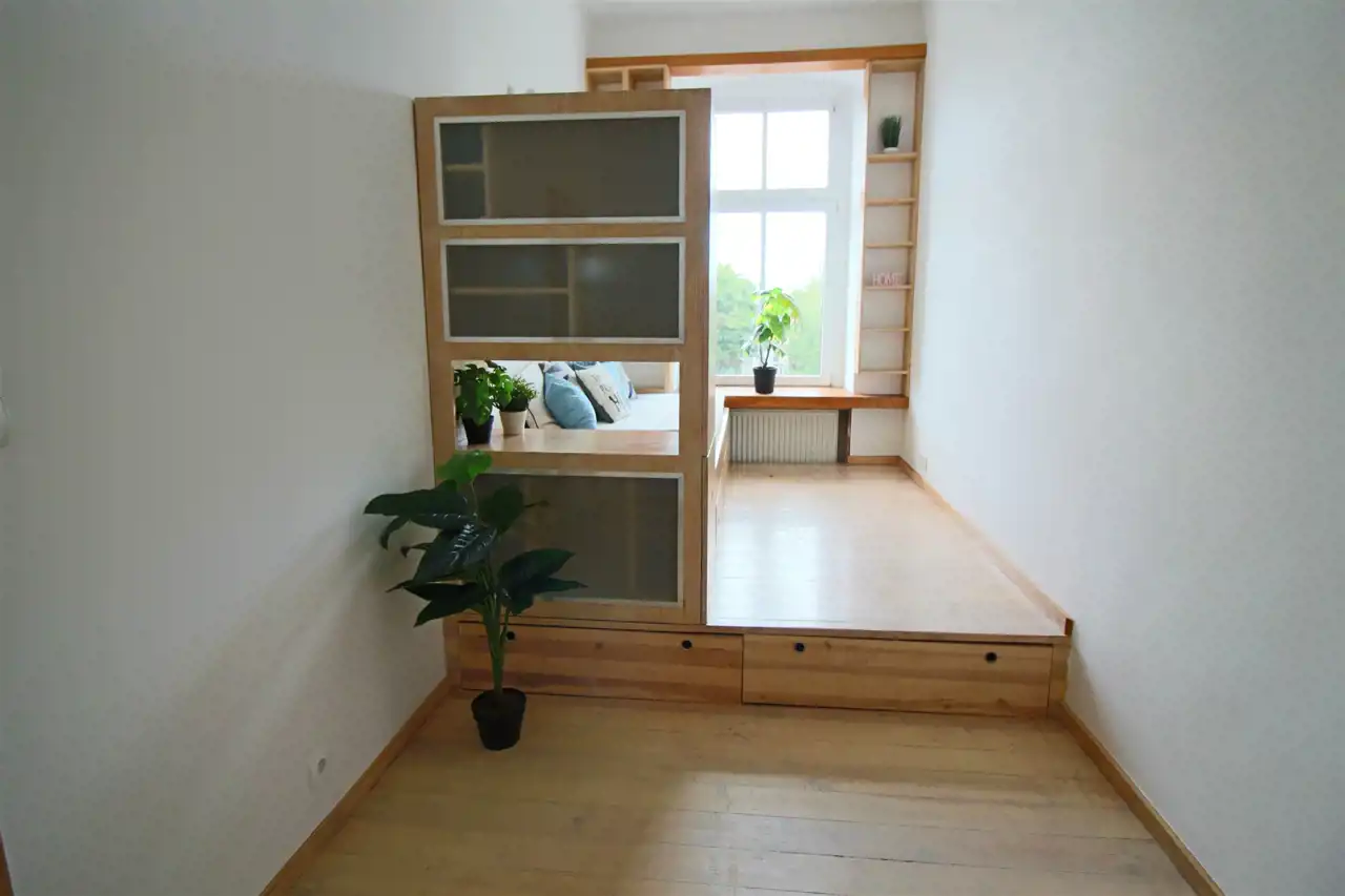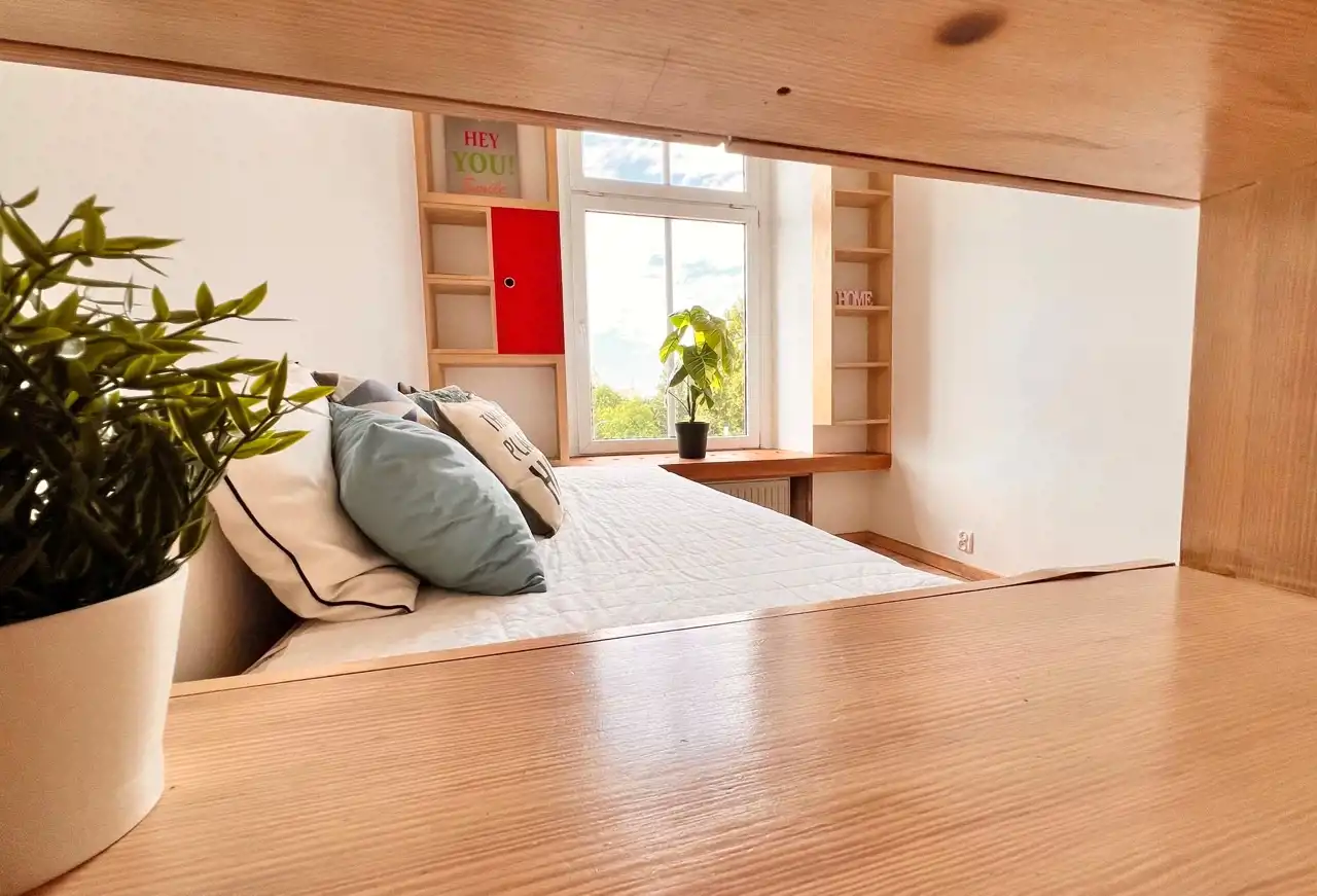- sypialnia z pojedynczym łóżkiem (+ dwa dodatkowe łóżka schowane w podeście),