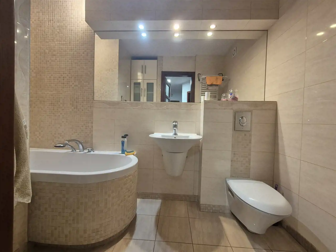 Łazienka razem z w-c z wanną z opcją prysznica w kaflach.