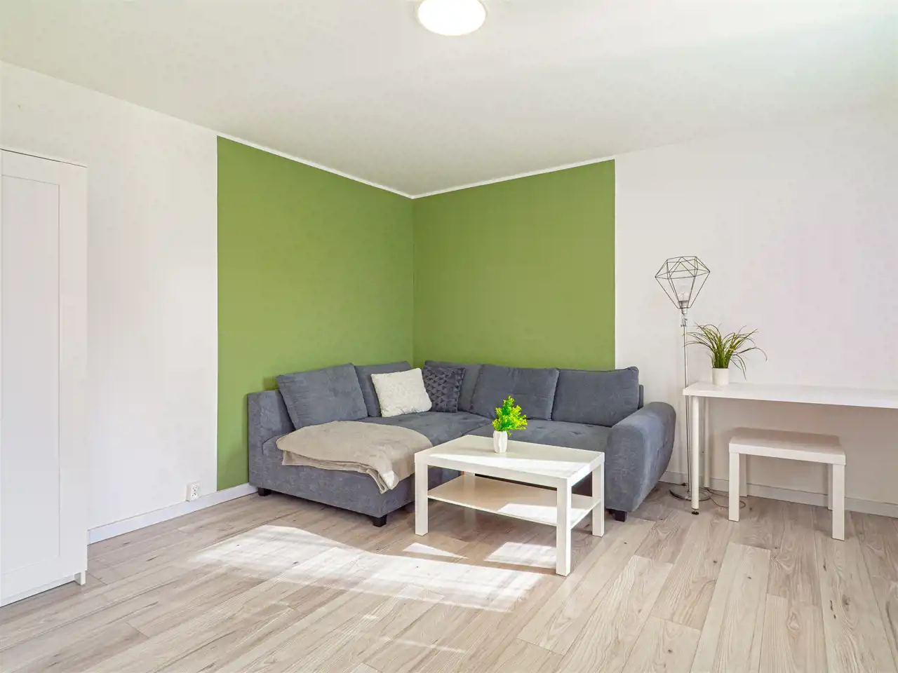 - Pokój 1 (większy, “salonowy”): Na wyposażeniu sofa, stolik, szafa, biurko. Z salonu wyjście na balkon.