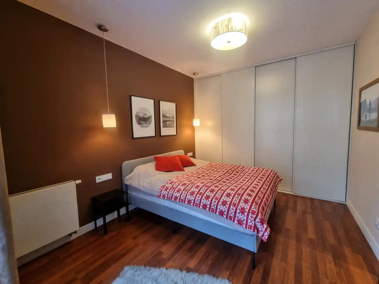 - Sypialni: Łóżko dwuosobowe, szafa w zabudowie na całej ścianie, wyjście na balkon.