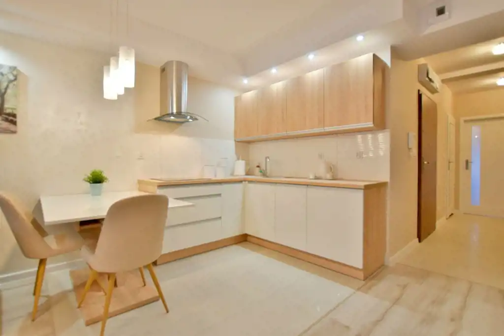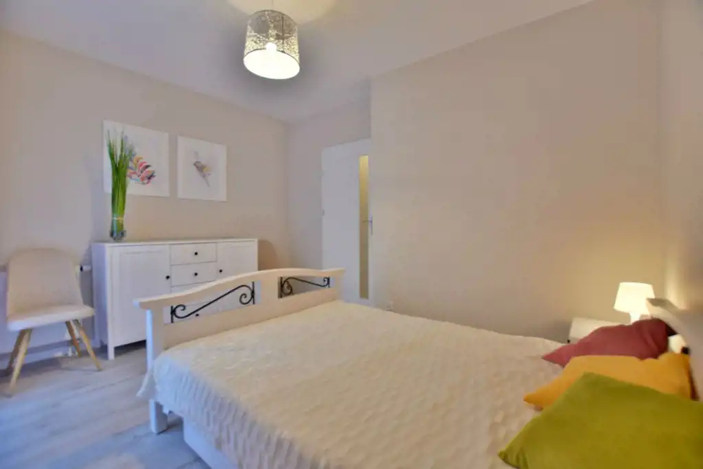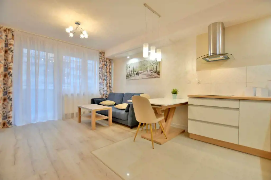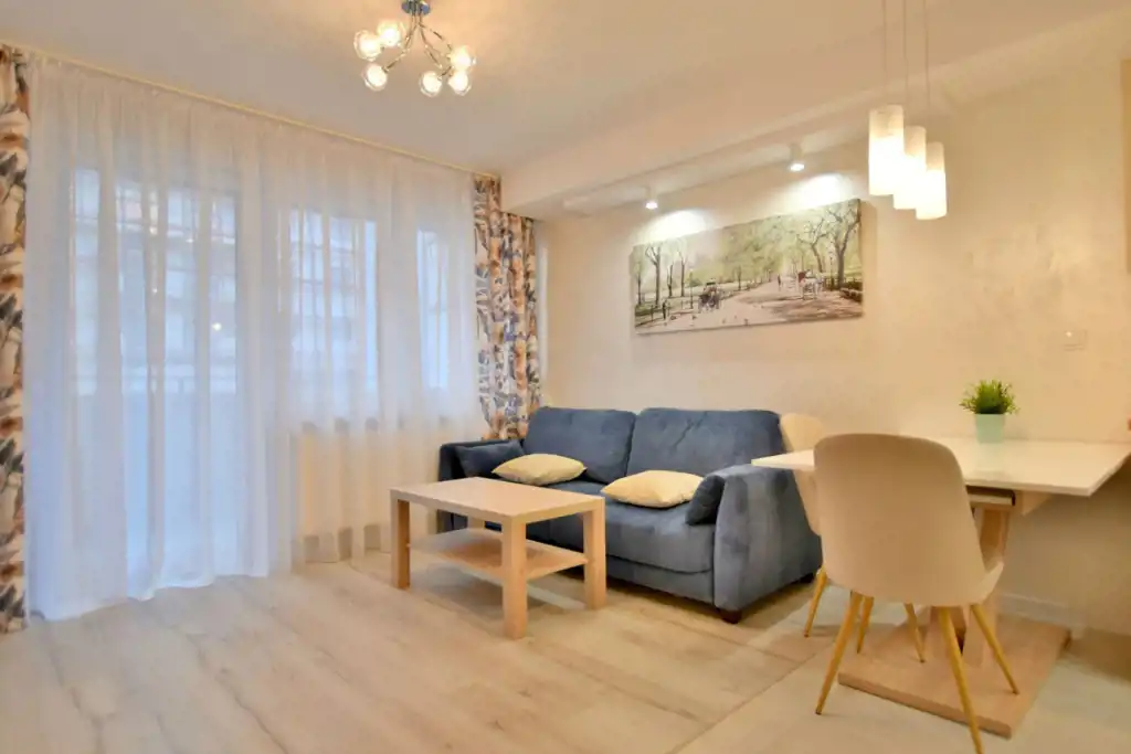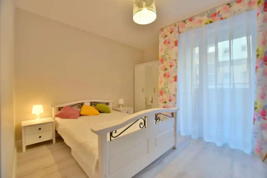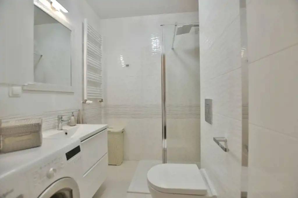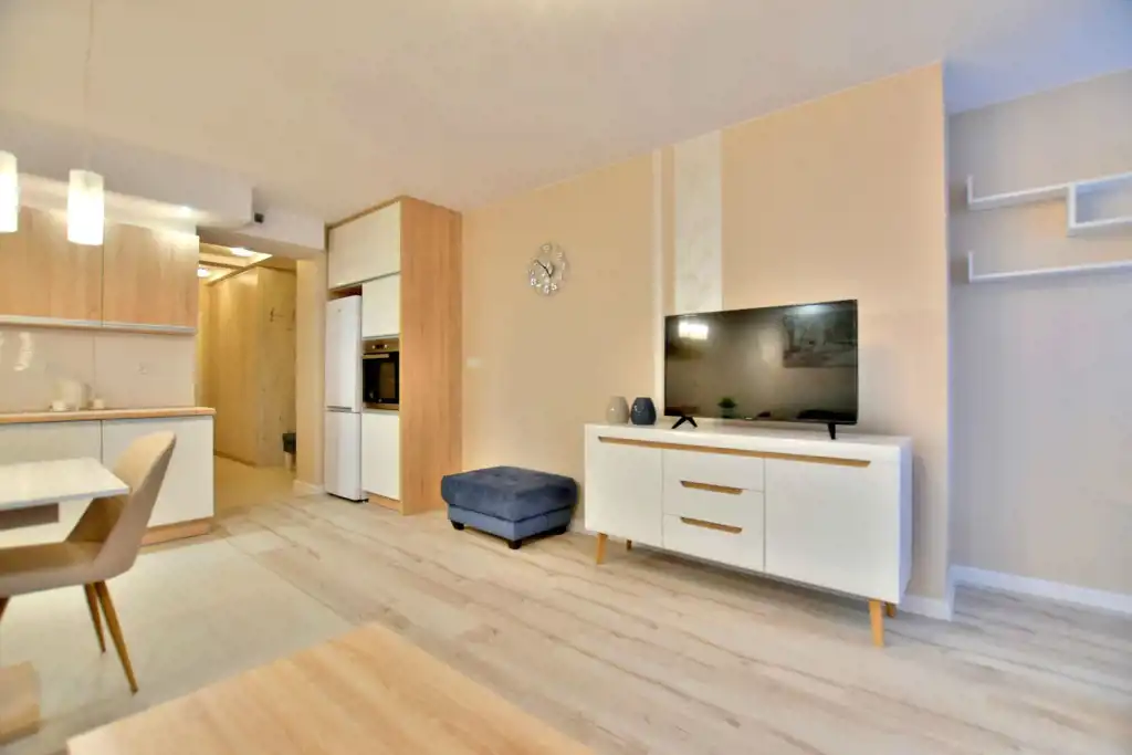 Mieszkanie składa się z w pełni wyposażonego, przestronnego salonu, z którego mamy wyjście bezpośrednio na balkon oraz nowoczesnego i w pełni wyposażonego aneksu kuchennego (pojemna lodówko-zamrażarka, piekarnik, zmywarka, płyta indukcyjna), sypialnia z wyjściem na 2 balkon, jak również gustownej łazienki z toaletą, a całość dopełnia przedpokój z dużą szafą.