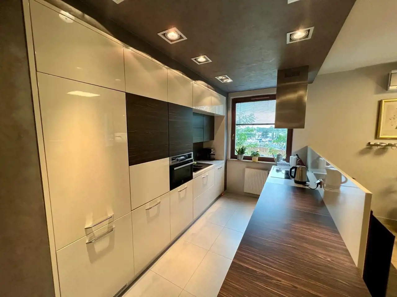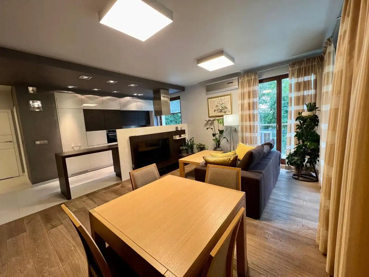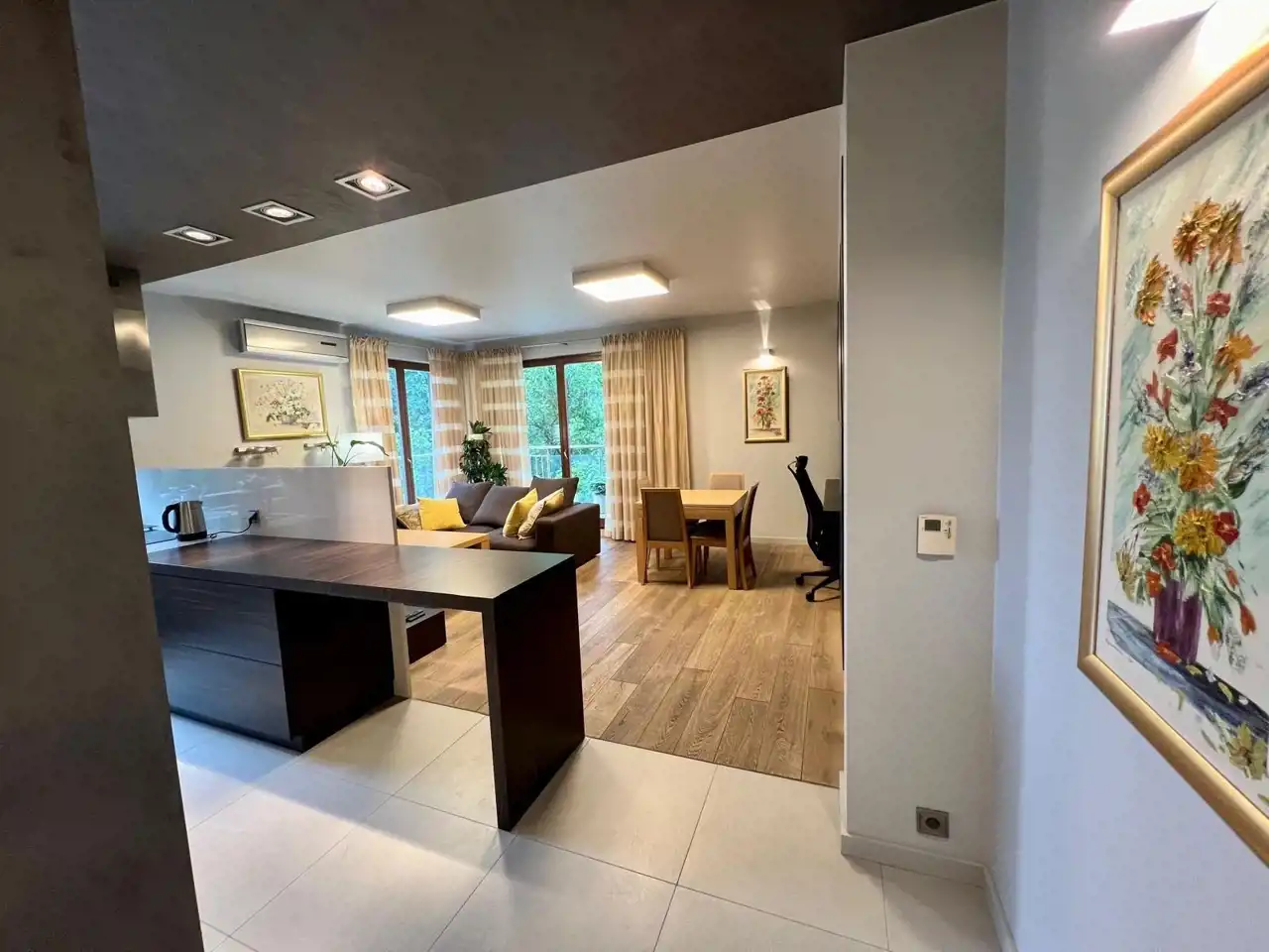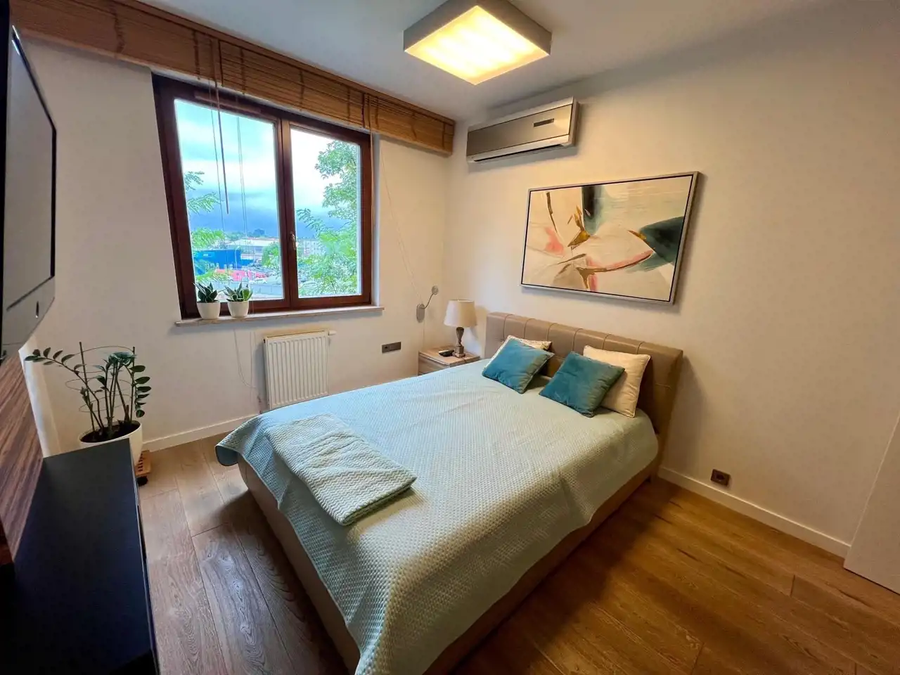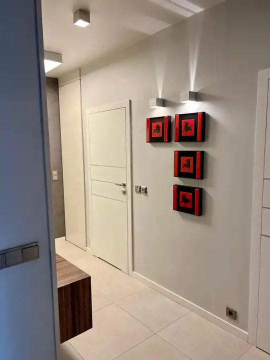 Niewątpliwym atutem mieszkania jest jego przestrzeń, przestronny salon połączony z kuchnią, wygodna garderoba, sypialnia, łazienka z prysznicem, duży hall. Mieszkanie jest w pełni wyposażone w meble oraz sprzęty AGD ( pralka, suszarka, zmywarka, lodówka, piekarnik, płyta). Sypialnia wyposażona w łóżko (140x200), szafę, TV, szafkę nocną. W salonie rozkładany stół, biurko do pracy, sofa, TV.