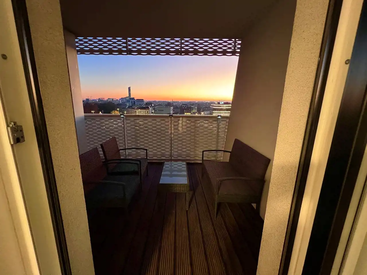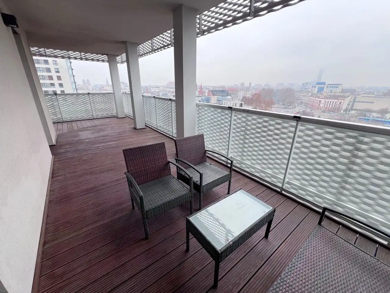 Apartament w pełni wyposażony i umeblowany. Kuchnia z meblami w zabudowie i sprzętem AGD, stół + 4 krzesła. Przestronny pokój dzienny z kanapą, fotelem, szafką rtv i tv. Z pokoju oraz z kuchni wyjście na TARAS - 40m2 z widokiem na Centrum Wrocławia. Sypialnia z wygodnym łóżkiem oraz pojemnymi szafami w zabudowie. W łazience prysznic i pralka. W przedpokoju dodatkowa szafa.