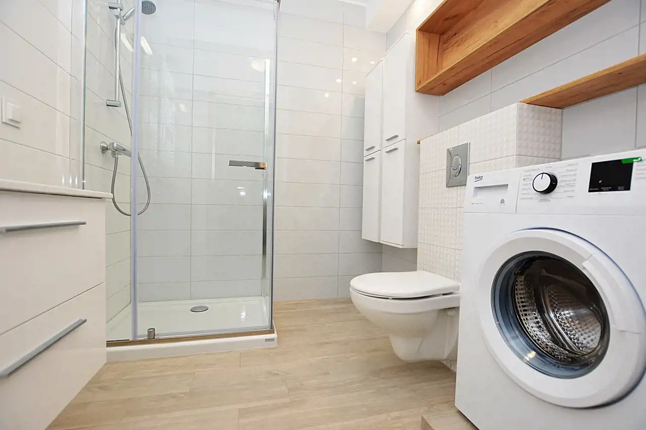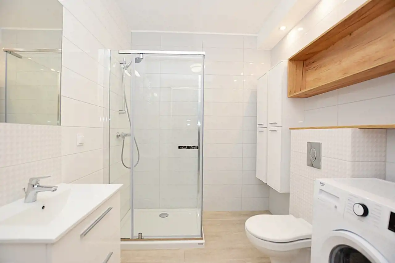- łazienka z kabiną prysznicową.