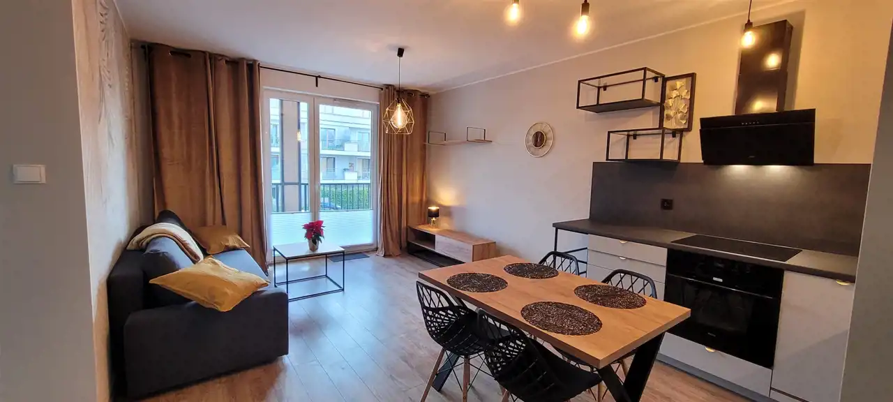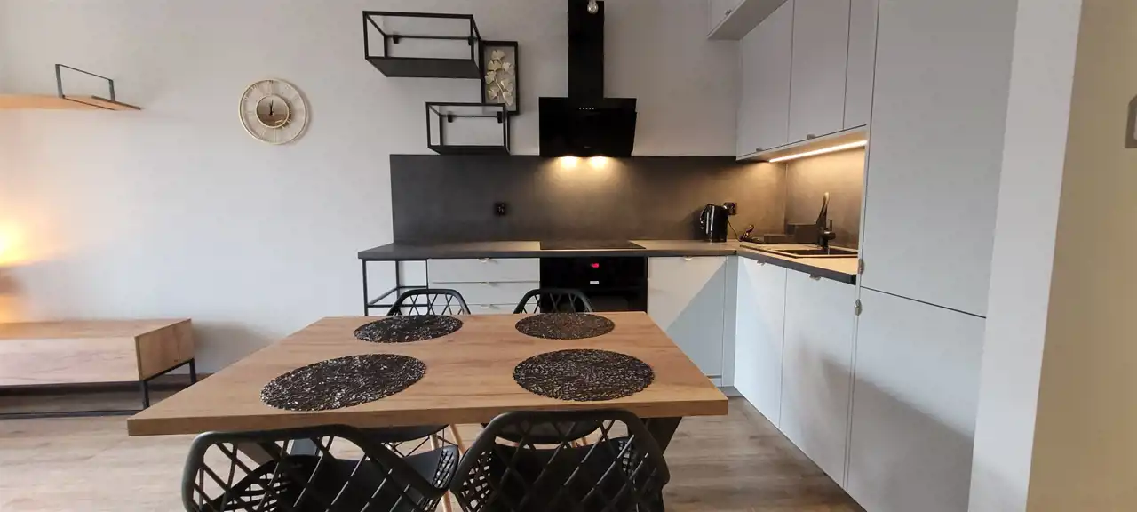 Umeblowane, nowa kuchnia wraz z kompletnym sprzętem AGD (płyta indukcyjna, piekarnik, zmywarka, pochłaniacz, lodówko-zamrażarka) oraz podstawowe wyposażenie (czajnik, talerze, sztućce, garnki).