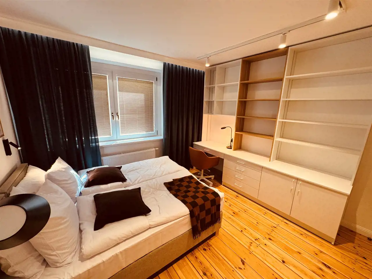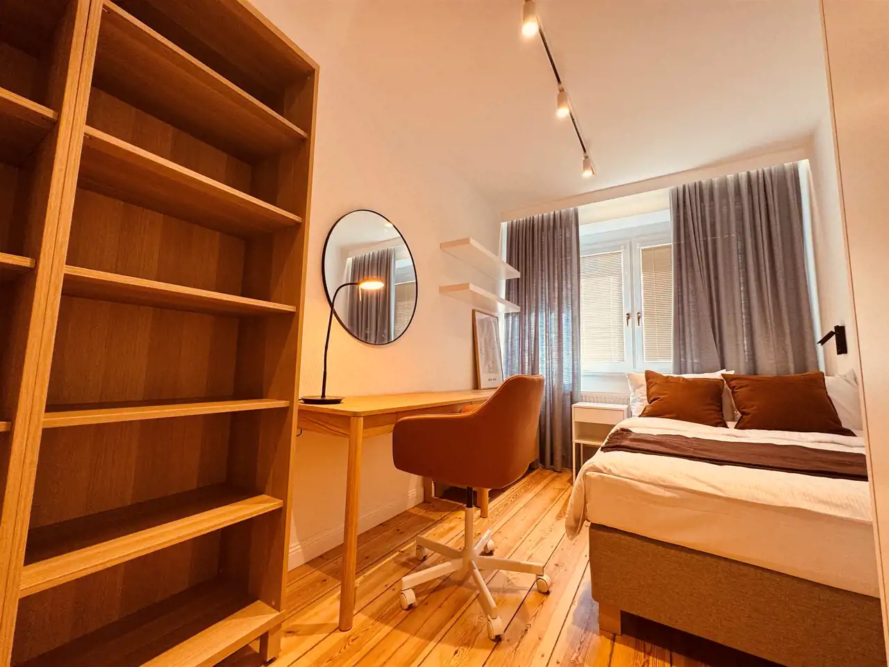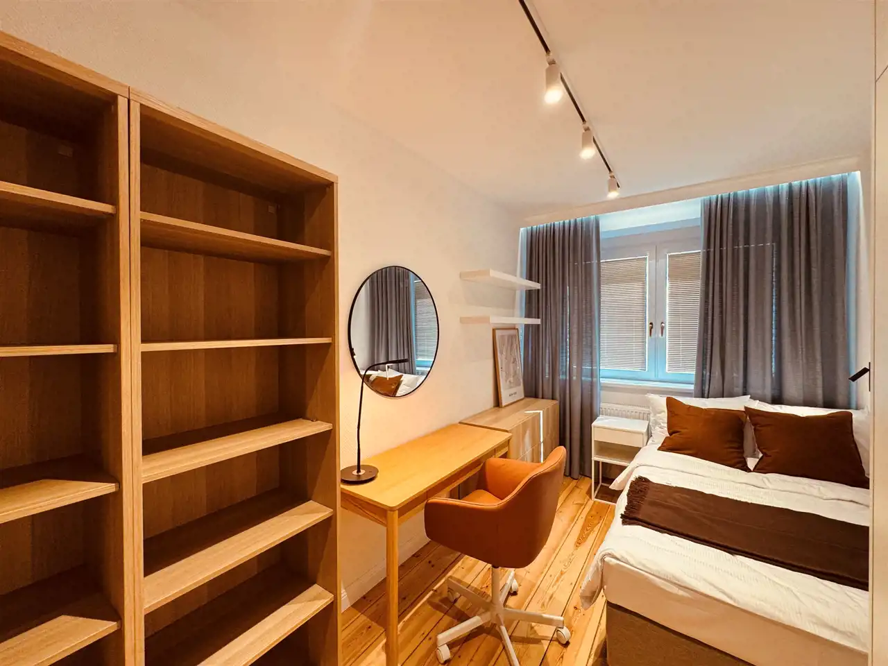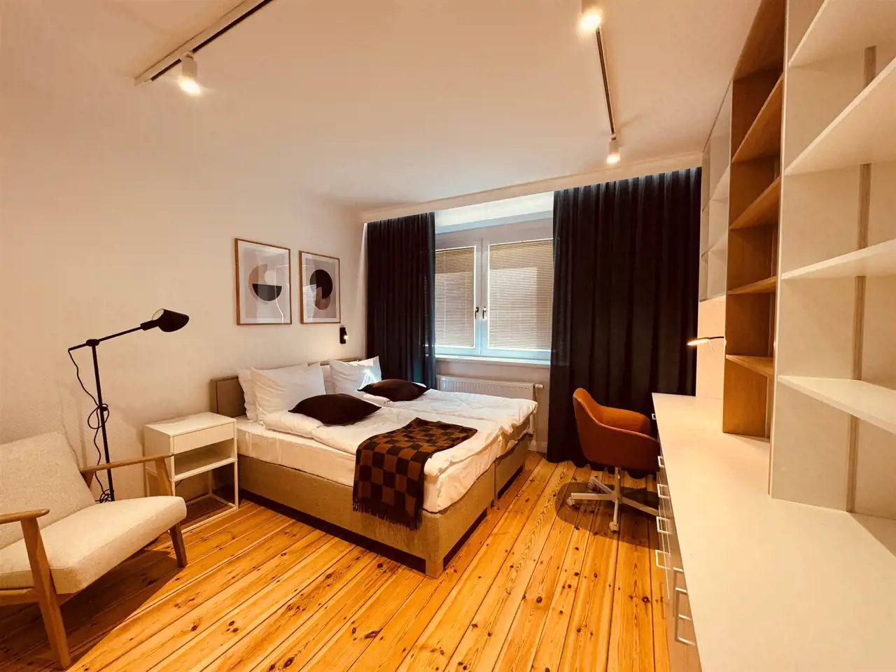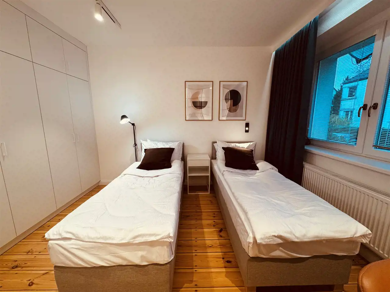 - 2 fully furnished rooms (approx. 16 m² and 12 m²), each with a bed (continental bed in the larger room, can be separated into two singles), wardrobe, bookshelf, desk, and chair