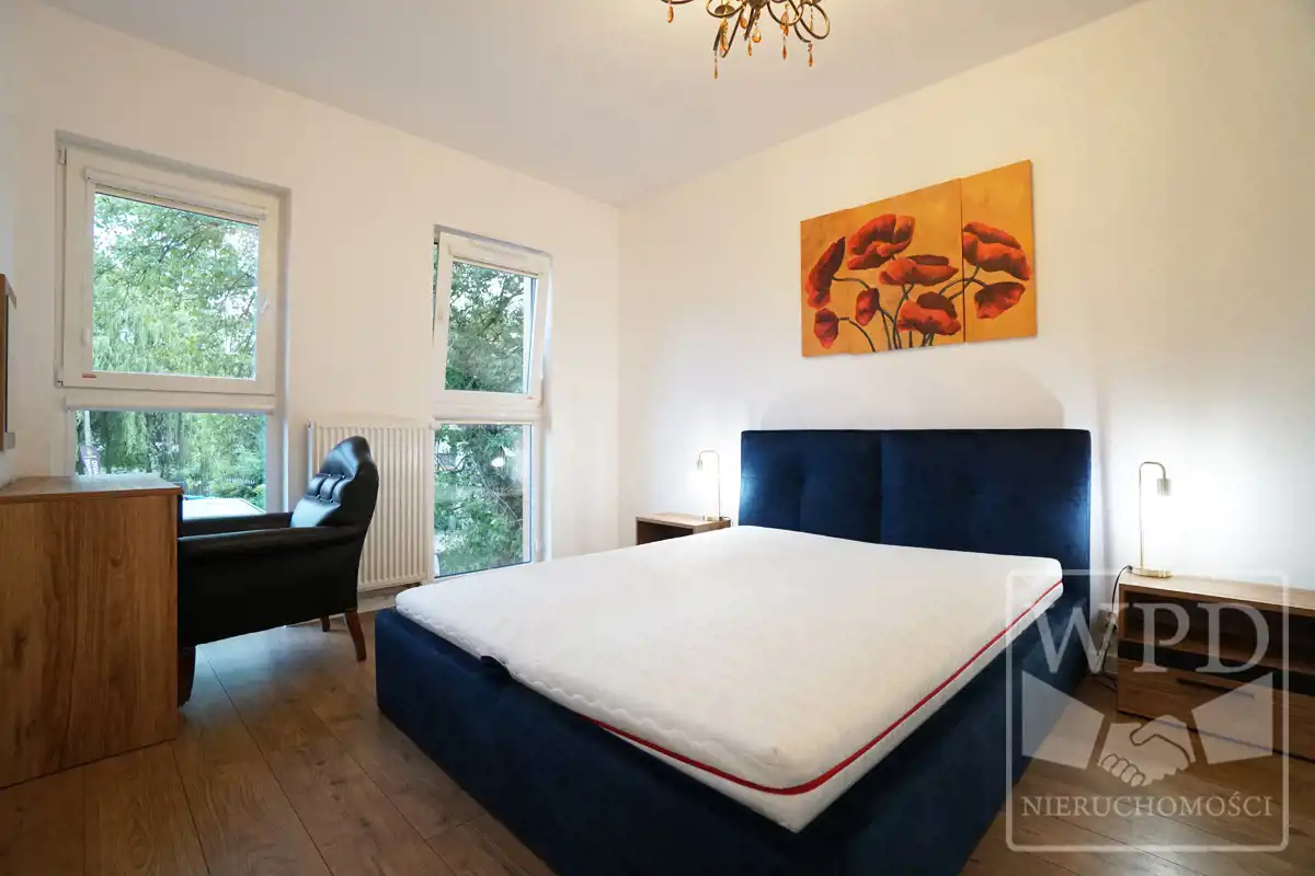 wygodne łóżko, szafa w zabudowie, szafka nocna, biurko, fotel