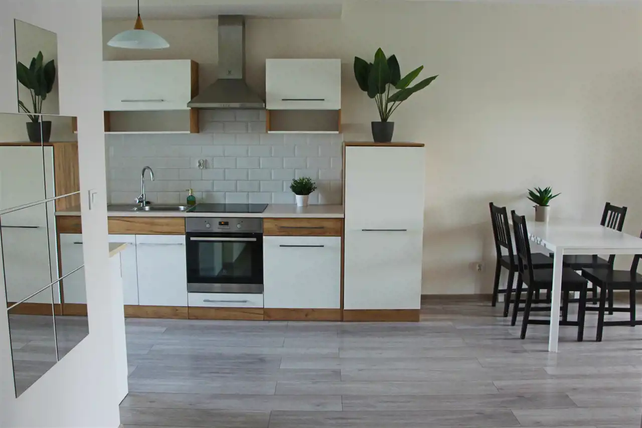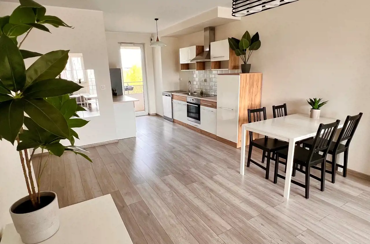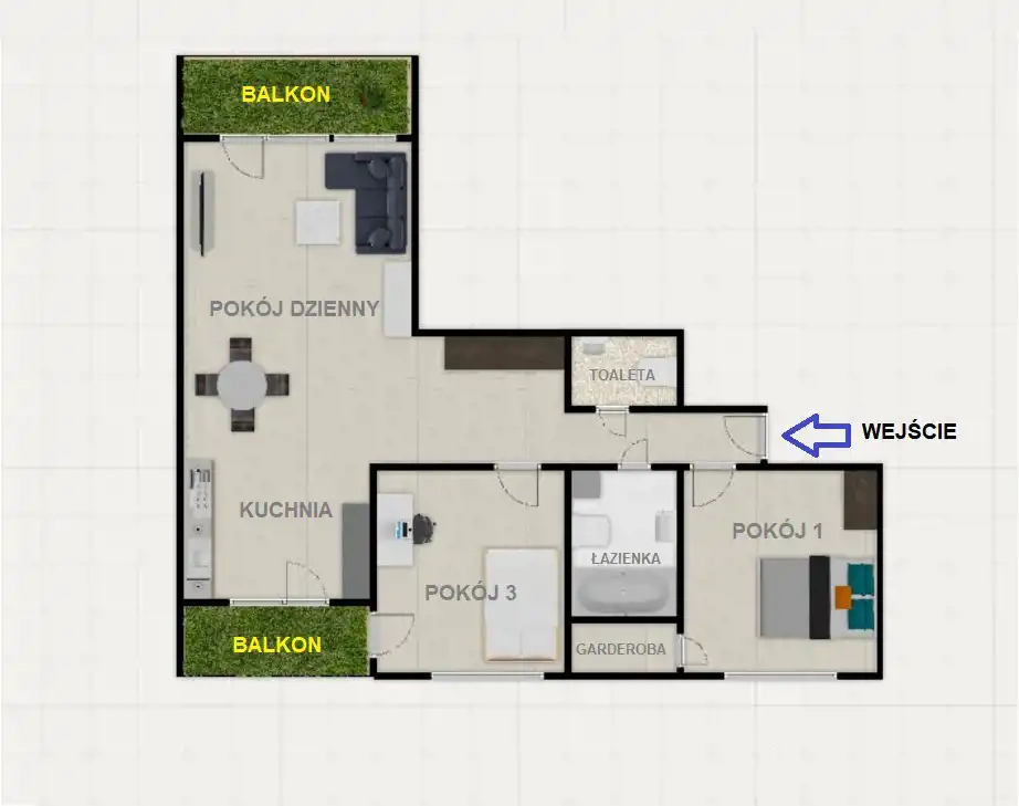 - pokój dzienny połączony z kuchnią z wyjściem na dwa balkony,