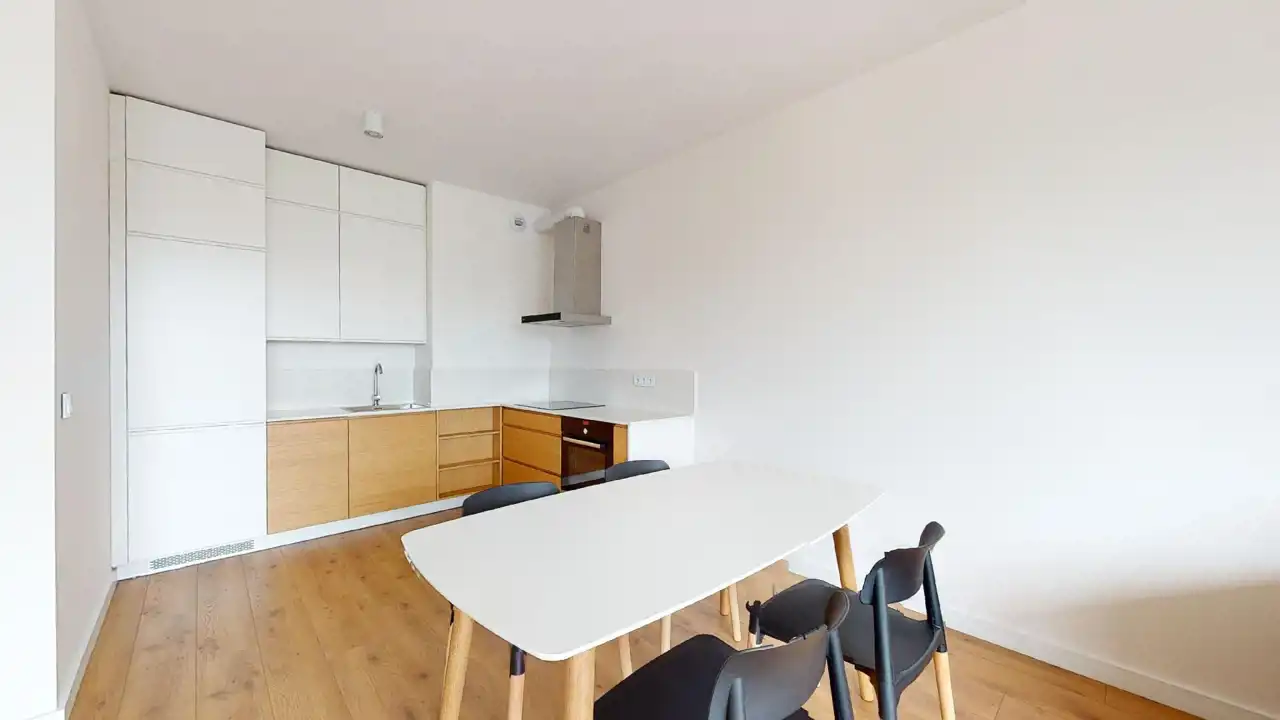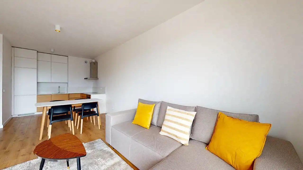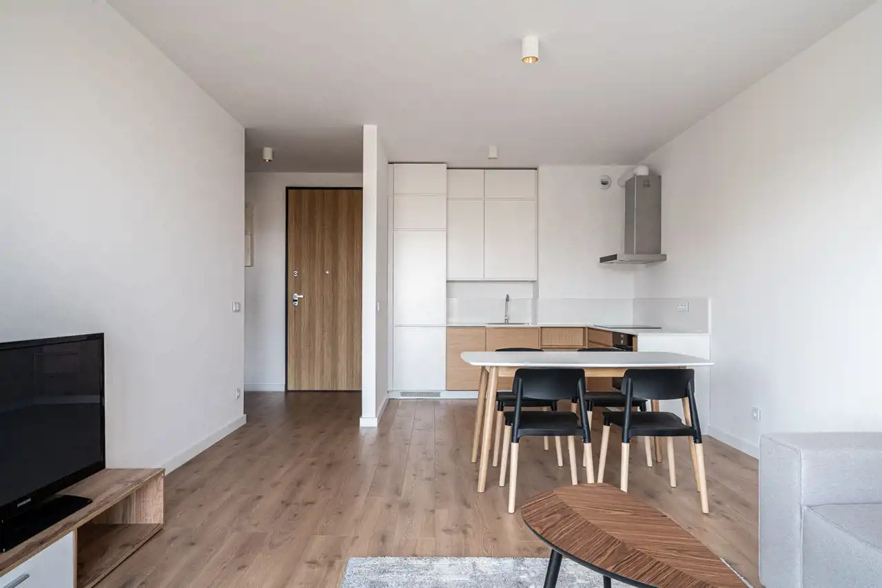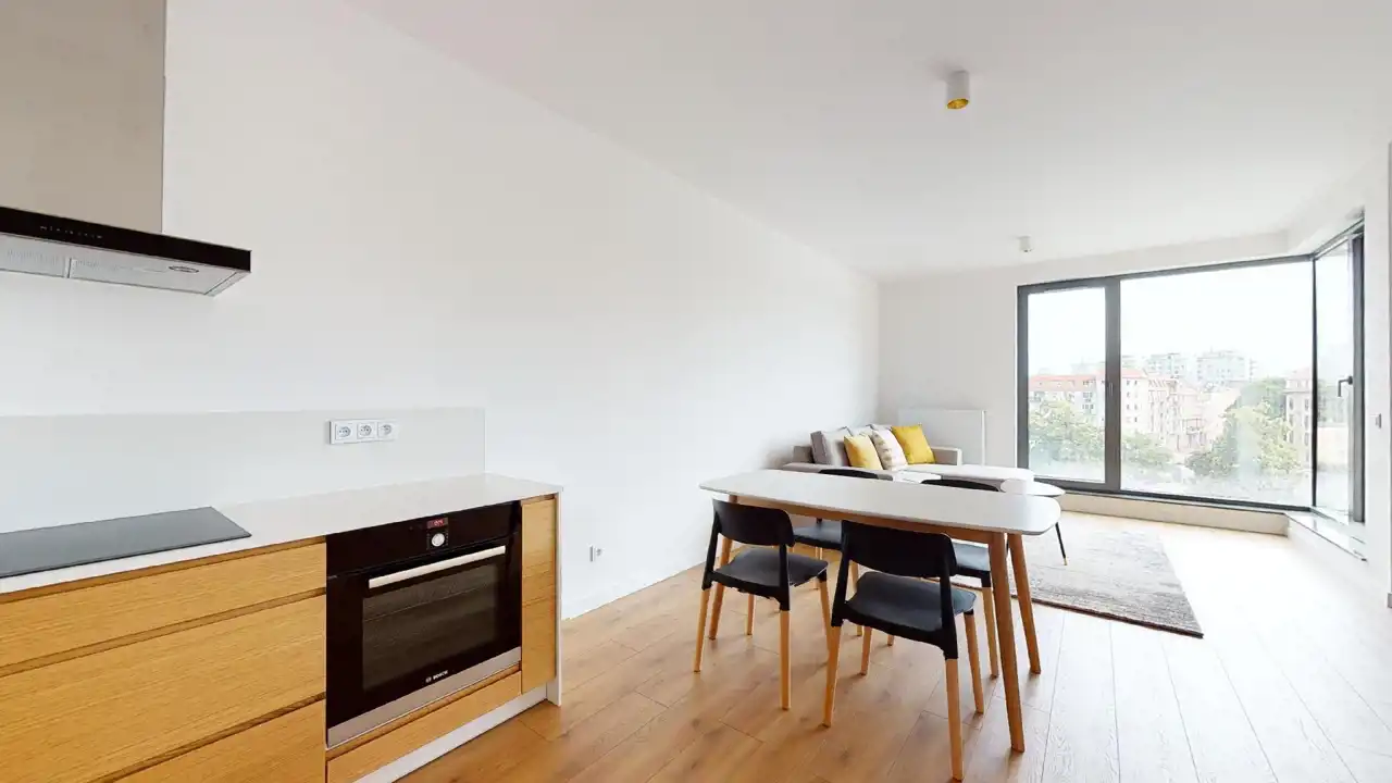 Gdy przekraczasz próg, od razu czujesz, że wszystko jest tu na swoim miejscu. Przestronny salon z aneksem kuchennym to serce mieszkania – jasna, otwarta przestrzeń, w której można zarówno odpoczywać, jak i przyjmować gości. Ciepłe światło wpada przez duże okna, meble są nowe, starannie dobrane – żadne przypadkowe „co się nawinęło”, tylko przemyślany komfort.