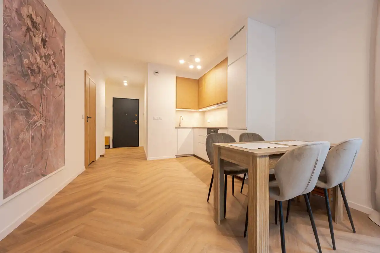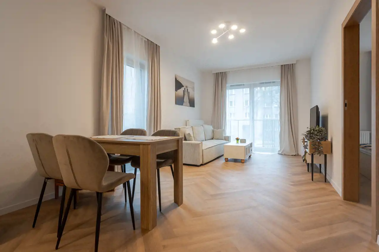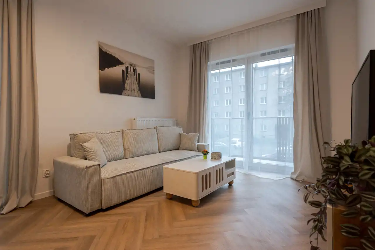 Mieszkanie jest świeżo wykończone, jeszcze pachnie nowością. Wnętrze zaprojektowane zostało z myślą o komforcie i funkcjonalności – jest schludne, przytulne i bardzo estetyczne. Układ obejmuje salon z aneksem kuchennym, oddzielną sypialnię oraz nowoczesną łazienkę.