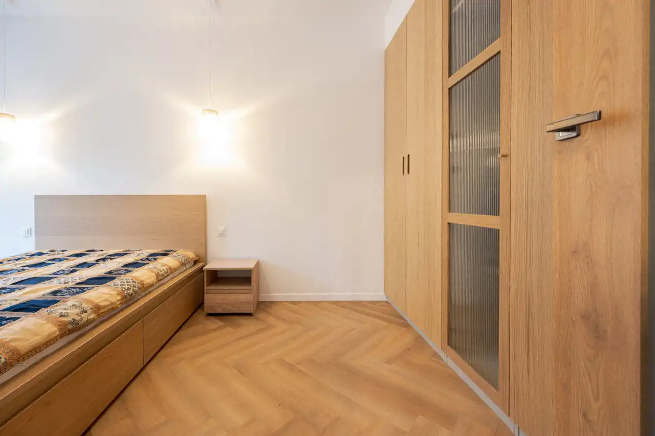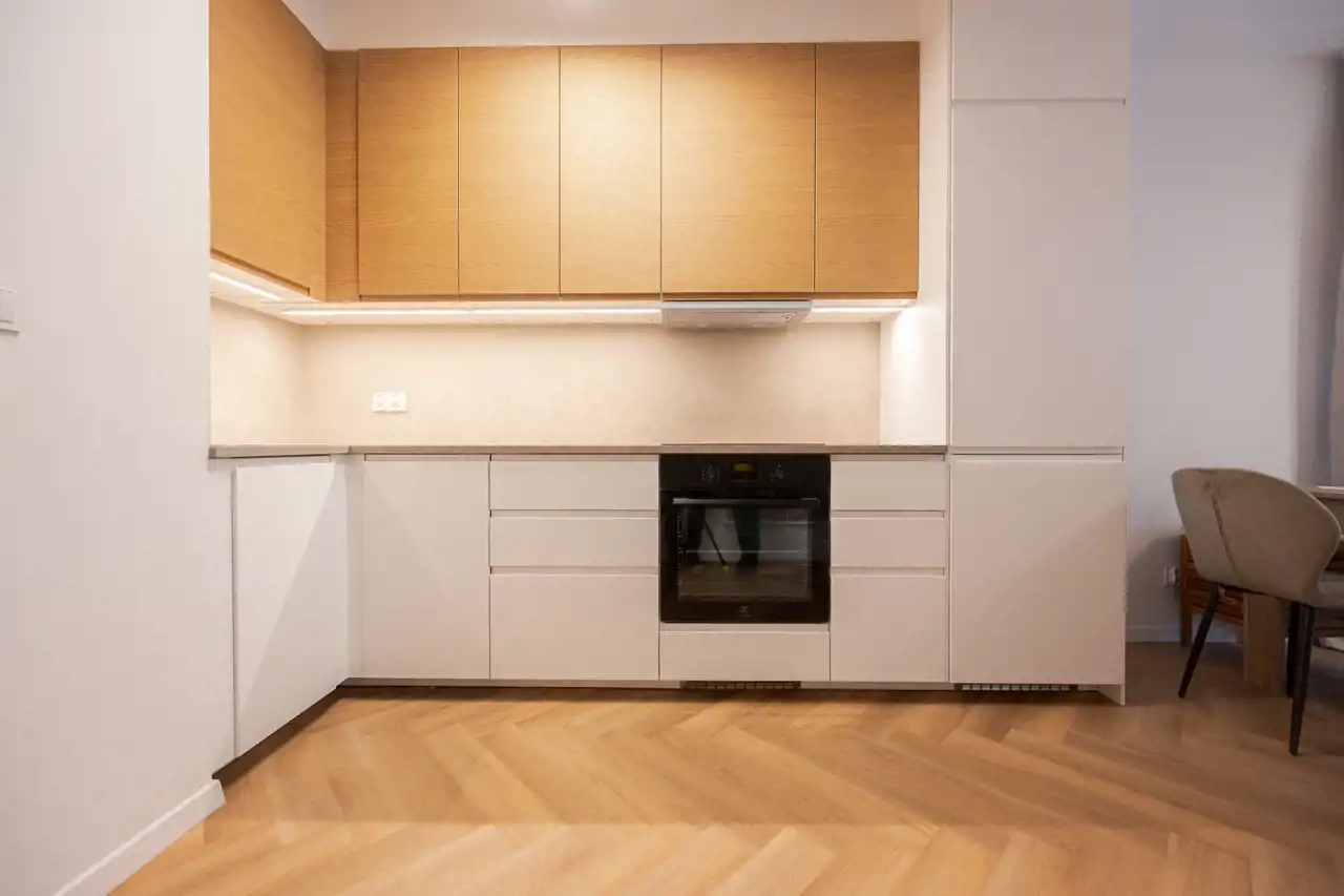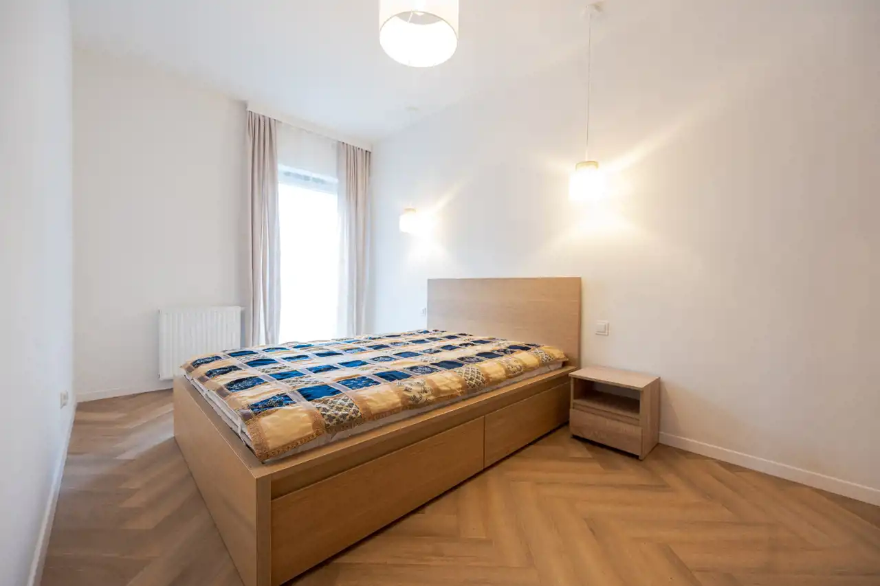 Mieszkanie jest świeżo wykończone, jeszcze pachnie nowością. Wnętrze zaprojektowane zostało z myślą o komforcie i funkcjonalności – jest schludne, przytulne i bardzo estetyczne. Układ obejmuje salon z aneksem kuchennym, oddzielną sypialnię oraz nowoczesną łazienkę.