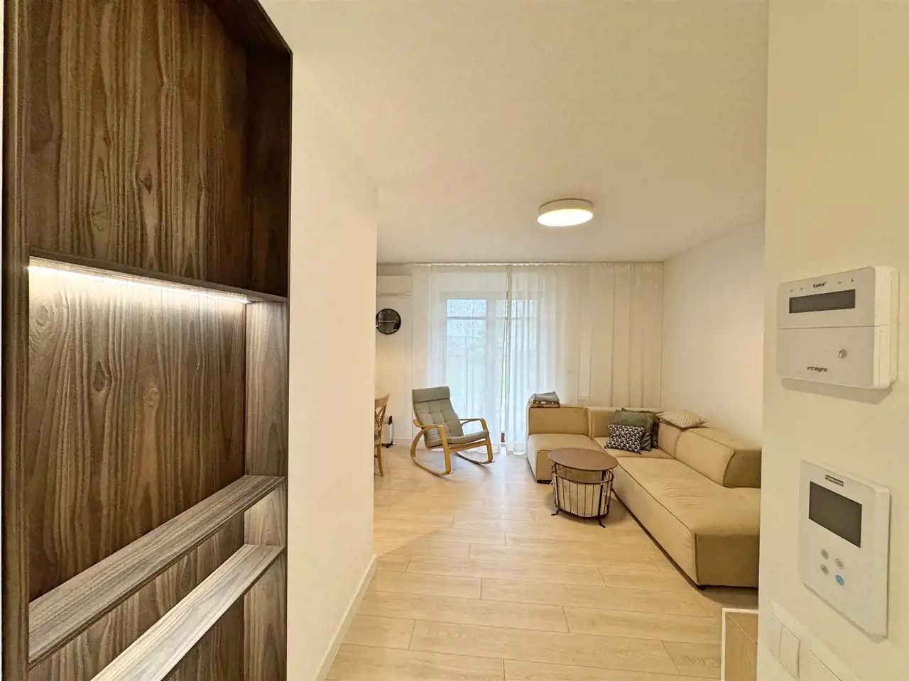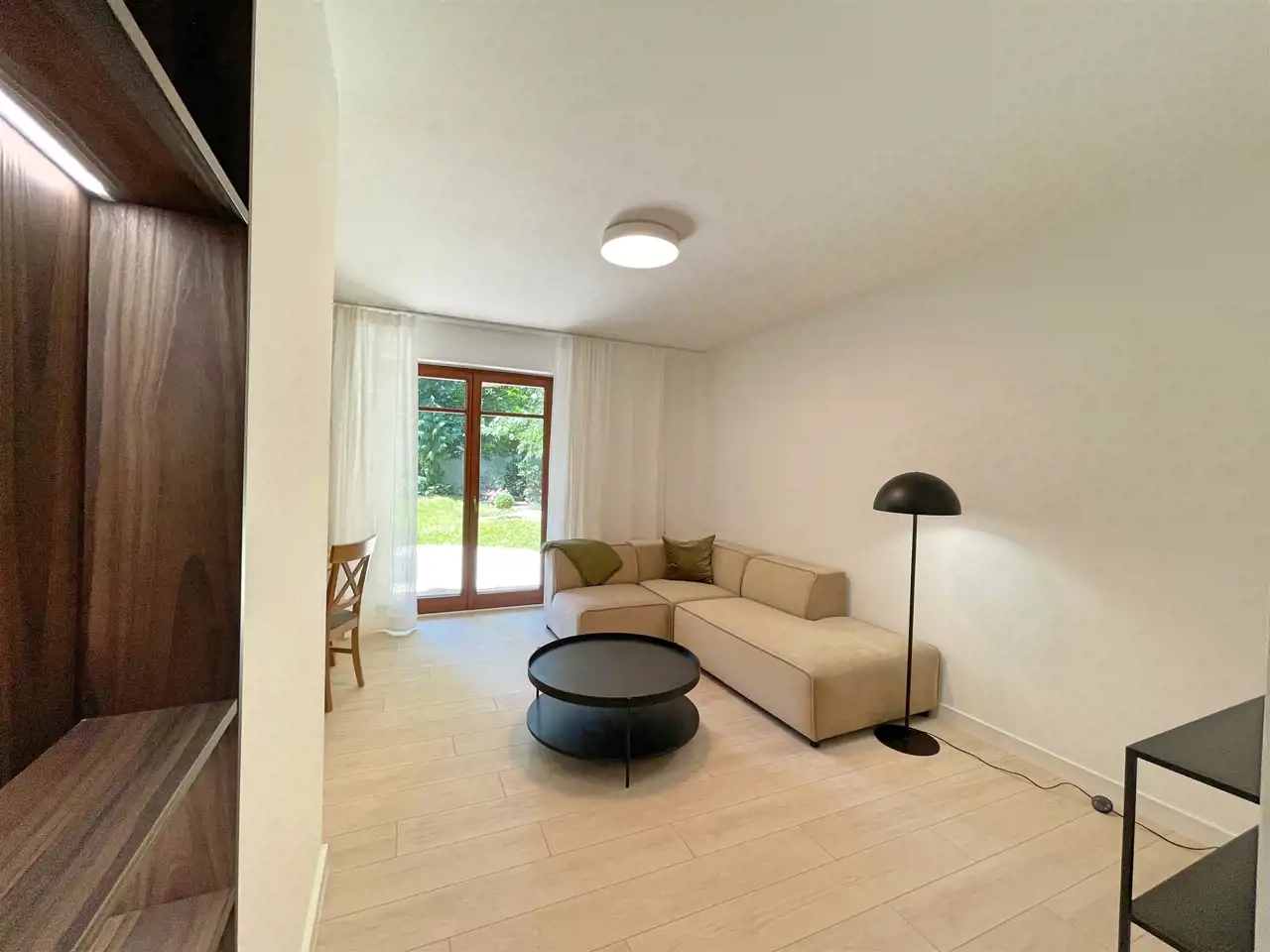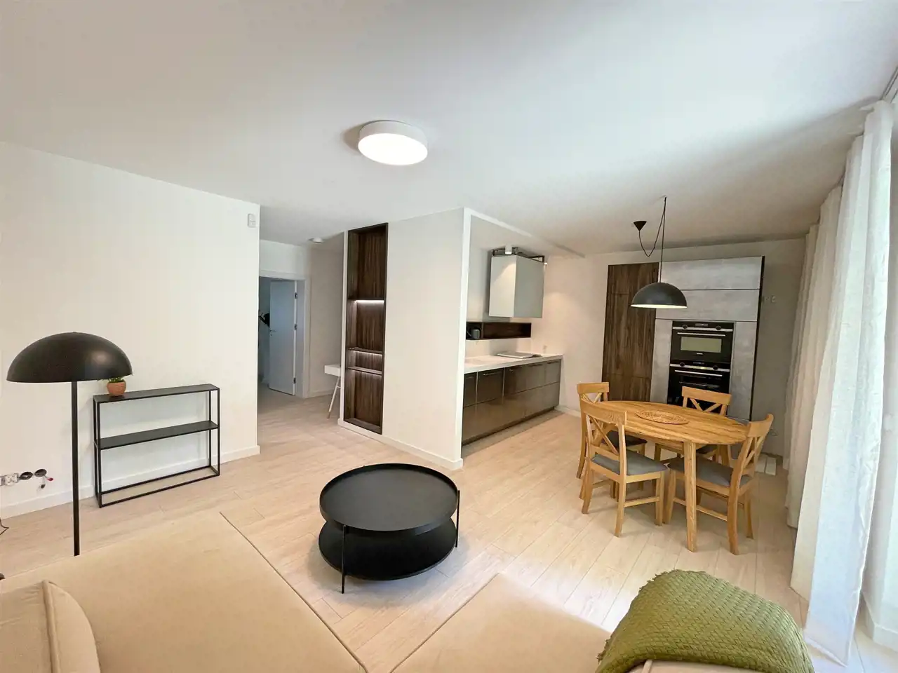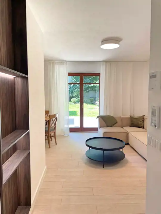 Już od progu czuć harmonię przestrzeni – jasny, przestronny salon płynnie łączy się z nowoczesną kuchnią, tworząc idealne miejsce do życia i spotkań. Z salonu prowadzi wyjście na taras, który staje się naturalnym przedłużeniem mieszkania – prywatną strefą relaksu z widokiem na zadbane, zielone patio.
