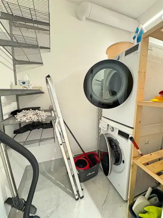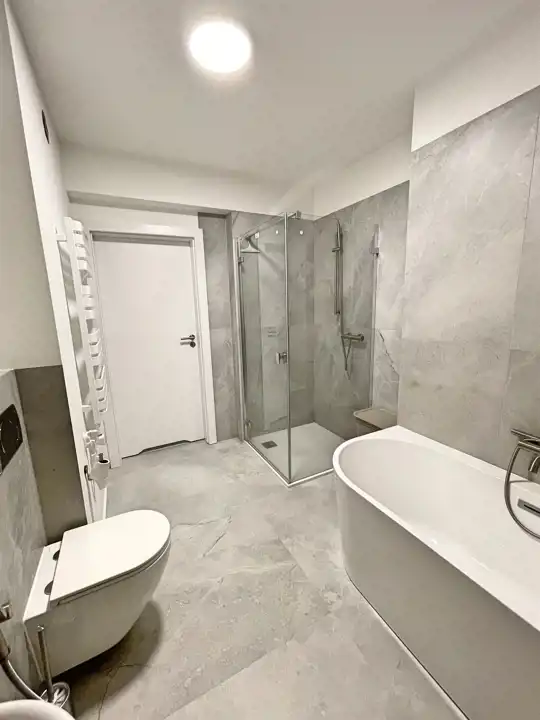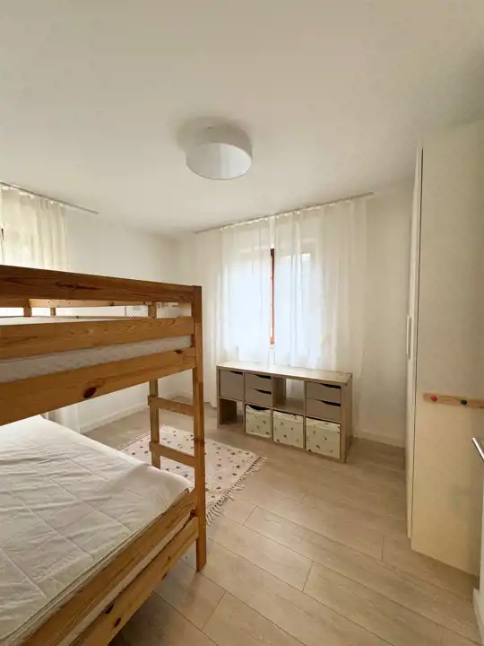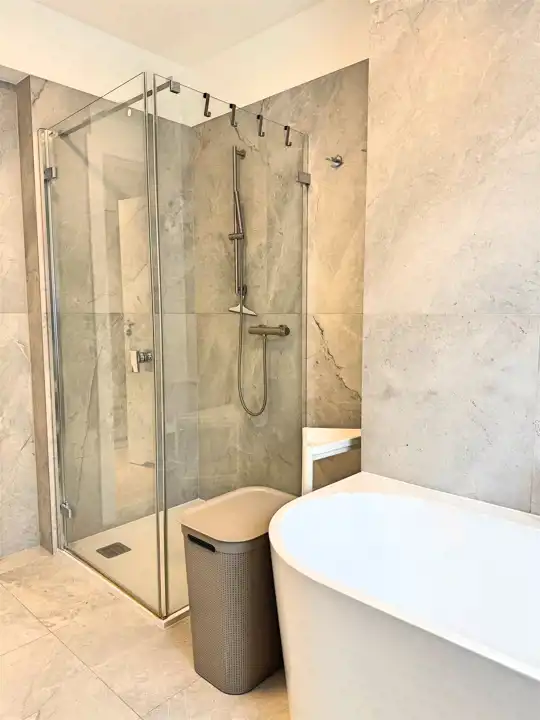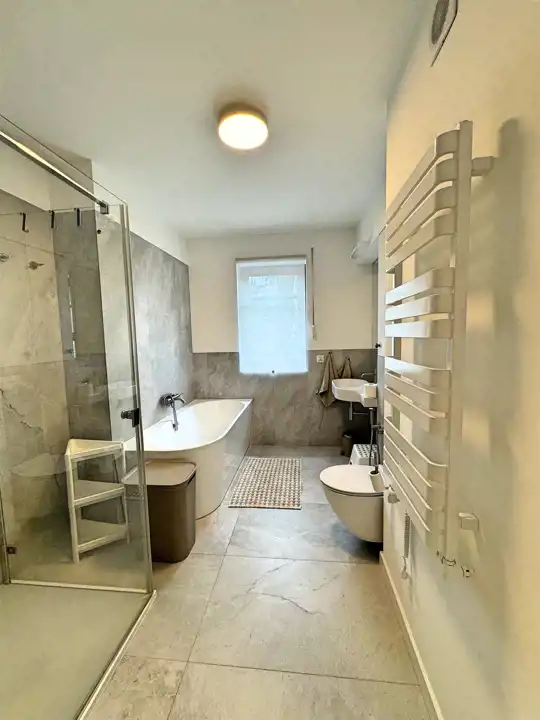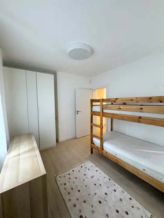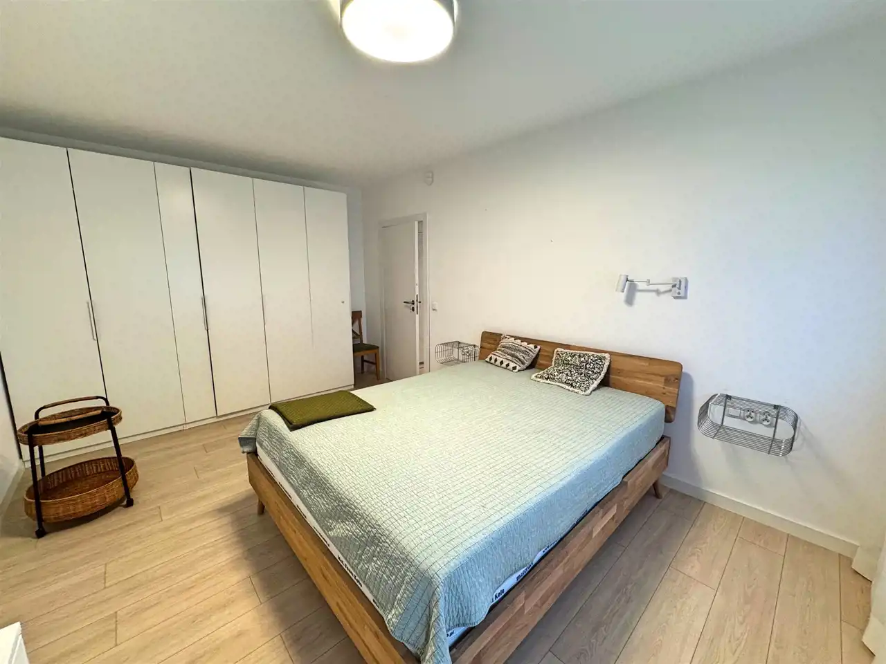 Mieszkanie oferuje również komfortową, dużą sypialnię z podwójnym łóżkiem i pojemną zabudową, a także drugi pokój – doskonały jako gabinet lub pokój dziecięcy. Funkcjonalność podkreśla przestronna łazienka wyposażona zarówno w wannę, jak i prysznic, a także osobne pomieszczenie gospodarcze z pralką i suszarką.