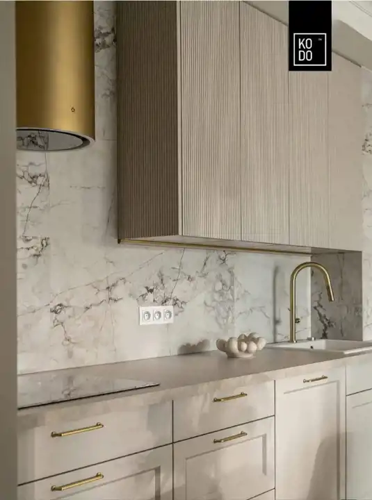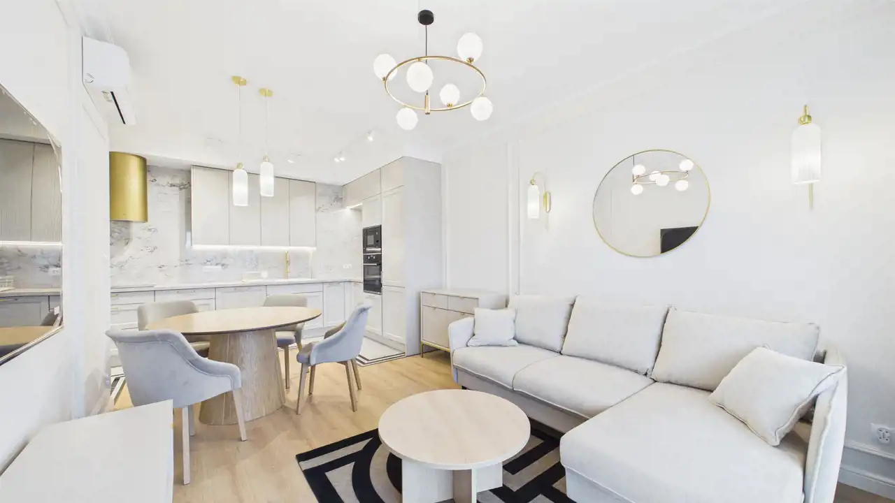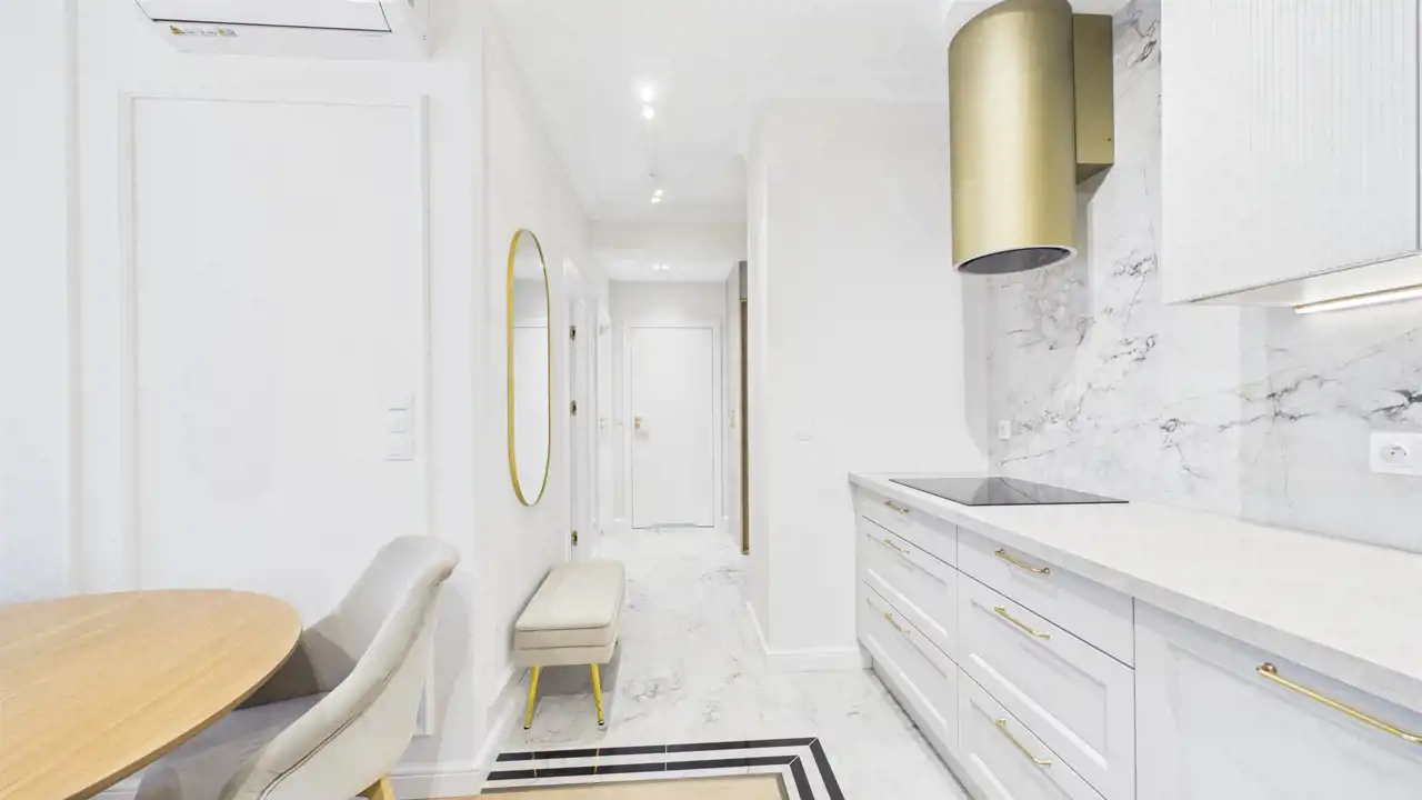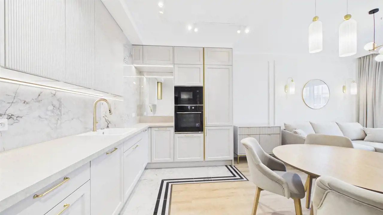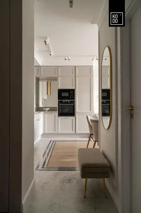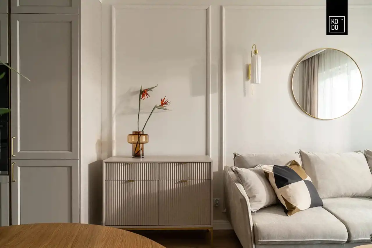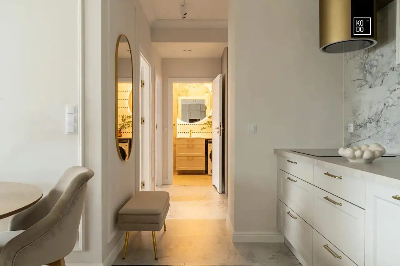 Przestronny i przytulny salon z aneksem kuchennym zachwyca klasycznymi sztukateriami, frezowanymi frontami mebli oraz subtelnymi złotymi detalami w uchwytach i oświetleniu. Z salonu prowadzi wyjście na balkon, który stanowi dodatkową przestrzeń do relaksu. Wnętrze łączy elegancję z funkcjonalnością – to idealna przestrzeń do codziennego życia i spotkań.