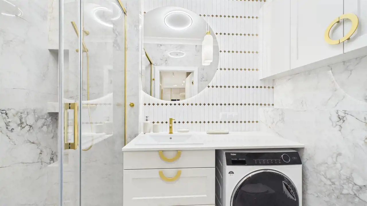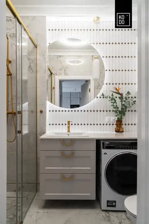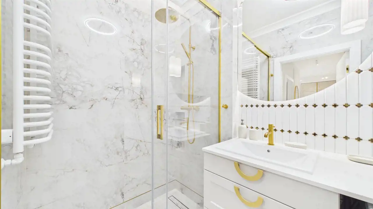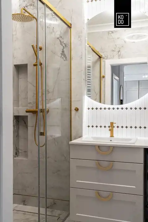 Nowoczesna, elegancka łazienka z przestronną kabiną prysznicową, praktyczną zabudową oraz nastrojowym oświetleniem. Zastosowano efektowną mozaikę i płytki z motywem kamienia, które podkreślają luksusowy charakter wnętrza.