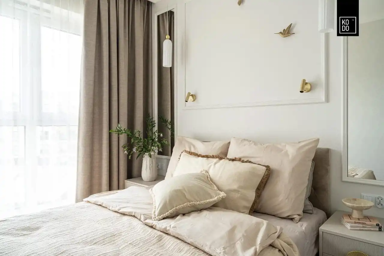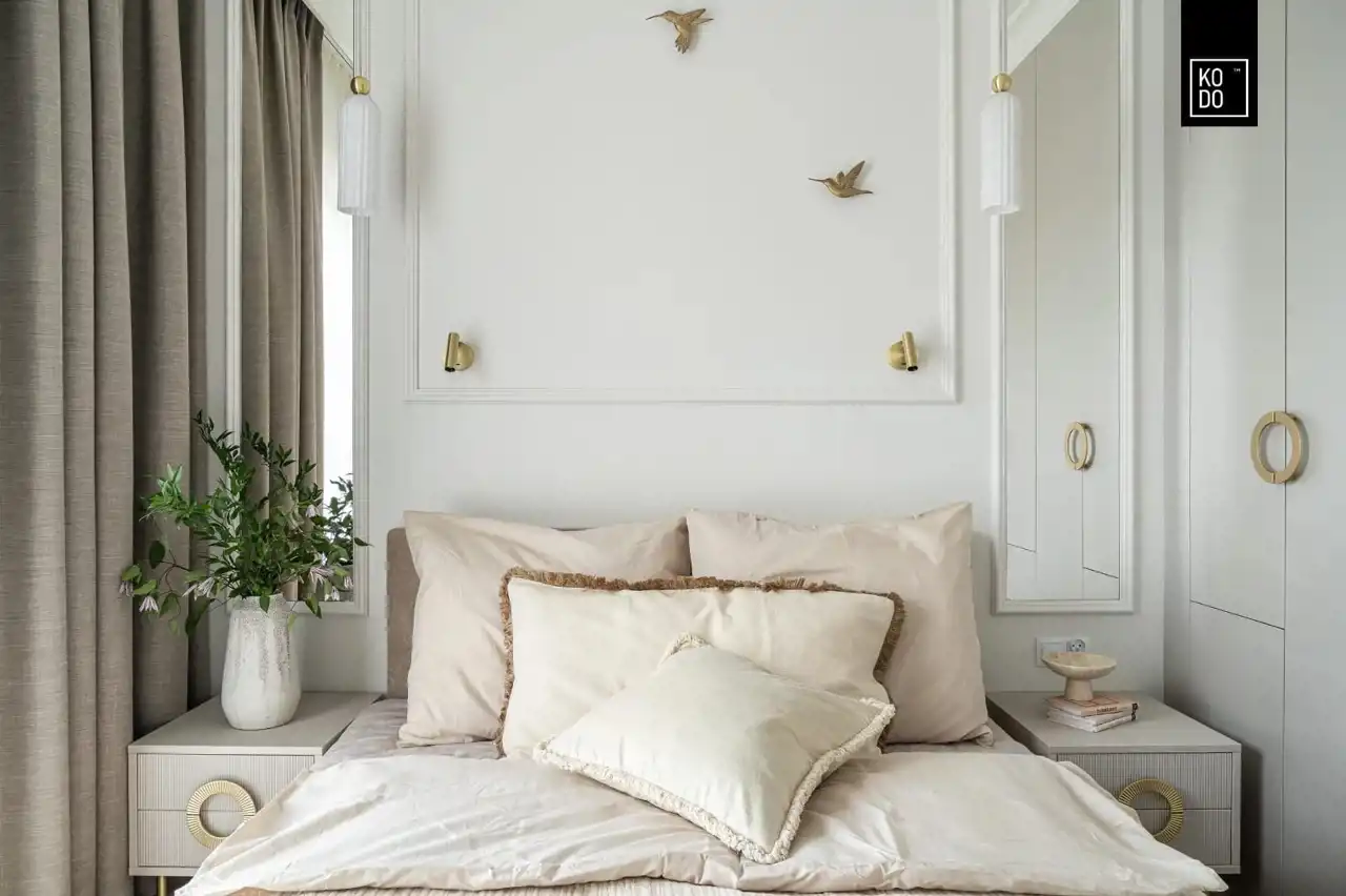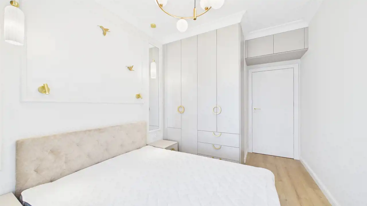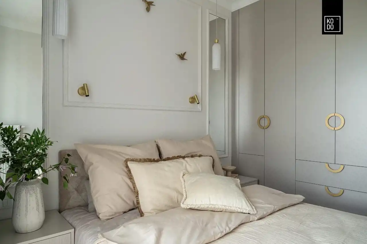 Komfortowa sypialnia urządzona w klasycznym stylu, z dużym łóżkiem, miękkimi tekstyliami oraz dekoracyjnymi detalami. Pojemne zabudowy zapewniają wygodne przechowywanie.