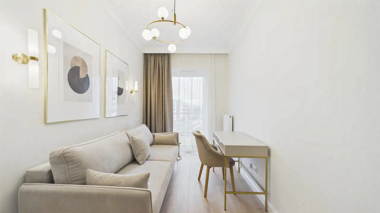 Wnętrze zostało zaprojektowane z dbałością o detale i wykończone w wysokim standardzie, z wykorzystaniem trwałych, odpornych na użytkowanie materiałów. Elegancką bazę stanowią ciepłe, kaszmirowe beże i szarości, przełamane czernią oraz złotymi akcentami.