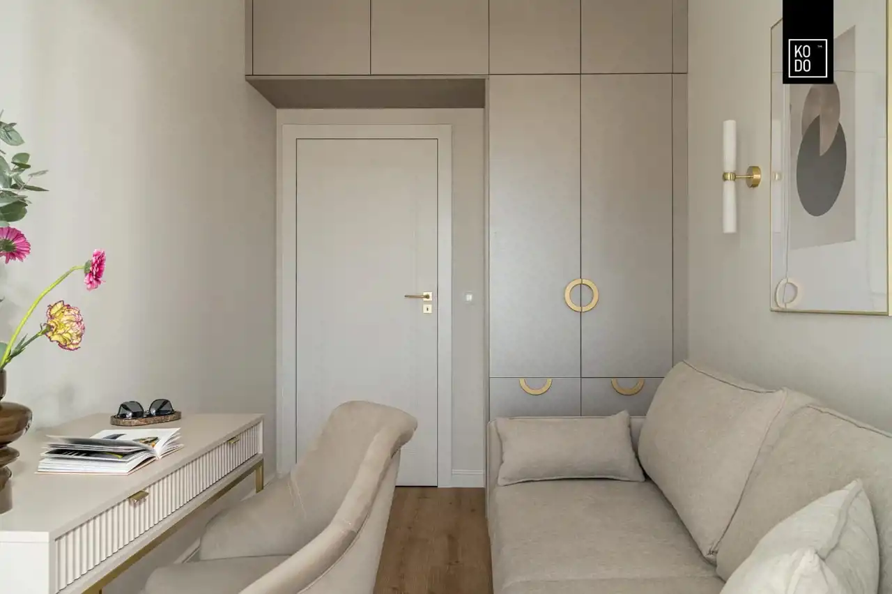 Dodatkowe pomieszczenie pełniące funkcję domowego biura lub pokoju gościnnego, również wyposażone jest w zabudowę meblową.