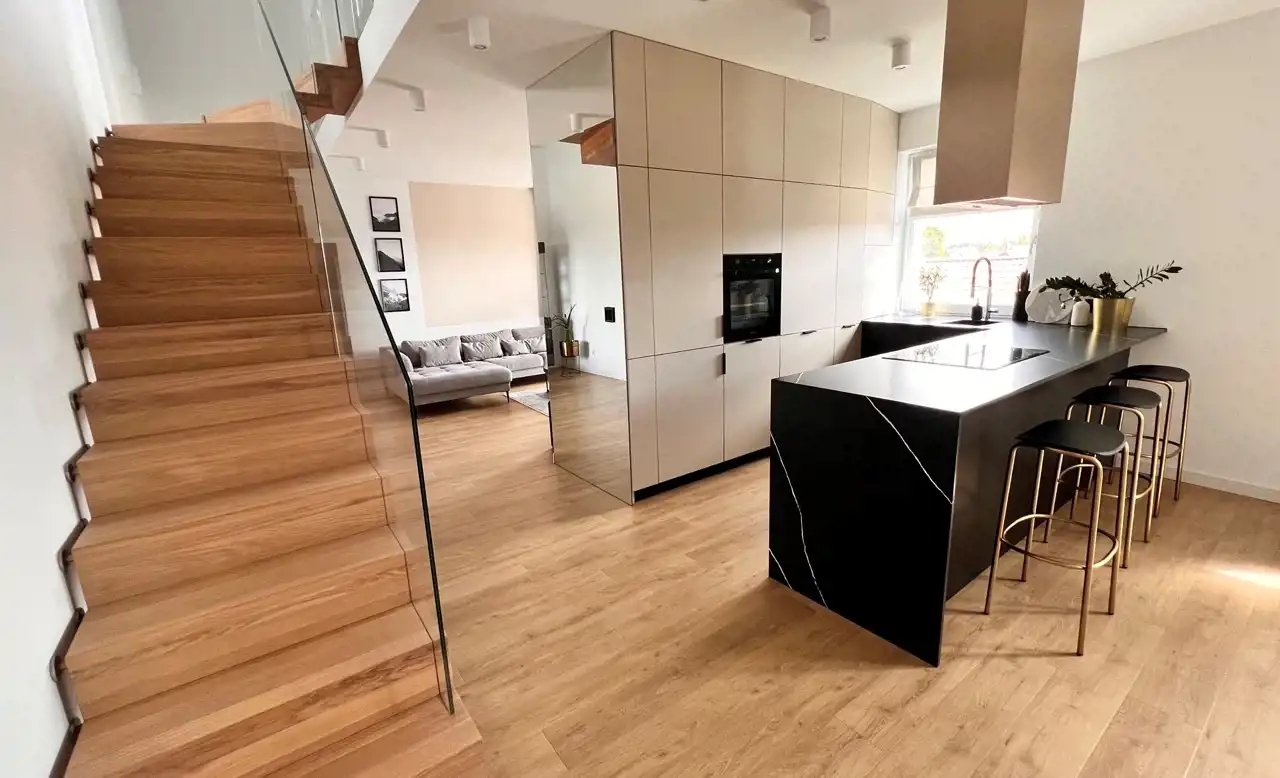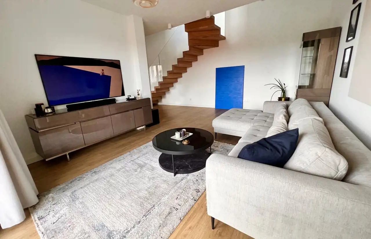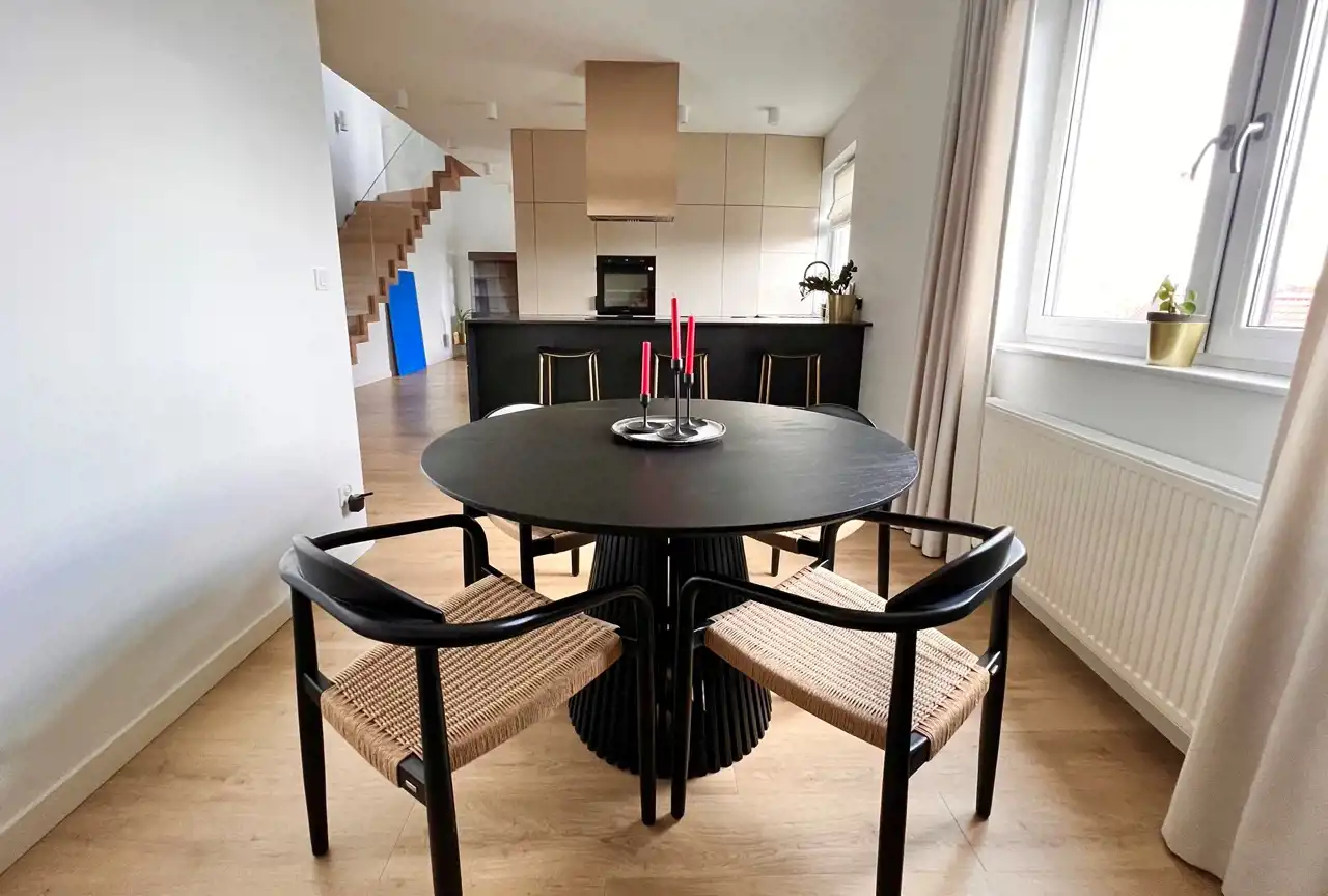 Na pierwszym poziomie znajduje się: pokój dzienny z wygodną kanapą i telewizorem Samsung Frame, w pełni wyposażona kuchnia z meblami w zabudowie i wysokiej klasy sprzętem AGD (lodówko zamrażarka, piekarnik, płyta indukcyjna, zmywarka, ekspres do kawy, pralka, małe agd), jadalnia ze stołem i krzesłami, łazienka z wanną. Z pokoju dziennego wyjście na balkon.