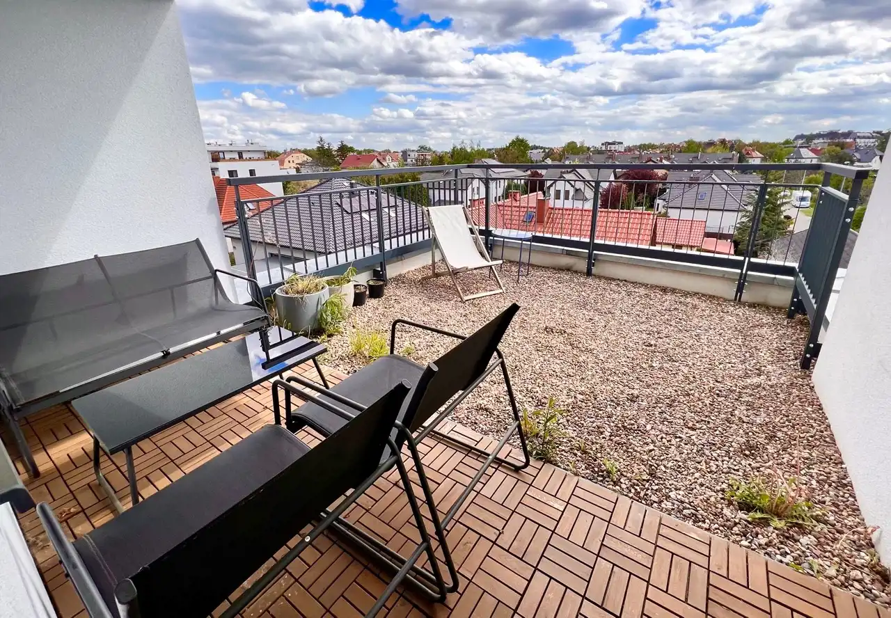 Do wynajęcia komfortowy 2-poziomowy apartament z tarasem, balkonem i miejscem postojowym w garażu podziemnym, położony przy ul. Kabaczkowej (Osiedle Oporów - Krzyki).